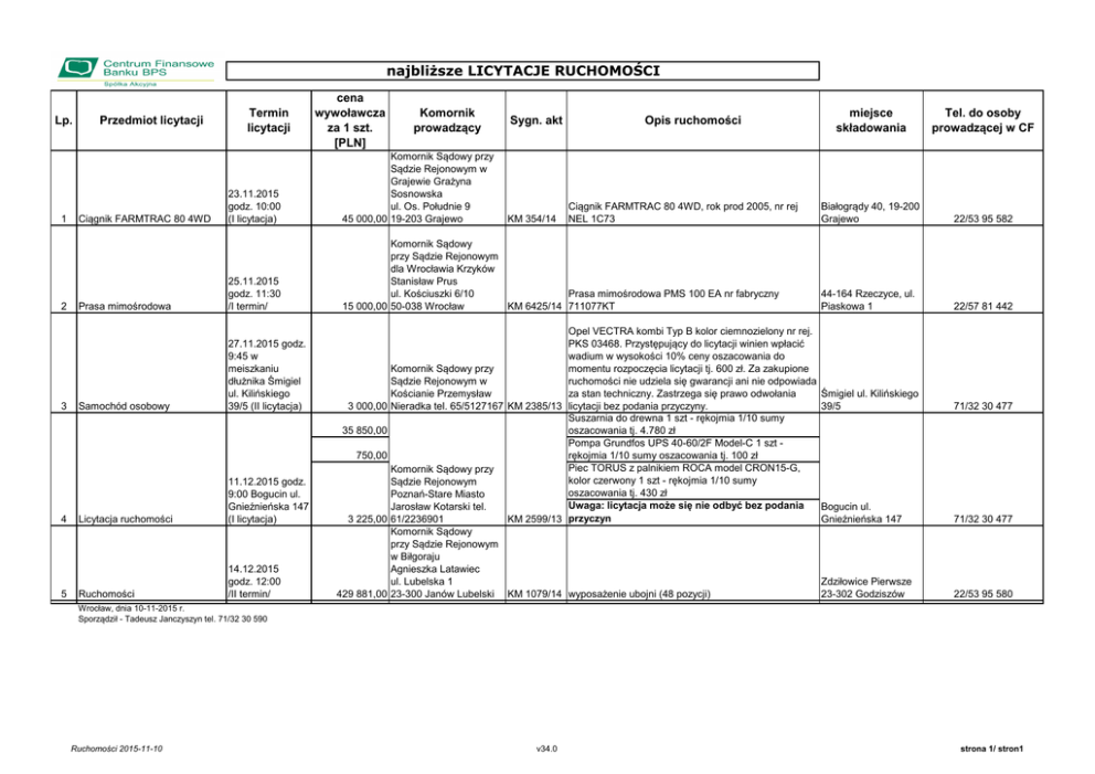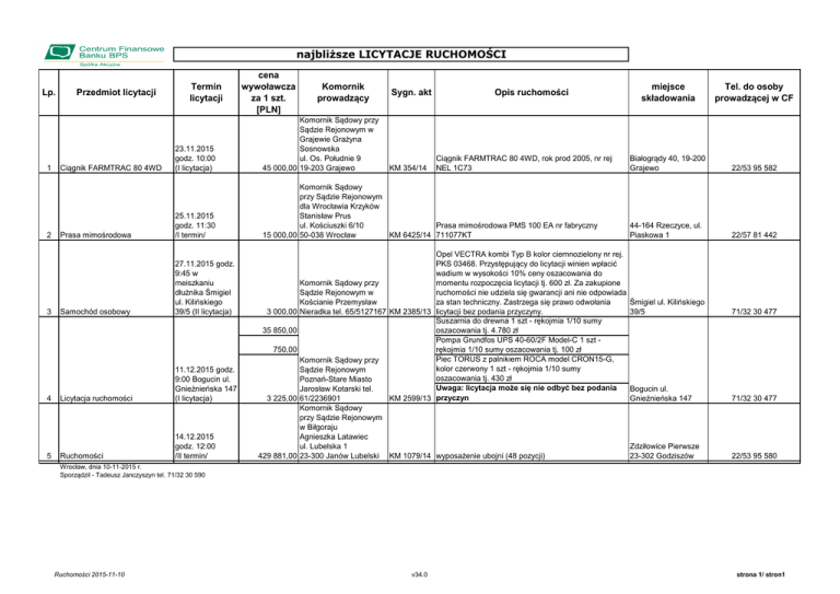 najbliższe LICYTACJE RUCHOMOŚCI Lp. 1 2 3 Przedmiot licytacji Termin licytacji cena wywoławcza za 1 szt. [PLN] Opis ruchomości 23.11.2015 godz. 10:00 (I licytacja) Prasa mimośrodowa 25.11.2015 godz. 11:30 /I termin/ Komornik Sądowy przy Sądzie Rejonowym dla Wrocławia Krzyków Stanisław Prus ul. Kościuszki 6/10 Prasa mimośrodowa PMS 100 EA nr fabryczny 15 000,00 50-038 Wrocław KM 6425/14 711077KT Samochód osobowy 27.11.2015 godz. 9:45 w meiszkaniu dłużnika Śmigiel ul. Kilińskiego 39/5 (II licytacja) Ciągnik FARMTRAC 80 4WD 3 000,00 750,00 5 Sygn. akt Komornik Sądowy przy Sądzie Rejonowym w Grajewie Grażyna Sosnowska ul. Os. Południe 9 45 000,00 19-203 Grajewo 35 850,00 4 Komornik prowadzący Licytacja ruchomości 11.12.2015 godz. 9:00 Bogucin ul. Gnieźnieńska 147 (I licytacja) Ruchomości 14.12.2015 godz. 12:00 /II termin/ 3 225,00 429 881,00 KM 354/14 Ciągnik FARMTRAC 80 4WD, rok prod 2005, nr rej NEL 1C73 Opel VECTRA kombi Typ B kolor ciemnozielony nr rej. PKS 03468. Przystępujący do licytacji winien wpłacić wadium w wysokości 10% ceny oszacowania do Komornik Sądowy przy momentu rozpoczęcia licytacji tj. 600 zł. Za zakupione Sądzie Rejonowym w ruchomości nie udziela się gwarancji ani nie odpowiada Kościanie Przemysław za stan techniczny. Zastrzega się prawo odwołania Nieradka tel. 65/5127167 KM 2385/13 licytacji bez podania przyczyny. Suszarnia do drewna 1 szt - rękojmia 1/10 sumy oszacowania tj. 4.780 zł Pompa Grundfos UPS 40-60/2F Model-C 1 szt rękojmia 1/10 sumy oszacowania tj. 100 zł Piec TORUS z palnikiem ROCA model CRON15-G, Komornik Sądowy przy kolor czerwony 1 szt - rękojmia 1/10 sumy Sądzie Rejonowym oszacowania tj. 430 zł Poznań-Stare Miasto Uwaga: licytacja może się nie odbyć bez podania Jarosław Kotarski tel. 61/2236901 KM 2599/13 przyczyn Komornik Sądowy przy Sądzie Rejonowym w Biłgoraju Agnieszka Latawiec ul. Lubelska 1 23-300 Janów Lubelski KM 1079/14 wyposażenie ubojni (48 pozycji) miejsce składowania Tel. do osoby prowadzącej w CF Białogrądy 40, 19-200 Grajewo 22/53 95 582 44-164 Rzeczyce, ul. Piaskowa 1 22/57 81 442 Śmigiel ul. Kilińskiego 39/5 71/32 30 477 Bogucin ul. Gnieźnieńska 147 71/32 30 477 Zdziłowice Pierwsze 23-302 Godziszów 22/53 95 580 Wrocław, dnia 10-11-2015 r. Sporządził - Tadeusz Janczyszyn tel. 71/32 30 590 Ruchomości 2015-11-10 v34.0 strona 1/ stron1