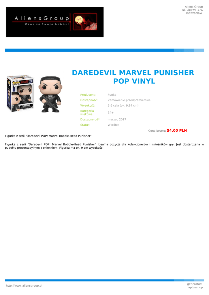 Aliens Group ul. Lipowa 17C Inowrocław DAREDEVIL MARVEL PUNISHER POP VINYL Producent: Funko Dostępność: Zamówienie przedpremierowe Wysokość: 3.6 cala (ok. 9,14 cm) Kategoria wiekowa: 14+ Dostępny od*: marzec 2017 Status: Wkrótce Cena brutto: 54,00 PLN Figurka z serii "Daredevil POP! Marvel Bobble-Head Punisher" Figurka z serii "Daredevil POP! Marvel Bobble-Head Punisher" Idealna pozycja dla kolekcjonerów i miłośników gry. Jest dostarczana w pudełku prezentacyjnym z okienkiem. Figurka ma ok. 9 cm wysokości http://www.aliensgroup.pl generator: aptusshop