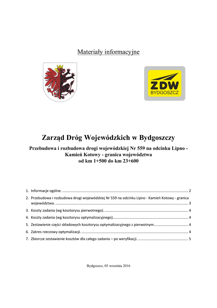 Materiały informacyjne Zarząd Dróg Wojewódzkich w Bydgoszczy Przebudowa i rozbudowa drogi wojewódzkiej Nr 559 na odcinku Lipno Kamień Kotowy - granica województwa od km 1+500 do km 23+600 1. Informacje ogólne. ............................................................................................................................. 2 2. Przebudowa i rozbudowa drogi wojewódzkiej Nr 559 na odcinku Lipno - Kamień Kotowy - granica województwa. .................................................................................................................................... 3 3. Koszty zadania (wg kosztorysu pierwotnego). ................................................................................... 4 4. Koszty zadania (wg kosztorysu optymalizacyjnego)........................................................................... 4 5. Zestawienie części składowych kosztorysu optymalizacyjnego z pierwotnym. ................................. 4 6. Zakres rzeczowy optymalizacji. .......................................................................................................... 4 7. Zbiorcze zestawienie kosztów dla całego zadania – po weryfikacji. .................................................. 5 Bydgoszcz, 05 września 2016 1. Informacje ogólne. Projekt Kujawsko-Pomorskiego Planu Spójności Komunikacji Drogowej i Kolejowej - umiejscowienie rozbudowy drogi wojewódzkiej nr 559 na odcinku od m. Lipno do granicy województwa kujawsko- Lokalizacja Lp. Pikietaż Numer drogi Długość [km] Początkowy Szacunkowy koszt zadania [mln zł] Planowany okres realizacji Okres realizacji wg WPF na lata 2016 – 2038 Końcowy Grupa – 1 w ramach RPO WK-P 1.1. 548 1.2. 240 1.3. 1.4. 266 254 1.5. 251 1.6. 1.7. 1.8. 1.9. 1.10. 559 254 265 534 270 1.11. 269 1.12. 1.13. 1.14. 255 563 241 0,005 15,146 23,190 62,877 0,000 0,069 19,649 34,590 1,500 22,400 0,003 76,705 0,000 12,170 33,622 0,005 2,475 0,005 Razem grupa 1 14,144 29,619 36,817 65,718 57,509 22,400 34,200 35,290 23,600 53,814 19,117 81,719 29,023 28,898 59,194 21,910 16,656 26,360 28,612 100,0 2016 – 2019 16,468 25,0 2016 – 2019 57,509 22,331 50,0 50,0 2018 – 2020 2018 – 2021 15,251 35,0 2016 – 2019 22,100 31,414 19,114 5,014 29,023 40,0 45,0 32,0 10,0 50,0 2016 – 2019 2018 – 2021 2017 – 2020 2018 – 2020 2017 – 2020 42,300 60,0 2017 – 2020 21,905 14,181 26,355 30,0 25,0 45,0 2016 – 2019 2018 – 2020 2016 - 2019 351,577 597,0 2016-2023 pomorskiego. Na podst. Tab.21. Wykaz przedsięwzięć drogowych przewidzianych do realizacji w latach 2014-2023 • Długość DW 559 do realizacji – 22,100 km • Wartość realizacji wg. projektu Kujawsko-Pomorskiego Planu Spójności Komunikacji Drogowej i Kolejowej oraz Wieloletniej Prognozy Finansowej na lata 2016 - 2038 – 40 mln zł. 2 2. Przebudowa i rozbudowa drogi wojewódzkiej Nr 559 na odcinku Lipno - Kamień Kotowy granica województwa. Długość odcinka: 22,100 km Wykonawca projektu: Robimart Sp. z o.o. Okres przygotowania projektu: 2010 - 2014 Stan realizacji: gotowe do realizacji Decyzja Nr 5/ZRID/2014 z dn. 20.06.2014 r. Proponowane lata realizacji: 2016 - 2019 Poniesiony koszt dokumentacji: 840 964 zł Wybrane parametry techniczne: • szerokość jezdni 7,00 m, • obustronna opaska bitumiczna – szerokości 0,5 m, • obustronne pobocza gruntowe - szerokość 1,5 m, • wzmocnienie istniejącej nawierzchni do nośności 100 kN/oś, • budowa ronda na skrzyżowaniu DW 559 i DW 541, • przebudowa i rozbudowa skrzyżowań z drogami powiatowymi na skrzyżowania skanalizowane w ilości 6 szt. • budowa ciągów pieszo-rowerowych i chodników, łącznej długości 13,626 km, • budowa miejsca do kontroli i ważenia pojazdów na skrzyżowaniu DW 559 i DW 541, • budowa miejsca dla stacji meteorologicznej – w km 21+771,98 (Kamień Kotowy). Lokalizacja zadania: Inwestycja zlokalizowana jest w południowo-wschodniej części województwa w powiecie lipnowskim, m. Lipno oraz gminy: Lipno (9,5 km), Skępe (2 km), Wielgie (1,5 km), Tłuchowo (9,1 km). Na rozpatrywanym odcinku droga przebiega głównie przez tereny użytkowane rolniczo oraz przez tereny miejscowości: Głodowo, Suradówek, Jasień, Kamień Kotowy. Charakterystyka: Droga wojewódzka Nr 559 Lipno – Płock stanowi połączenie drogi krajowej Nr 10 w m. Lipno z drogą krajową Nr 60 w m. Płock, stanowi zatem alternatywę dla połączenia drogowego Bydgoszcz – Toruń – Warszawa. Na przedmiotowym odcinku szerokość istniejącej jezdni wynosi 6 m z obustronnymi poboczami gruntowymi szer. 1,0 - 1,5m. Stan techniczny drogi jest zły. Ze względu na fatalny stan podbudowy, istnieje wysokie prawdopodobieństwo utraty nośności drogi i wystąpienia przełomów drogowych. Przeprowadzone odwierty wykazały, że konstrukcja nawierzchni nie jest w stanie przenosić ruchu o nacisku do 8 t/oś, który jest obecnie dopuszczony na drodze. 3 3. Koszty zadania (wg kosztorysu pierwotnego). Przebudowa i rozbudowa drogi wojewódzkiej nr 559 na odcinku Lipno - Kamień Kotowy - granica województwa, od km 1+500 do km 23+600. Długość 22,100 km Lp. Element rozliczeniowy kosztorysu Wartość robót (brutto) Wartość % kwoty ogółem 1 Roboty drogowe 120 447 277 85,9% 140 263 937 100,0% Łącznie wszystkie branże * 2 *(zieleń, Suma (brutto) roboty ziemne, odwodnienie, roboty mostowe, branża drogowa itp.) 4. Koszty zadania (wg kosztorysu optymalizacyjnego). Przebudowa i rozbudowa drogi wojewódzkiej nr 559 na odcinku Lipno - Kamień Kotowy - granica województwa, od km 1+500 do km 23+600. Długość 22,100 km Suma (brutto) 94 020 035,00 100,0% 5. Zestawienie części składowych kosztorysu optymalizacyjnego z pierwotnym. Przebudowa i rozbudowa drogi wojewódzkiej nr 559 na odcinku Lipno - Kamień Kotowy granica województwa, od km 1+500 do km 23+600. Długość 22,100 km Lp. Kosztorys Data opracowania Kwota netto Kwota brutto 1 Kosztorys Inwestorski - pierwotny czerwiec 2014r. 114 035 721,14 zł 140