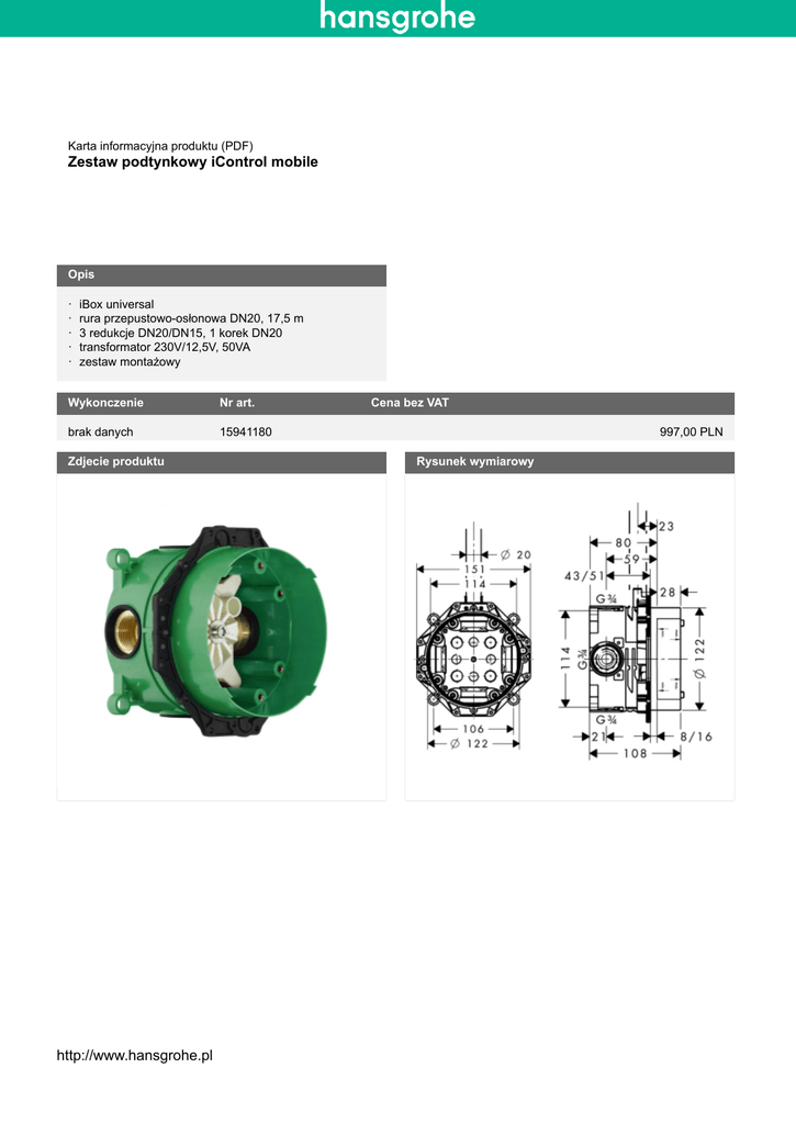 Karta informacyjna produktu (PDF) Zestaw podtynkowy iControl mobile Opis · · · · · iBox universal rura przepustowo-osłonowa DN20, 17,5 m 3 redukcje DN20/DN15, 1 korek DN20 transformator 230V/12,5V, 50VA zestaw montażowy Wykonczenie Nr art. brak danych 15941180 Zdjecie produktu http://www.hansgrohe.pl Cena bez VAT 997,00 PLN Rysunek wymiarowy
