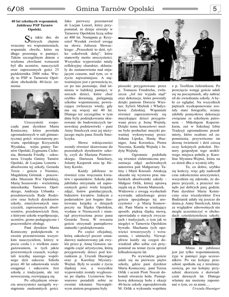 Gmina Tarnow Opolski 6 08 40 lat szkolnych wspomnieñ. Jubileusz PSP Tarnów Opolski. S ¹ takie dni, do których chêtnie wracamy we wspomnieniach, wspania³e chwile, które na d³ugo pozostaj¹ w pamiêci. Takim szczególnym dniem z wieloma chwilami wzruszeñ by³ dla uczniów, nauczycieli oraz zaproszonych goœci 25 paŸdziernika 2008 roku. Wtedy to PSP w Tarnowie Opolskim obchodzi³a 40-lecie istnienia. Uroczystoœæ rozpoczê³a pani dyrektor Maria Konieczny, która powita³a zgromadzonych w sali gimnastycznej goœci: wicestarostê powiatu opolskiego Krzysztofa Wysdaka, wójta gminy Tarnów Opolski Zygmunta Cichonia, Bernarda Friedlê – sekretarza Urzêdu Gminy Tarnów Opolski, dr Lucjana Lenorta absolwenta tej szko³y, Gerarda Torza - goœcia z Niemiec, Magdalenê Górniak – pracownika Muzeum Wsi Opolskiej, Mariê Sosnowski - wieloletni¹ mieszkankê Tarnowa Opolskiego, Andrzeja Urbanka – przedstawiciela Rady Rodziców oraz by³ych dyrektorów szko³y, emerytowanych nauczycieli, zaproszonych absolwentów, przedstawicieli firm, z którymi szko³a wspó³pracuje, uczniów, grono pedagogiczne i pracowników obs³ugi. Pani dyrektor Maria Konieczny podziêkowa³a w swoim przemówieniu wszystkim nauczycielom, którzy w pocie czo³a i z wielkim zaanga¿owaniem, w tych jak¿e przewrotnych czasach, wydeptali œcie¿kê naszego wspólnego dziœ sukcesu. Szko³a przez 40 lat odnotowa³a wiele osi¹gniêæ i sukcesów. Jest szko³¹ z tradycjami, ale te¿ nowoczesn¹, rozwijaj¹c¹ siê. Po oficjalnym otwarciu uroczystoœci nast¹pi³y wyst¹pienia znakomitych goœci. Jako pierwszy przemawia³ dr Lucjan Lenort, który przypomnia³, ¿e dzieje oœwiaty w Tarnowie Opolskim licz¹ sobie a¿ 400 lat. Nastêpnie p. Krzysztof Wysdak zwróci³ uwagê na s³owa Juliusza S³owackiego: „Przesz³oœæ to dziœ, tylko cokolwiek dalej”, które stanowi³y motto uroczystoœci. Wszystkie wypowiedzi mia³y refleksyjny charakter, sk³ania³y do zastanowienia nad mijaj¹cym czasem, nad tym, co w ¿yciu najwa¿niejsze. A najwa¿niejsze jest z pewnoœci¹ to, co po nas pozostaje, œlad istnienia w ludzkiej pamiêci, w sercach dzieci, które choæ szybko dorastaj¹, pielêgnuj¹ szkolne wspomnienia, powracaj¹ce zw³aszcza wtedy, gdy ma siê wiêcej ni¿ 40 lat. Dlatego te¿ szczególne w tym dniu by³y podziêkowania skierowane do budowniczych tarnowskiej podstawówki - pani Anny Smolczyk oraz jej nie¿yjacego mê¿a pana Józefa Smolczyka. S³owa wdziêcznoœci zosta³y równie¿ skierowane do pozosta³ych dyrektorów szko³y, czyli do Mariana Piotrowskiego, Dariusza Œmichury, Jolanty Kasperek oraz œp. Heleny Kawki. Ka¿dy jubileusz to równie¿ czas wrêczania kwiatów i upominków. Szko³a jako jubilatka otrzyma³a od zaproszonych goœci wiele ksi¹¿ek, zdjêæ, listów gratulacyjnych, bukietów kwiatów. Jednym z podarunków jest bogato ilustrowana ksi¹¿ka o dziejach poczty na Œl¹sku Opolskim, wydana w Niemczech i stamt¹d przywieziona przez pana Gerarda Torza. W rewan¿u goœcie otrzymali pami¹tkowe statuetki i podziêkowania. Po czêœci oficjalnej, któr¹ zakoñczy³ poczet sztandarowy nadzorowany jak zwykle przez p. Annê Gonsior, nast¹pi³a czêœæ artystyczna, któr¹ przygotowa³y dzieci pod kierunkiem p. Urszuli Hueniger oraz p. Karoliny MysiuryWojtuœ. By³y to scenki z ¿ycia œl¹skiej wsi, a wszystkie wypowiedzi zosta³y wyg³oszone po œl¹sku. Uczniowie brawurowo poradzili sobie ze swoimi tekstami. Niew¹tpliwym atutem programu by³y piosenki przygotowane przez p. Tomasza Friedricha, zw³aszcza „Jo³ nie wyjada st¹d” oraz dekoracje, które powsta³y dziêki paniom Dorocie Wiesner, Sylwii Mielnik i W³adys³awie Zaleskiej. Wspaniale równie¿ zaprezentowa³y siê muzykuj¹ce dzieci przygotowane przez p. Irenê Wojtalê. Dziêki temu koncertowi mo¿na by³o pos³uchaæ muzyki powa¿nej wykonywanej przez: Johena Lipoka, Haniê Hueniger, Jana Korzeñca, Piotra Noconia, Kamilê Wojtalê i Judytê Wojtalê. Ogromnie podoba³a siê równie¿ elektroniczna prezentacja zdjêæ archiwalnych autorstwa pañ Ma³gorzaty Tatiny i Marii Knosali. Atrakcj¹ okaza³a siê wystawa prac malarskich absolwentki szko³y Ma³gosi Orlik, której opraw¹ zajê³a siê p. Dorota Matuszek. Widzowie z uwag¹ wys³uchali wywiadu udzielonego przez goœcia specjalnego tej uroczystoœci – p. Mariê Sosnowski. Pani Maria w urzekaj¹cy sposób, piêkn¹ œl¹sk¹ mow¹, opowiada³a o starych zwyczajach i tradycjach, o tym jak to niegdyœ w Tarnowie Opolskim bywa³o. S³uchaniu tych opowieœci towarzyszy³y i wzruszenia, i uœmiechy. Niew¹tpliwie ka¿dy siê czegoœ dowiedzia³ albo sobie coœ przypomnia³ na temat ¿ycia sprzed kilkudziesiêciu lat. Po wywiadzie goœcie udali siê na pierwsze piêtro szko³y, gdzie pani dyrektor Maria Konieczny, pani Teresa Orlik i uczeñ Piotr Nocoñ dokonali otwarcia holu. Pami¹tkow¹ dekoracjê holu z okazji 40-lecia szko³y zaprojektowa³a M. Orlik a wykona³a wspólnie 5 z p. Teofilem Jafernikiem. Po przeciêciu wstêgi goœcie udali siê na poczêstunek, aby nabraæ si³ do zwiedzania szko³y. A by³o co ogl¹daæ. Na wszystkich piêtrach wyeksponowane zosta³y stare fotografie, œciany zdobi³y pomys³owe dekoracje zwi¹zane ze szkolnym patronem - Miko³ajem Kopernikiem, zaœ w Szkolnej Izbie Tradycji zgromadzono przedmioty, które ocalono od zapomnienia, przywrócono im dawn¹ œwietnoœæ i dziœ ciesz¹ oczy kolejnych pokoleñ. Honory gospodyni tego urokliwego miejsca pe³ni³a p. Karolina Mysiura-Wojtuœ, która na co dzieñ dba o wystrój izby. To, co dobre, szybko siê koñczy, wiêc gdy nadszed³ czas zakoñczenia uroczystoœci, wszystkim siê zdawa³o, ¿e dopiero przyszli, a przecie¿ minê³o ju¿ dobrych parê godzin. Pani dyrektor Maria Konieczny oraz wicedyrektor Ewa Budziarek uda³y siê jeszcze do domu p. Anny Smolczyk, która ze wzglêdów zdrowotnych nie mog³a uczestniczyæ w obchodach czterdziestolecia szko³y. Mimo ¿e jubileusz jest ju¿ ty