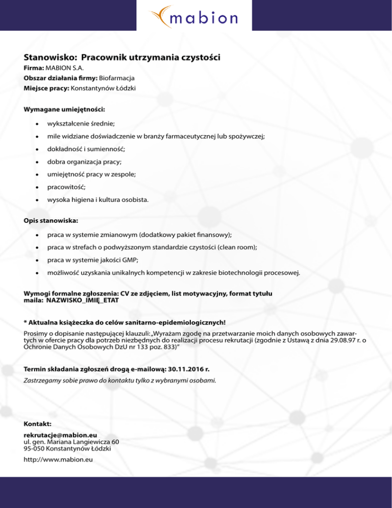 Stanowisko: Pracownik utrzymania czystości Firma: MABION S.A. Obszar działania firmy: Biofarmacja Miejsce pracy: Konstantynów Łódzki Wymagane umiejętności: • wykształcenie średnie; • mile widziane doświadczenie w branży farmaceutycznej lub spożywczej; • dokładność i sumienność; • dobra organizacja pracy; • umiejętność pracy w zespole; • pracowitość; • wysoka higiena i kultura osobista. Opis stanowiska: • praca w systemie zmianowym (dodatkowy pakiet finansowy); • praca w strefach o podwyższonym standardzie czystości (clean room); • praca w systemie jakości GMP; • możliwość uzyskania unikalnych kompetencji w zakresie biotechnologii procesowej. Wymogi formalne zgłoszenia: CV ze zdjęciem, list motywacyjny, format tytułu maila: NAZWISKO_IMIĘ_ETAT * Aktualna książeczka do celów sanitarno-epidemiologicznych! Prosimy o dopisanie następującej klauzuli: „Wyrażam zgodę na przetwarzanie moich danych osobowych zawartych w ofercie pracy dla potrzeb niezbędnych do realizacji procesu rekrutacji (zgodnie z Ustawą z dnia 29.08.97 r. o Ochronie Danych Osobowych DzU nr 133 poz. 833)” Termin składania zgłoszeń drogą e-mailową: 30.11.2016 r. Zastrzegamy sobie prawo do kontaktu tylko z wybranymi osobami. Kontakt: [email protected] ul. gen. Mariana Langiewicza 60 95-050 Konstantynów Łódzki http://www.mabion.eu