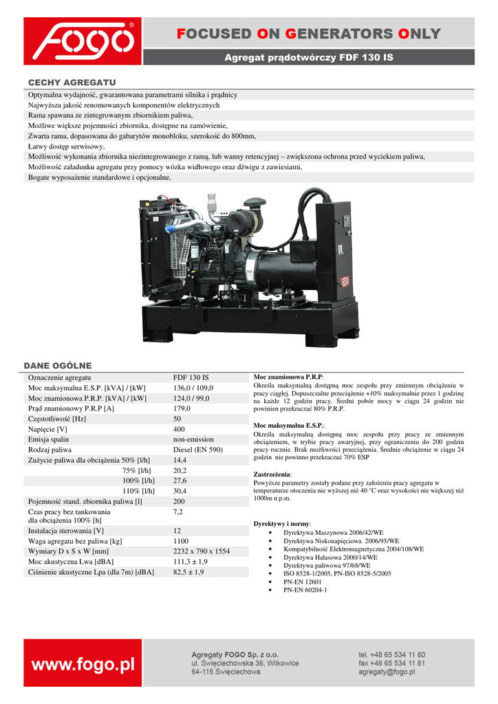Agregat prądotwórczy FDF 130 IS CECHY AGREGATU Optymalna wydajność, gwarantowana parametrami silnika i prądnicy Najwyższa jakość renomowanych komponentów elektrycznych Rama spawana ze zintegrowanym zbiornikiem paliwa, Możliwe większe pojemności zbiornika, dostępne na zamówienie, Zwarta rama, dopasowana do gabarytów monobloku, szerokość do 800mm, Łatwy dostęp serwisowy, Możliwość wykonania zbiornika niezintegrowanego z ramą, lub wanny retencyjnej – zwiększona ochrona przed wyciekiem paliwa, Możliwość załadunku agregatu przy pomocy wózka widłowego oraz dźwigu z zawiesiami, Bogate wyposażenie standardowe i opcjonalne, DANE OGÓLNE Oznaczenie agregatu Moc maksymalna E.S.P. [kVA] / [kW] Moc znamionowa P.R.P. [kVA] / [kW] Prąd znamionowy P.R.P [A] Częstotliwość [Hz] Napięcie [V] Emisja spalin Rodzaj paliwa Zużycie paliwa dla obciążenia 50% [l/h] 75% [l/h] 100% [l/h] 110% [l/h] Pojemność stand. zbiornika paliwa [l] Czas pracy bez tankowania dla obciążenia 100% [h] Instalacja sterowania [V] Waga agregatu bez paliwa [kg] Wymiary D x S x W [mm] Moc akustyczna Lwa [dBA] Ciśnienie akustyczne Lpa (dla 7m) [dBA] FDF 130 IS 136,0 / 109,0 124,0 / 99,0 179,0 50 400 non-emission Diesel (EN 590) 14,4 20,2 27,6 30,4 200 7,2 12 1100 2232 x 790 x 1554 111,3 ± 1,9 82,5 ± 1,9 Moc znamionowa P.R.P: Określa maksymalną dostępną moc zespołu przy zmiennym obciążeniu w pracy ciągłej. Dopuszczalne przeciążenie +10% maksymalnie przez 1 godzinę na każde 12 godzin pracy. Średni pobór mocy w ciągu 24 godzin nie powinien przekraczać 80% P.R.P. Moc maksymalna E.S.P.: Określa maksymalną dostępną moc zespołu przy pracy ze zmiennym obciążeniem, w trybie pracy awaryjnej, przy ograniczeniu do 200 godzin pracy rocznie. Brak możliwości przeciążenia. Średnie obciążenie w ciągu 24 godzin nie powinno przekraczać 70% ESP Zastrzeżenia: Powyższe parametry zostały podane przy założeniu pracy agregatu w temperaturze otoczenia nie wyższej niż 40 °C oraz wysokości nie większej niż 1000m n.p.m. Dyrektywy i normy: • Dyrektywa Maszynowa 2006/42/WE • Dyrektywa Niskonapięciowa 2006/95/WE • Kompatybilność Elektromagnetyczna 2004/108/WE • Dyrektywa Hałasowa 2000/14/WE • Dyrektywa paliwowa 97/68/WE • ISO 8528-1/2005, PN-ISO 8528-5/2005 • PN-EN 12601 • PN-EN 60204-1 Agregat prądotwórczy FDF 130 IS STEROWNIK STANDARD Typ sterownika: AMF25 Intuicyjny interfejs graficzny Możliwość zarządzania układem SZR Dziennik zdarzeń: do 119 pozycji, zapis kompletnej historii Pomiar wartości prądu w 3 fazach Pomiar wartości napięć fazowych i przewodowych po stronie agregatu oraz sieci Pomiar mocy czynnej, biernej i pozornej Licznik energii czynnej i biernej Licznik czasu pracy Pomiar napięcia akumulatora Pomiar poziomu paliwa Zegar czasu rzeczywistego Ochrona generatora (częstotliwość, napięcie, asymetria) Komunikacja RS 232 (wymagany moduł IL-NT RS232 lub IL-NT RS232-485) Komunikacja RS 485 Modbus (wymagany moduł IL-NT RS232-485) Bezpośrednia komunikacja z silnikami po magistrali CAN, odczyt i wyświetlanie parametrów z modułu ECU Obsługa zdalna przez GPRS (wymagany moduł IL-NT GPRS) Obsługa zdalna przez Internet (wymagany moduł IB-Lite) Darmowy system InteliMonitor do podglądu parametrów agregatów lub WebSupervisor do zarządzania flotą urządzeń Darmowa aplikacja WebSupervisor dla Android lub iOS do podglądu floty agregatów Wysyłanie powiadomień o błędach poprzez SMS lub e-mail (wymagany moduł IL-NT GPRS lub IB-Lite SILNIK Producent silnika Typ silnika Kraj produkcji Moc silnika netto [kW] Emisja spalin* Obroty [obr/min] Regulacja obrotów Klasa wykonania** Pojemność silnika [l] Liczba cylindrów Instalacja [V] Pojemność cieczy chłodzącej [l] Pojemność miski olejowej [l] Rodzaj paliwa * PRĄDNICA Iveco NEF45TM3 Włochy 107,2 non-emission 1500 mechaniczna G2 4,5 4 12 18,5 12,8 Diesel (EN 590) Zgodnie z Dyrektywą 97/68/WE dotyczącą ograniczenia emisji zanieczyszczeń gazowych i pyłowych z silników spalinowych, montowanych w maszynach samojezdnych, nieporuszających się po drogach. ** Zgodnie z normą PN-ISO 8528-5/1997 Producent prądnicy Typ prądnicy Kraj produkcji Moc prądnicy (40 ºC, 1000m n.p.m.) [kVA] Moc prądnicy (27 ºC, 1000m n.p.m.) [kVA] Sprawność prądnicy [%] Stabilizacja napięcia Poziom stabilizacji napięcia [%] Ochrona Klasa izolacji Odkształcenia harmoniczne prądu THD [%] Reaktancja Xd’’ [%] * Sincro* SK225LS Chorwacja 125,0 138,0 92,3 AVR cyfrowy +/- 0,5 IP 23 H < 2,5 10,6 Możliwość zabudowy prądnicy firmy STAMFORD lub innej, wskazanej przez klienta. Dane znamionowe agregatu mogą w takim przypadku ulec zmianie. Agregat prądotwórczy FDF 130 IS WYPOSAŻENIE STANDARDOWE Silnik Iveco NEF45TM3 Presostat niskiego ciśnienia oleju Termostat wysokiej temperatury silnika Grzałka silnika z termostatem Olej silnikowy Shell Rimula R4L Filtr paliwa z separatorem wody Płyn chłodzący Anti Freeze Akumulator rozruchowy 100 Ah Ładowarka akumulatora Prądnica Sincro SK225LS Cyfrowy 3 fazowy AVR Wyłącznik agregatu Schneider NSX 250 3P Mic.2.2 Cewka wzrostowa wyłącznika generatora Sterownik AMF25 Wyłącznik sterownika Sygnalizator dźwiękowy awarii Przycisk awaryjnego zatrzymania Rama całkowicie spawana z wanną retencyjną Pomiar poziomu paliwa Wibroizolatory drgań silnika i prądnicy Tłumik spalin z kompensatorem drgań Uchwyty załadunkowe WYPOSAŻENIE I USŁUGI OPCJONALNE Prądnica z systemem PMG Wyłącznik agregatu 4P Schneider NSX Micrologic 2.2 Ręczna pompa do spustu oleju Ręczna pompa spustu paliwa oraz retencji Elektroniczny regulator obrotów Pomiar ciśnienia oleju Pomiar temperatury silnika Czujnik wycieku w przestrzeni retencyjnej Niestandardowy zbiornik paliwa* Dodatkowy zbiornik paliwa 1 000 – 10 000 l Układ uzupełniania paliwa w zbiorniku agregatu Odłącznik akumulatora Odbiór mocy – złącza typu Power Lock Szafka odbioru mocy z gniazdami* Ukł