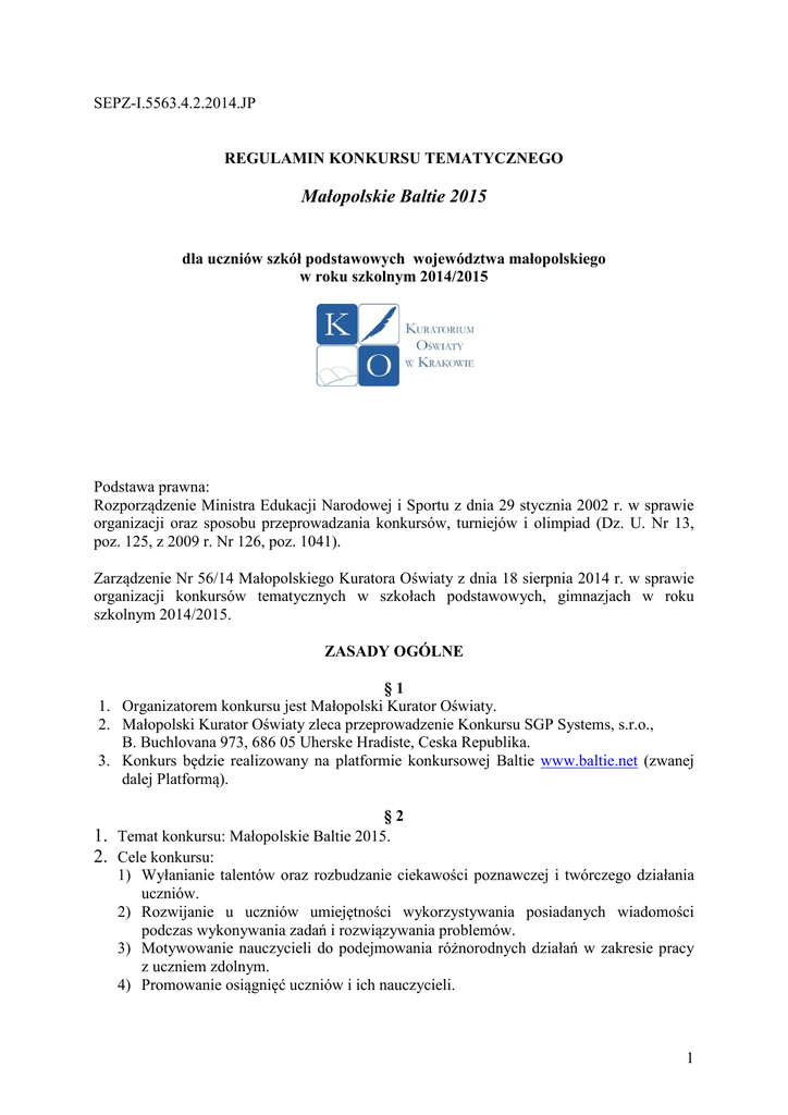 SEPZ-I.5563.4.2.2014.JP REGULAMIN KONKURSU TEMATYCZNEGO Małopolskie Baltie 2015 dla uczniów szkół podstawowych województwa małopolskiego w roku szkolnym 2014/2015 Podstawa prawna: Rozporządzenie Ministra Edukacji Narodowej i Sportu z dnia 29 stycznia 2002 r. w sprawie organizacji oraz sposobu przeprowadzania konkursów, turniejów i olimpiad (Dz. U. Nr 13, poz. 125, z 2009 r. Nr 126, poz. 1041). Zarządzenie Nr 56/14 Małopolskiego Kuratora Oświaty z dnia 18 sierpnia 2014 r. w sprawie organizacji konkursów tematycznych w szkołach podstawowych, gimnazjach w roku szkolnym 2014/2015. ZASADY OGÓLNE §1 1. Organizatorem konkursu jest Małopolski Kurator Oświaty. 2. Małopolski Kurator Oświaty zleca przeprowadzenie Konkursu SGP Systems, s.r.o., B. Buchlovana 973, 686 05 Uherske Hradiste, Ceska Republika. 3. Konkurs będzie realizowany na platformie konkursowej Baltie www.baltie.net (zwanej dalej Platformą). §2 1. Temat konkursu: Małopolskie Baltie 2015. 2. Cele konkursu: 1) Wyłanianie talentów oraz rozbudzanie ciekawości poznawczej i twórczego działania uczniów. 2) Rozwijanie u uczniów umiejętności wykorzystywania posiadanych wiadomości podczas wykonywania zadań i rozwiązywania problemów. 3) Motywowanie nauczycieli do podejmowania różnorodnych działań w zakresie pracy z uczniem zdolnym. 4) Promowanie osiągnięć uczniów i ich nauczycieli. 1 §3 Uczestnikami konkursu mogą być uczniowie klas IV-VI szkół podstawowych województwa małopolskiego, którzy dobrowolnie zadeklarują w nim swój udział. §4 1. Finaliści i laureaci konkursu otrzymają zaświadczenia Małopolskiego Kuratora Oświaty, które są ważne na terenie całego kraju. 2. Finaliści i laureaci uzyskają dodatkowe punkty podczas rekrutacji do wybranego publicznego gimnazjum w Małopolsce. Liczba punktów zostanie określona w Decyzji Małopolskiego Kuratora Oświaty w sprawie terminów rekrutacji na rok szkolny 2015/2016. 3. Laureaci konkursu otrzymają dyplomy. §5 1. Konkurs przeprowadza Wojewódzka Komisja Konkursowa powołana przez Małopolskiego Kuratora Oświaty na wniosek Prezesa SGP Systems, s.r.o., B. Buchlovana 873, 686 05 Uherske Hradiste, Ceska Republika. 2. Siedzibą Komisji Wojewódzkiej jest Kuratorium Oświaty w Krakowie, ul. Basztowa 22, 31-156 Kraków. §6 Informacje dotyczące organizacji, terminów, przebiegu i wyników konkursu będą przekazywane wyłącznie przez stronę internetową www.baltie.net oraz www.kuratorium.krakow.pl PRZEBIEG KONKURSU §7 1. Konkurs przeprowadzany jest w trzech etapach: 1) szkolnym; 2) rejonowym; 3) wojewódzkim. 2. Ramowy harmonogram przebiegu konkursu określa załącznik nr 1 do niniejszego Regulaminu. 3. W etapie szkolnym konkursu mogą brać udział wszyscy uczniowie zainteresowani konkursem. Organizatorzy konkursu umożliwiają udział w konkursie uczniom niepełnosprawnym w warunkach i formach dostosowanych do rodzaju ich niepełnosprawności na podstawie przedłożonego orzeczenia o potrzebie kształcenia specjalnego wydanego przez publiczną poradnię psychologiczno-pedagogiczną lub w przypadku niepełnosprawności czasowej zaświadczenia o stanie zdrowia wydanego przez lekarza. 4. W przypadku, gdy w szkole do której uczeń uczęszcza, etap szkolny konkursu nie jest organizowany, dyrektor szkoły jest zobowiązany umożliwić uczniowi udział w konkursie w innej szkole, w porozumieniu z dyrektorem tej szkoły. 5. Obowiązkiem dyrektora szkoły jest przekazanie uczniom, nauczycielom i rodzicom (prawnym opiekunom) informacji o zasadach przeprowadzania i Regulaminie konkursu oraz odebranie od rodziców podpisanego oświadczenia o akceptacji regulaminu i zgodzie 2 na publikowanie wyników na stronie konkursu stanowiącego załącznik nr 2 do niniejszego Regulaminu 6. Obowiązkiem uczniów jest przestrzeganie zasad określonych w Regulaminie i Instrukcji stanowiącej integralną część zestawu zadań konkursowych. 7. W czasie przeprowadzania poszczególnych etapów konkursu nie wolno wykonywać kopii zadań, a także nie wolno używać telefonów komórkowych, wykonywać zdjęć oraz filmów. 8. Zestawy zadań oraz kryteria oceniania do wszystkich etapów konkursu będą opracowane według określonych warunków przedstawionych autorom i zostaną dopuszczone do wykorzystania po uzyskaniu pozytywnej recenzji naukowej i metodycznej. 9. Przed rozpoczęciem pierwszego etapu konkursu uczniom, którzy jeszcze nie posiadają konta SGP nauczyciel musi założyć konto SGP na stronie www.sgpsys.pl. 10. Eliminacje konkursowe na wszystkich etapach będą przeprowadzane w formie elektronicznej przez Platformę. 11. Rozwiązania uczniów sprawdzane są automatycznie na Platformę (off-line lub on-line w zależności od etapu). 12. W etapie rejonowym konkursu może wziąć udział co najwyżej 600 uczestników konkursu, którzy uzyskali najwyższe miejsca w rankingu wojewódzkim po etapie szkolnym, W etapie wojewódzkim konkursu może wziąć udział co najwyżej 100 uczestników konkursu, którzy uzyskali najwyższe miejsca rankingu wojewódzkim po etapie rejonowym. 13. Tytuł laureata konkursu otrzymuje 20 uczestników konkursu, którzy uzyskali najwyższe miejsca w rankingu po etapie wojewódzkim. §8 1.Organizacja etapu szkolnego konkursu i nadzór nad jego przebiegiem spoczywa na dyrektorze szkoły, który: 1) powołuje szkolną komisję konkursową, w skład której wchodzi co najmniej dwóch nauczycieli, w tym nauczyciel zajęć komputerowych lub informatyki; 2) uzyskuje zgodę rodziców (prawnych opiekunów) uczniów biorących udział w konkursie na przetwarzanie do celów konkursu danych osobowych uczniów oraz uzyskuje ich potwierdzenie, że zapoznali się z Regulaminem i akceptują jego postanowienia, zgodnie z wzorem, stanowiącym załącznik nr 2 do niniejszego Regulaminu; 3) zapewnia opiekę uczniom uczestniczącym w etapie szkolnym w innej szkole, jeżeli w szkole, którą kieruje nie jest organizowany etap szkolny konkursu; 4) za
