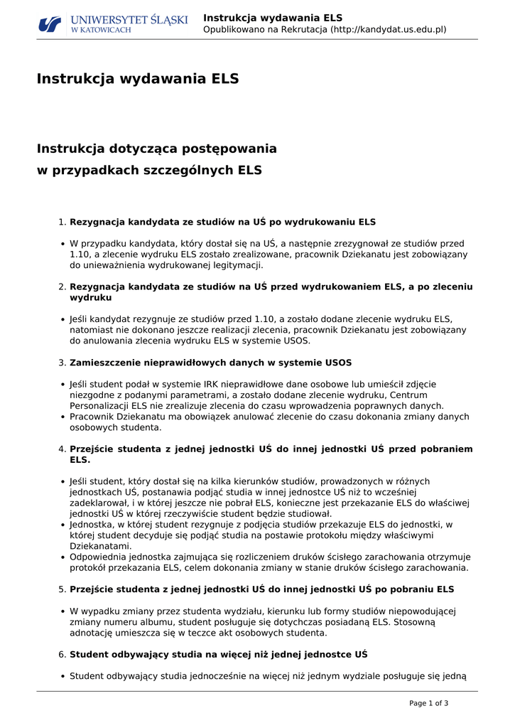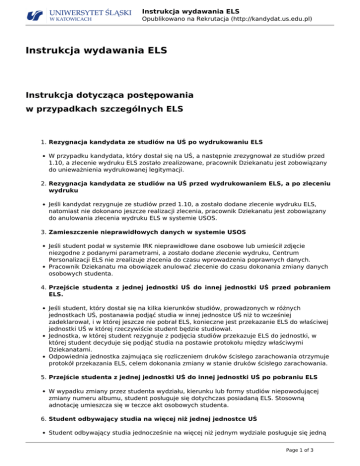 Instrukcja wydawania ELS Opublikowano na Rekrutacja (http://kandydat.us.edu.pl) Instrukcja wydawania ELS Instrukcja dotycząca postępowania w przypadkach szczególnych ELS 1. Rezygnacja kandydata ze studiów na UŚ po wydrukowaniu ELS W przypadku kandydata, który dostał się na UŚ, a następnie zrezygnował ze studiów przed 1.10, a zlecenie wydruku ELS zostało zrealizowane, pracownik Dziekanatu jest zobowiązany do unieważnienia wydrukowanej legitymacji. 2. Rezygnacja kandydata ze studiów na UŚ przed wydrukowaniem ELS, a po zleceniu wydruku Jeśli kandydat rezygnuje ze studiów przed 1.10, a zostało dodane zlecenie wydruku ELS, natomiast nie dokonano jeszcze realizacji zlecenia, pracownik Dziekanatu jest zobowiązany do anulowania zlecenia wydruku ELS w systemie USOS. 3. Zamieszczenie nieprawidłowych danych w systemie USOS Jeśli student podał w systemie IRK nieprawidłowe dane osobowe lub umieścił zdjęcie niezgodne z podanymi parametrami, a zostało dodane zlecenie wydruku, Centrum Personalizacji ELS nie zrealizuje zlecenia do czasu wprowadzenia poprawnych danych. Pracownik Dziekanatu ma obowiązek anulować zlecenie do czasu dokonania zmiany danych osobowych studenta. 4. Przejście studenta z jednej jednostki UŚ do innej jednostki UŚ przed pobraniem ELS. Jeśli student, który dostał się na kilka kierunków studiów, prowadzonych w różnych jednostkach UŚ, postanawia podjąć studia w innej jednostce UŚ niż to wcześniej zadeklarował, i w której jeszcze nie pobrał ELS, konieczne jest przekazanie ELS do właściwej jednostki UŚ w której rzeczywiście student będzie studiował. Jednostka, w której student rezygnuje z podjęcia studiów przekazuje ELS do jednostki, w której student decyduje się podjąć studia na postawie protokołu między właściwymi Dziekanatami. Odpowiednia jednostka zajmująca się rozliczeniem druków ścisłego zarachowania otrzymuje protokół przekazania ELS, celem dokonania zmiany w stanie druków ścisłego zarachowania. 5. Przejście studenta z jednej jednostki UŚ do innej jednostki UŚ po pobraniu ELS W wypadku zmiany przez studenta wydziału, kierunku lub formy studiów niepowodującej zmiany numeru albumu, student posługuje się dotychczas posiadaną ELS. Stosowną adnotację umieszcza się w teczce akt osobowych studenta. 6. Student odbywający studia na więcej niż jednej jednostce UŚ Student odbywający studia jednocześnie na więcej niż jednym wydziale posługuje się jedną Page 1 of 3 Instrukcja wydawania ELS Opublikowano na Rekrutacja (http://kandydat.us.edu.pl) legitymacją wydaną na wydziale, na którym studiuje podstawowy kierunek. 7. Rezygnacja/skreślenie studenta ze studiów na UŚ Student, który dostał się na UŚ i otrzymał ELS, a następnie zrezygnował/skreślono go (po 1.10) ze studiów zobowiązany jest zwrócić ELS do właściwej jednostki. Dziekanat zobowiązany jest do unieważnienia wydanej legitymacji. 8. Wydanie duplikatu ELS z powodu kradzieży, zagubienia bądź zniszczenia z winy studenta. Jeśli student zgubił lub zniszczył z własnej winy ELS albo została mu skradziona, powinien niezwłocznie zgłosić ten fakt we właściwym Dziekanacie. Pracownik Dziekanatu jest zobowiązany oznaczyć ten fakt w systemie USOS. Po wypełnieniu przez studenta wszystkich procedur związanych ze zgłoszeniem zagubienia legitymacji oraz po złożeniu wniosku o wykonanie duplikatu ELS [1], pracownik Dziekanatu unieważnia w systemie USOS utraconą ELS, a następnie wydaje nowe zlecenie na wydruk duplikatu legitymacji. Student wnosi opłatę za wydanie duplikatu ELS na indywidualnie wygenerowane konto opłat studenckich. Wysokość opłaty za duplikat określona jest we właściwym piśmie okólnym. 9. Wymiana ELS z powodu zniszczenia nie z winy studenta Jeśli studentowi wydano ELS z nieczytelnym nadrukiem, bez możliwości odczytu w czytniku, z uszkodzeniami mechanicznymi, które powodują błąd odczytu układu stykowego oraz układu MIFARE student zwraca ELS do właściwego Dziekanatu Pracownik Dziekanatu unieważnia wydaną legitymację w systemie USOS, a następnie zleca ponownie wydrukowanie ELS. Student nie ponosi w tym wypadku opłaty za ponowne wydanie ELS. 10. Wymiana ELS z powodu zmiany danych osobowych bądź umieszczenia na niej nieprawidłowych danych i zdjęcia. Jeżeli student zmienił swoje dane osobowe należy wymienić ELS. W przypadku, gdy student podał w systemie IRK nieprawidłowe dane osobowe / umieścił zdjęcie niezgodne z podanymi parametrami wygenerowana na ich podstawie ELS jest nieprawidłowa. Student ma wówczas obowiązek zwrócić ELS do właściwego Dziekanatu oraz złożyć wniosek o wymianę ELS. [2] Pracownik Dziekanatu jest zobowiązany do wprowadzenia poprawek w systemie USOS, a następnie do unieważnienia wydrukowanej już legitymacji i zlecenia nowego wydruku. Student ponownie wnosi opłatę za wydanie legitymacji. 11. Zwrot opłaty za wydanie ELS. Zwrot opłaty za ELS przysługuje tylko osobom, które zrezygnują ze studiów na danym kierunku, nie później jednak niż do ostatniego dnia dokonania wpisu na poszczególnych kierunkach studiów. Legitymacja studencka jest dokumentem poświadczającym status studenta. ELS jest wydawany przez uczelnię i nie jest przypisany do wydziału czy innej jednostki dydaktycznej niebędącej wydziałem, ani też do poziomu studiów czy kierunku. W związku z tym ELS po ukończeniu studiów I stopnia powinna być ta sama na kolejnym poziomie studiów, a jedynie jej aktualizację powinien potwierdzać ważny hologram. Rozporządzenie w sprawie dokumentacji przebiegu studiów mówi o prawie studenta do posiadania legitymacji, w związku z tym na Uczelni spoczywa obowiązek jej wydania, ale nie obowiązek studenta do jej odbioru. Jeśli student nie zamierza korzystać z uprawnień wynikających z jego statusu studenta to może odmówić jej przyjęcia. Page 2 of 3 Instrukcja wydawania ELS Opublikowano na Rekrutacja (http://kand