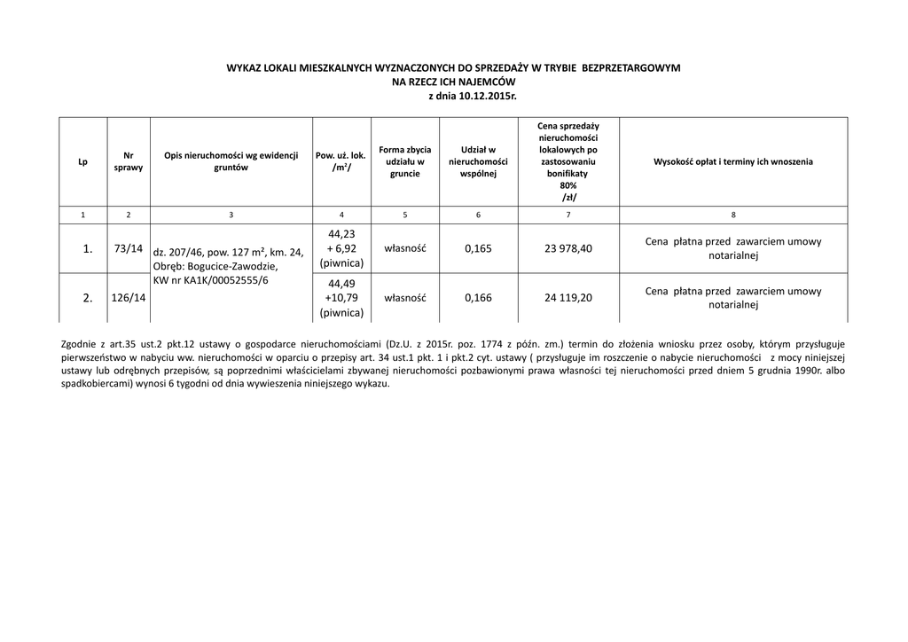 WYKAZ LOKALI MIESZKALNYCH WYZNACZONYCH DO SPRZEDAŻY W TRYBIE BEZPRZETARGOWYM NA RZECZ ICH NAJEMCÓW z dnia 10.12.2015r. Lp Nr sprawy Opis nieruchomości wg ewidencji gruntów Pow. uż. lok. /m2/ Forma zbycia udziału w gruncie Udział w nieruchomości wspólnej Cena sprzedaży nieruchomości lokalowych po zastosowaniu bonifikaty 80% /zł/ 1 2 3 4 5 6 7 8 44,23 + 6,92 (piwnica) własność 0,165 23 978,40 Cena płatna przed zawarciem umowy notarialnej 44,49 +10,79 (piwnica) własność 0,166 24 119,20 Cena płatna przed zawarciem umowy notarialnej 1. 73/14 dz. 207/46, pow. 127 m², km. 24, Obręb: Bogucice-Zawodzie, KW nr KA1K/00052555/6 2. 126/14 Wysokość opłat i terminy ich wnoszenia Zgodnie z art.35 ust.2 pkt.12 ustawy o gospodarce nieruchomościami (Dz.U. z 2015r. poz. 1774 z późn. zm.) termin do złożenia wniosku przez osoby, którym przysługuje pierwszeństwo w nabyciu ww. nieruchomości w oparciu o przepisy art. 34 ust.1 pkt. 1 i pkt.2 cyt. ustawy ( przysługuje im roszczenie o nabycie nieruchomości z mocy niniejszej ustawy lub odrębnych przepisów, są poprzednimi właścicielami zbywanej nieruchomości pozbawionymi prawa własności tej nieruchomości przed dniem 5 grudnia 1990r. albo spadkobiercami) wynosi 6 tygodni od dnia wywieszenia niniejszego wykazu.
