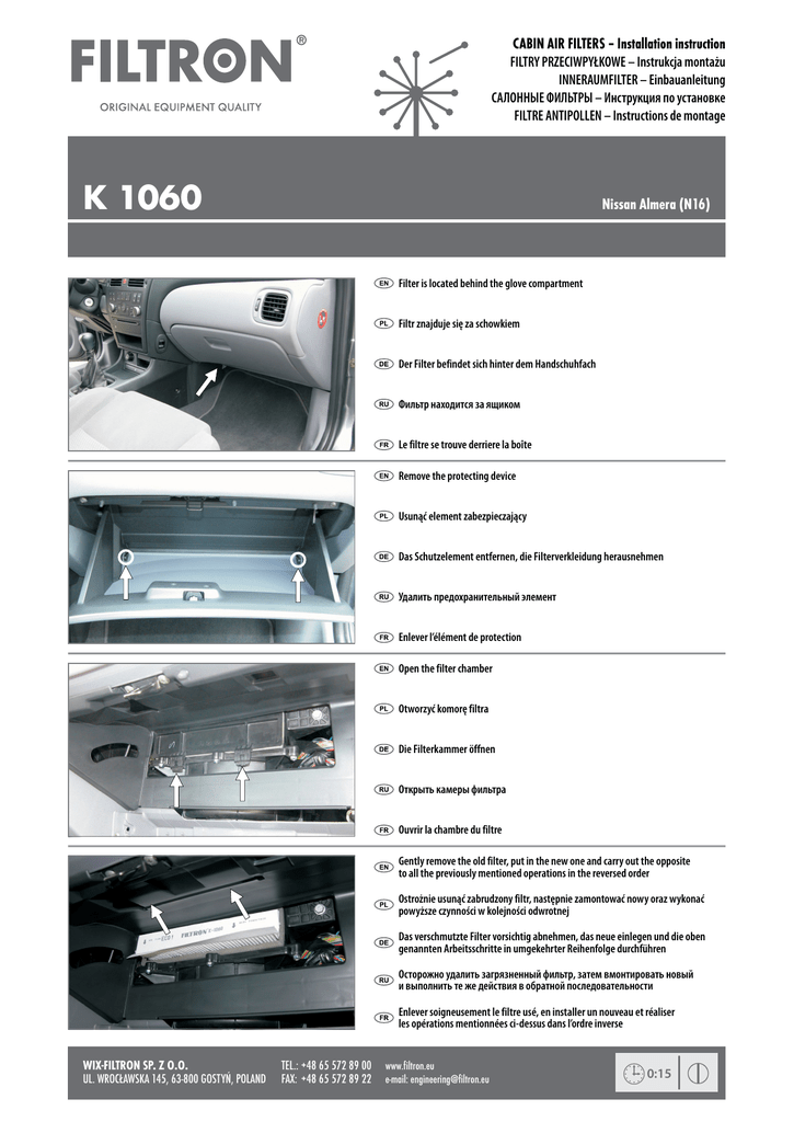 CABIN AIR FILTERS – Installation instruction FILTRY PRZECIWPYŁKOWE – Instrukcja montażu INNERAUMFILTER – Einbauanleitung САЛОННЫЕ ФИЛЬТРЫ – Инструкция по установке FILTRE ANTIPOLLEN – Instructions de montage K 1060 Nissan Almera (N16) Filter is located behind the glove compartment Filtr znajduje się za schowkiem Der Filter befindet sich hinter dem Handschuhfach Фильтр находится за ящиком Le filtre se trouve derriere la boîte Remove the protecting device Usunąć element zabezpieczający Das Schutzelement entfernen, die Filterverkleidung herausnehmen Удалить предохранительный элемент Enlever l’élément de protection Open the filter chamber Otworzyć komorę filtra Die Filterkammer öffnen Открыть камеры фильтра Ouvrir la chambre du filtre Gently remove the old filter, put in the new one and carry out the opposite to all the previously mentioned operations in the reversed order Ostrożnie usunąć zabrudzony filtr, następnie zamontować nowy oraz wykonać powyższe czynności w kolejności odwrotnej Das verschmutzte Filter vorsichtig abnehmen, das neue einlegen und die oben genannten Arbeitsschritte in umgekehrter Reihenfolge durchführen Осторожно удалить загрязненный фильтр, затем вмонтировать новый и выполнить те же действия в обратной последовательности Enlever soigneusement le filtre usé, en installer un nouveau et réaliser les opérations mentionnées ci-dessus dans l’ordre inverse WIX-FILTRON SP. Z O.O. TEL.:+48 65 572 89 00 www.filtron.eu UL. WROCŁAWSKA 145, 63-800 GOSTYŃ, POLAND FAX: +48 65 572 89 22 e-mail: [email protected] 0:15