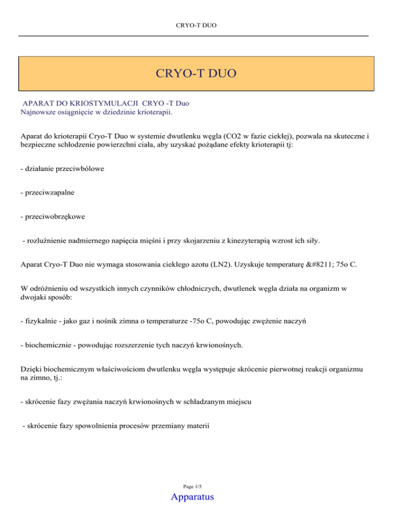 CRYO-T DUO CRYO-T DUO APARAT DO KRIOSTYMULACJI CRYO -T Duo Najnowsze osiągnięcie w dziedzinie krioterapii. Aparat do krioterapii Cryo-T Duo w systemie dwutlenku węgla (CO2 w fazie ciekłej), pozwala na skuteczne i bezpieczne schłodzenie powierzchni ciała, aby uzyskać pożądane efekty krioterapii tj: - działanie przeciwbólowe - przeciwzapalne - przeciwobrzękowe - rozluźnienie nadmiernego napięcia mięśni i przy skojarzeniu z kinezyterapią wzrost ich siły. Aparat Cryo-T Duo nie wymaga stosowania ciekłego azotu (LN2). Uzyskuje temperaturę – 75o C. W odróżnieniu od wszystkich innych czynników chłodniczych, dwutlenek węgla działa na organizm w dwojaki sposób: - fizykalnie - jako gaz i nośnik zimna o temperaturze -75o C, powodując zwężenie naczyń - biochemicznie - powodując rozszerzenie tych naczyń krwionośnych. Dzięki biochemicznym właściwościom dwutlenku węgla występuje skrócenie pierwotnej reakcji organizmu na zimno, tj.: - skrócenie fazy zwężania naczyń krwionośnych w schładzanym miejscu - skrócenie fazy spowolnienia procesów przemiany materii Page 1/5 Apparatus CRYO-T DUO Reakcja wtórna, czyli - gwałtowne rozszerzenie naczyń krwionośnych - przyspieszony metabolizm występuje w przypadku działania zimnego dwutlenku węgla już podczas trwania zabiegu, co umożliwia bardzo intensywne przenoszenie zimna do głębiej położonych tkanek. Obydwa czynniki pozwalają na bezpieczne stosowanie u pacjentów z problemami kardiologicznymi. Stosując dwutlenek węgla w zabiegach krioterapii uzyskuje się pełne efekty terapeutyczne: - uśmierzenie bólu poprzez wyzwalanie dużej dawki endorfin, - obniżenie aktywności procesu zapalnego, obniżenie napięcia mięśniowego, zmniejszenie obrzęków - poprawę stanu klinicznego i funkcjonalnego pacjenta, - poprzez zwiększenie zakresu ruchu w schładzanych stawach i wzroście siły mięśniowej - przyspieszenie procesu gojenia i leczenia urazów - zdejmowanie szoku termicznego - złagodzenie stanów pooparzeniowych Wyniki doświadczeń wskazują na bardzo dobre efekty leczenia teleangiektazji. Należy zwrócić szczególną uwagę na fakt, że Cryo-T Duo pozwala na nieinwazyjne leczenie pajączków. Krioterapia z zastosowaniem dwutlenku węgla pozwala na bezpieczną i precyzyjną "kontaktową" metodę nadmuchu poprzez przesuwanie dyszy tuż nad powierzchnią skóry z wykorzystaniem maksymalnie niskiej temperatury (-75 oC). Zalety użytkowe aparatu do krioterapii Cryo-T Duo: Page 2/5 Apparatus CRYO-T DUO Czynnik roboczy - dwutlenek węgla jest ogólnie dostępnym gazem. Butle można napełniać w ogólnopolskiej sieci POLGAZU, AGI, BOC-a także innych firm zajmujących się sprzedażą gazów. Jedna butla wystarcza na 45-90 minut ciągłej pracy urządzenia. Wymiana butli trwa kilkanaście sekund. Aparat wyposażony jest w wymienne dysze o różnych średnicach pozwalając na precyzyjne schładzanie wybranych okolic ciała i dając dużą oszczędność CO2. Największą dyszę stosuje się do nadmuchu na duże powierzchnie, np. biodra, pośladki, grzbiet; średnią w obrębie kończyn; małą dla meridianów (kriopunktura). Zastosowanie aparatu: Urazy - po złamaniach i stłuczeniach - Opóźniony zrost kostny - Uraz świeży - Staw rzekomy - Opóźnienia zastosowania endoprotez Oparzenia - zdejmowanie szoku termicznego Rehabilitacja pooperacyjna Choroby reumatyczne i zwyrodnieniowe, choroby kości - Zwyrodnienia - Gościec pierwotnie postępujący (GPP) - Zesztywniające zapalenie stawów kręgosłupa w fazie początkowej (ZZSK) - Choroba Bechterowa, choroba Scheuermanna - Zespoły bólowe Page 3/5 Apparatus CRYO-T DUO - Odwapnienie kości - osteoporoza - Jałowa martwica kości udowej - Zespół Sudecka Choroby stawów - Zapalenia ostre i przewlekłe - Zapalenia okołostawowe - Zmiany zwyrodnieniowe - Zapalenia wielostawowe - Zapalenia kłykci - Reumatoidalne zapalenia stawów Nadmierne napięcie mięśniowe, spastyczność Choroby mięśni, więzadeł, skręcenia, stany zapalne nerwów - Międzyżebrowych - Nerwu kulszowego - Lumbago - Niedowłady - Spastyczność Zespoły bólowe, nerwobóle Page 4/5 Apparatus CRYO-T DUO Obrzęki, nadwaga i otyłość - przyspiesza metabolizm komórkowy Kosmetyka - teleangiektazje (pajączki) i cellulit Page 5/5 Apparatus