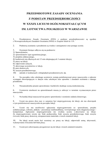 PRZEDMIOTOWE ZASADY OCENIANIA Z PODSTAW PRZEDSIĘBIORCZOŚCI W XXXIX LICEUM OGÓLNOKSZTAŁCĄCYM IM. LOTNICTWA POLSKIEGO W WARSZAWIE 1. Przedmiotowe Zasady Oceniania (PZO) z podstaw przedsiębiorczości są zgodnie z Wewnątrzszkolnymi Zasadami Oceniania (WSO) w Zespole Szkół nr 119. 2. Podstawą oceniania z przedmiotu są wiedza i umiejętności oraz postępy ucznia. 3. Ocenianie bieżące odbywa się na podstawie: 1) Sprawdzianów, 2) sprawdzianów typu egzaminacyjnego, 3) projektu edukacyjnego, 4) kartkówek (nie dłuższych niż 15 min obejmujących 3 ostatnie lekcje), 5) pracy na lekcji, 6) odpowiedzi ustnych, 7) aktywnego uczestnictwa w lekcji, 8) prac domowych, 9) zeszytu przedmiotowego, 10) udziału w konkursach i olimpiadach przedmiotowych, itp. 4. Na początku roku szkolnego uczniowie zostają poinformowani przez nauczyciela o zakresie wymagań obowiązującym w danym roku szkolnym oraz sposobie i zasadach oceniania z danego przedmiotu. 5. Niesamodzielne pisanie sprawdzianu i kartkówki skutkuje oceną niedostateczną. 6. Uczniowie nieobecni na sprawdzianach muszą je zaliczyć w terminie wyznaczonym przez nauczyciela. 7. Na każdej lekcji nauczyciel ma prawo sprawdzenia i ocenienie zadania domowego. 8. Uczeń ma prawo dwa razy w semetrze być nieprzygotowany do lekcji, ale ma obowiązek o tym poinformować nauczyciela na początku lekcji. 9. Uczeń nie ma możliwości zgłoszenia nieprzygotowania ze: sprawdzianu, projekt uedukacyjnego, referatu, plakatu / prezentacji multimedilanej, wewnętrznego testu diagnostycznego / kompetencji. Zgłoszenie nieprzygotowania nie zwalnia ucznia z aktywności na lekcji. Za nieprzygotowanie uważa się: brak podręcznika, brak zeszytu przedmitoowego, brak zeszytu ćwiczeń, brak pracy domowej, nieopanowania materiału z trzech ostatnich lekcji. 10. Na lekcji uczeń może być oceniony za: pracę na lekcji, odpowiedź ustną, aktywność, wykonywanie ćwiczenia lub brak pracy. 11. Uczeń jest zobowiązany przygotować się do lekcji z trzech ostatnich tematów. 12. Uczeń ma mozliwość porpawy ocen ze sprawdzianów w terminie wyznaczonym przez nauczyciela. Uczeń może porpawiać ją tylko jeden raz. Czas na poprawę oceny nie powinien przewkroczyć dwóch tygodni od momentu jej wystawienia. 13. Ocenianie powinno uwzględniać wszystkie formy aktywności ucznia. 14. Punkty uzyskane z prac pisemnych przeliczane są według następującej skali: 1) Gimnazjum Lp. 1. 2. 3. 4. 5. 6. Skala procentowa 0-30% 31-50% 51-74% 75-90% 91-99% 100% 2) Lp. 1. 2. 3. 4. 5. 6. Stopień niedostateczny dopuszczający dostateczny dobry bardzo dobry celujący Liceum Skala procentowa 0-39% 40-50% 51-74% 75-87% 88-99% 100% Stopień niedostateczny dopuszczający dostateczny dobry bardzo dobry celujący 15. Do podanych ocen nauczyciel może stosować znaki „+” lub „-„ dla zaznaczenia górnych bądź dolnych wartości punktów wymaganych dla danego stopnia. \ 16. Aktywność ucznia może być oceniana „+” lub „-„. Trzy plusy dają ocenę bardzo dobry, trzy minusy ocenę niedostateczny. Każde kolejne nieprzygotowanie wiąże się z oceną niedostateczną. 17. Ocenę semestralną i roczną nauczyciel wystawia w terminie ustalonym w rozporządzeniu Dyrektora Szkoły. 18. Na miesiąc przed Radą Klasyfikacyjną uczeń zostaje poinformowany o przewidywanej ocenie semestralnej i rocznej. 19. O zagrożeniu oceną niedostateczną nauczyciel informuje ucznia oraz wychowawcę klasy, który pisemnie powiadamia rodziców / opiekunów prawnych ucznia na miesiąc przed Radą Klasyfikacyjną. 20. Ocenę semestralną i roczną nauczyciel wystawia na podstawie ocen cząstkowych uzyskanych przez ucznia. Wagi ocen bieżących: Lp. 1. 2. 3. 4. 5. 6. Stopień Celujący Bardzo dobry Dobry Dostateczny Dopuszczający Niedostateczny Wartość liczbowa 6 5 4 3 2 1 Wagi ocen bieżących: Lp. 1. 2. 3. 4. 5. 6. 7. 8. 9. 10. 11. 12. 13. 14. 15. 16. 17. 18. 19. 20. 21. Kategoria Sprawdzian Sprawdzian typu egzaminacyjnego Konkurs / zawody sportowe Projekt edukacyjny Kartkówka Zadania praktyczne Systematyczność udziału ucznia w zajęciach Tekst argumentacyjny / wypracowanie Praca na lekcji / aktywność Test na czytanie / słuchanie ze zrozumieniem Referat Tekst argumentacyjny / wypracowanie Plakat / prezentacja multimedialna Praca domowa Odpowiedź ustna Praca w grupach Rozwiązywanie zadań z treścią Wewnętrzny test diagnostyczny / kompetencji Nieprzygotowanie do zajęć Zeszyt ćwiczeń Waga 6 6 6 6 5 5 5 5 4 4 3 3 2 2 2 2 2 1 1 1 Warunki i tryb uzyskania wyższej niż przewidywana rocznej oceny klasyfikacyjnej z zajęć edukacyjnych, zasady przystąpienia do egzaminu klasyfikacyjnego, egzaminu poprawkowego, sprawdzianu wiedzy i umiejętności reguluje statut szkoły.