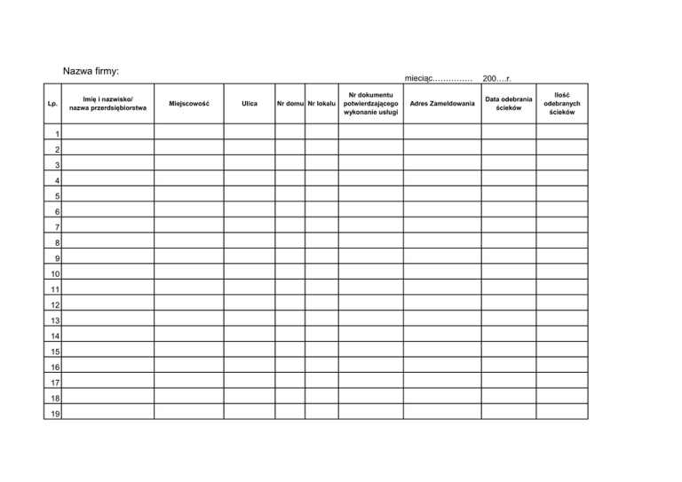 Nazwa firmy: Lp. 1 2 3 4 5 6 7 8 9 10 11 12 13 14 15 16 17 18 19 Imię i nazwisko/ nazwa przerdsiębiorstwa mieciąc…………… Miejscowość Ulica Nr domu Nr lokalu Nr dokumentu potwierdzającego wykonanie usługi Adres Zameldowania 200….r. Data odebrania ścieków Ilość odebranych ścieków 20 21 22 23 24 25 26 27 28 29 30 31 32 33 34 35 36 37 38 39 40 41 42 43 44 45 46 47 48 49 50 51 52 53 54 55 56 57 58 59 60 61 62 63 64 65 66 67 68