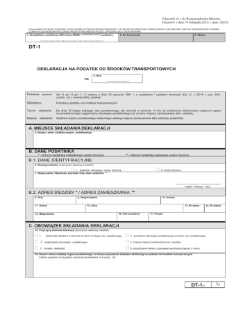 Załącznik nr 1 do Rozporządzenia Ministra Finansów z dnia 19 listopada 2015 r. (poz. 2025) POLA JASNE W YPEŁNIA PODATNIK, POLA CIEMNE W YPEŁNIA ORGAN PODATKOW Y. W YPEŁNIĆ NA MASZYNIE, KOMPUTEROW O LUB RĘCZNIE, DUŻYMI, DRUKOW ANYMI LITERAMI, CZARNYM LUB NIEBIESKIM KOLOREM. PRZED W YPEŁNIENIEM NALEŻY ZAPOZNAĆ SIĘ Z OBJASNIENIAMI. 1. Identyfikator podatkowy NIP/numer PESEL (niepotrzebne skreślić) podatnika 2. Nr dokumentu 3. Status ¹————†————†————†————†————†————†————†————†————†————†————¹ DT-1 DEKLARACJA NA PODATEK OD ŚRODKÓW TRANSPORTOWYCH 4. Rok na ¹————†————†————†————¹ Podstawa prawna: Art. 9 ust. 6 pkt 1 i 2 ustawy z dnia 12 stycznia 1991 r. o podatkach i opłatach lokalnych (Dz. U. z 2014 r. poz. 844, z późn. zm.) zwanej dalej „ustawą”. Składający: Podatnicy podatku od środków transportowych. Termin składania: Do dnia 15 lutego każdego roku podatkowego, jak również w terminie 14 dni od zaistnienia okoliczności mających wpływ na powstanie bądź wygaśnięcie obowiązku podatkowego lub zmiany miejsca zamieszkania albo siedziby. Miejsce składania: Siedziba organu podatkowego właściwego według miejsca zamieszkania albo siedziby podatnika. A. MIEJSCE SKŁADANIA DEKLARACJI 5. Nazwa i adres siedziby organu podatkowego B. DANE PODATNIKA * - dotyczy podatnika niebędącego osobą fizyczną ** - dotyczy podatnika będącego osobą fizyczną B.1. DANE IDENTYFIKACYJNE 6. Rodzaj podatnika (zaznaczyć właściwy kwadrat): 2. osoba fizyczna 1. podatnik niebędący osobą fizyczną 7. Nazwa pełna */Nazwisko, pierwsze imię, data urodzenia ** ¹————†————¹-¹————†————¹-¹————†————†————†————¹ (dzień - miesiąc - rok) B.2. ADRES SIEDZIBY * / ADRES ZAMIESZKANIA ** ę. Województwo 8. Kraj 11. Gmina 10. Powiat 12. Ulica 15. Miejscowość 13. Nr domu 16. Kod pocztowy 14. Nr lokalu 17. Poczta C. OBOWIĄZEK SKŁADANIA DEKLARACJI 18. Przyczyny złożenia deklaracji (zaznaczyć właściwy kwadrat): 1. 3. 5. deklaracja składana w terminie do dnia 15 lutego roku podatkowego wygaśnięcie obowiązku podatkowego korekta deklaracji 2. powstanie obowiązku podatkowego w trakcie roku podatkowego 4. zmiana miejsca zamieszkania lub siedziby 6. przedłużenie okresu czasowego wycofania pojazdu z ruchu 19. Nazwa i adres siedziby organu podatkowego, w którym poprzednio składano deklarację na podatek od środków transportowych (należy wypełnić w przypadku zaznaczenia kwadratu nr 4 w poz. 18) 1 POLA JASNE WYPEŁNIA PODATNIK, POLA CIEMNE WYPEŁNIA ORGAN PODATKOWY. WYPEŁNIĆ NA MASZYNIE, KOMPUTEROWO LUB RĘCZNIE, DUŻYMI, DRUKOWANYMI LITERAMI, CZARNYM LUB NIEBIESKIM KOLOREM. PRZED WYPEŁNIENIEM NALEŻY ZAPOZNAĆ SIĘ Z OBJASNIENIAMI. D. DANE DOTYCZĄCE PRZEDMIOTÓW OPODATKOWANIA (z wyjątkiem środków transportowych zwolnionych z podatku) W przypadku zaznaczenia w poz.18 kwadratu nr 2, 3, 5 lub 6 podatnik wypełnia deklarację i załącznik tylko w zakresie pojazdów, co do których obowiązek podatkowy powstał, wygasł lub złożona wcześniej deklaracja została wypełniona nieprawidłowo. Rodzaje środków transportowych Liczba pojazdów niepozostających we współwłasności Liczba pojazdów pozostających we współwłasności 1) Liczba pojazdów pozostających we współwłasności 2) Kwota podatku a b c d e zł, D.1 20. 21. 22. 23. 24. 25. 26. 27. 28. 29. 30. 31. 32. 33. 34. 35. 36. 37. 38. 39. 40. 41. 42. 43. 44. 45. 46. 47. Samochody ciężarowe o dopuszczalnej masie całkowitej powyżej 3,5 tony do 5,5 tony włącznie gr , D.2 Samochody ciężarowe o dopuszczalnej masie całkowitej powyżej 5,5 tony do 9 ton włącznie D.3 Samochody ciężarowe o dopuszczalnej masie całkowitej powyżej 9 ton i poniżej 12 ton , , D.4 Ciągniki siodłowe i balastowe przystosowane do używania łącznie z naczepą lub przyczepą o dopuszczalnej masie całkowitej zespołu pojazdów od 3,5 tony i poniżej 12 ton , D.5 Przyczepy i naczepy, które łącznie z pojazdem silnikowym posiadają dopuszczalną masę całkowitą od 7 ton i poniżej 12 ton, z wyjątkiem związanych wyłącznie z działalnością rolniczą prowadzoną przez podatnika podatku rolnego D.6 Autobusy z liczbą miejsc do siedzenia mniejszą niż 22 3) D.7 Autobusy z liczbą miejsc do siedzenia równą lub większą niż 22 3) , , , Samochody ciężarowe o dopuszczalnej masie całkowitej równej lub wyższej niż 12 ton Liczba pojazdów niepozostających we współwłasności Liczba osi Liczba pojazdów pozostających we współwłasności 1) Liczba pojazdów pozostających we współwłasności 2) Kwota podatku zł, a D.8 Dwie osie D.9 Trzy osie D.10 Cztery osie i więcej b c d gr e 48. 49. 50. 51. 52. 53. 54. 55. 56. 57. 58. 59. , , , Ciągniki siodłowe i balastowe przystosowane do używania łącznie z naczepą lub przyczepą o dopuszczalnej masie całkowitej zespołu pojazdów równej lub wyższej niż 12 ton Liczba pojazdów niepozostających we współwłasności Liczba osi Liczba pojazdów pozostających we współwłasności 1) Liczba pojazdów pozostających we współwłasności 2) Kwota podatku zł, a D.11 Dwie osie D.12 Trzy osie i więcej b c d e 60. 61. 62. 63. 64. 65. 66. 67. , , 1) Kolumnę c na stronie 2. i 3. deklaracji wypełnia współwłaściciel wpisany jako pierwszy w dowodzie rejestracyjnym pojazdu. 2) Kolumnę d na stronie 2. i 3. deklaracji wypełnia współwłaściciel niewpisany jako pierwszy w dowodzie rejestracyjnym pojazdu. 3) Wyłączając siedzenie kierowcy. gr POLA JASNE WYPEŁNIA PODATNIK, POLA CIEMNE WYPEŁNIA ORGAN PODATKOWY. WYPEŁNIĆ NA MASZYNIE, KOMPUTEROWO LUB RĘCZNIE, DUŻYMI, DRUKOWANYMI LITERAMI, CZARNYM LUB NIEBIESKIM KOLOREM. PRZED WYPEŁNIENIEM NALEŻY ZAPOZNAĆ SIĘ Z OBJASNIENIAMI. Przyczepy i naczepy, które łącznie z pojazdem silnikowym posi