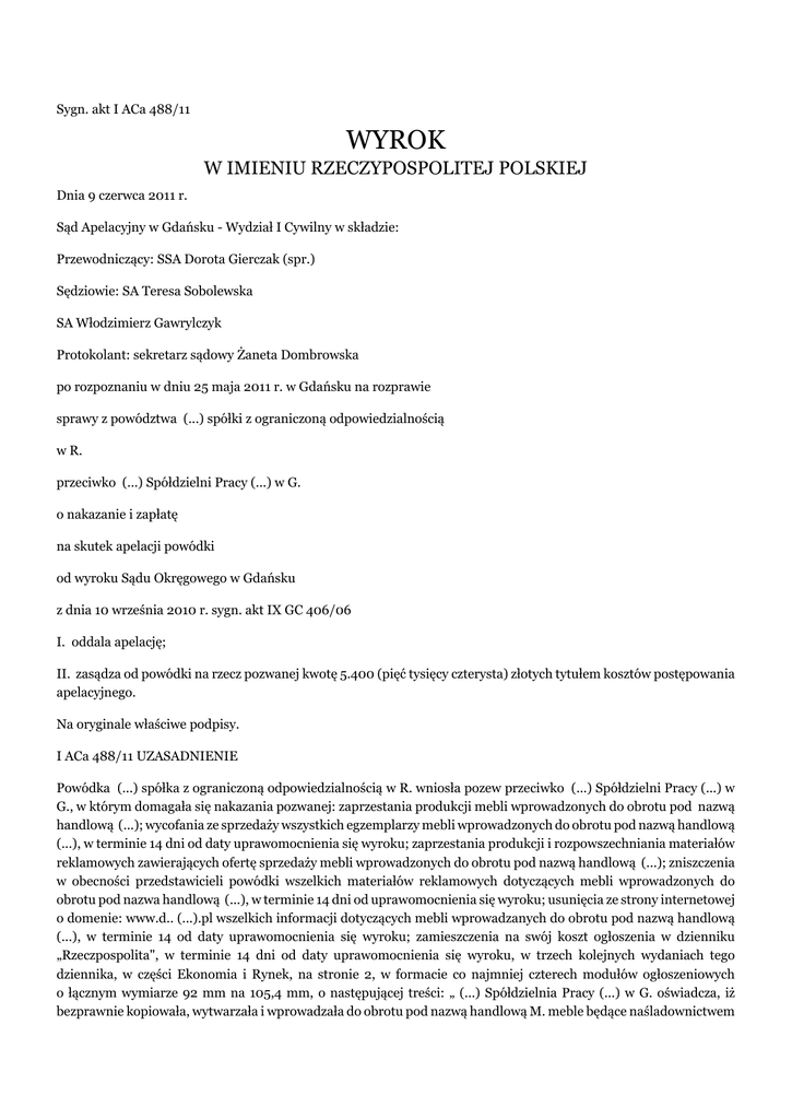 Sygn. akt I ACa 488/11 WYROK W IMIENIU RZECZYPOSPOLITEJ POLSKIEJ Dnia 9 czerwca 2011 r. Sąd Apelacyjny w Gdańsku - Wydział I Cywilny w składzie: Przewodniczący: SSA Dorota Gierczak (spr.) Sędziowie: SA Teresa Sobolewska SA Włodzimierz Gawrylczyk Protokolant: sekretarz sądowy Żaneta Dombrowska po rozpoznaniu w dniu 25 maja 2011 r. w Gdańsku na rozprawie sprawy z powództwa (...) spółki z ograniczoną odpowiedzialnością w R. przeciwko (...) Spółdzielni Pracy (...) w G. o nakazanie i zapłatę na skutek apelacji powódki od wyroku Sądu Okręgowego w Gdańsku z dnia 10 września 2010 r. sygn. akt IX GC 406/06 I. oddala apelację; II. zasądza od powódki na rzecz pozwanej kwotę 5.400 (pięć tysięcy czterysta) złotych tytułem kosztów postępowania apelacyjnego. Na oryginale właściwe podpisy. I ACa 488/11 UZASADNIENIE Powódka (...) spółka z ograniczoną odpowiedzialnością w R. wniosła pozew przeciwko (...) Spółdzielni Pracy (...) w G., w którym domagała się nakazania pozwanej: zaprzestania produkcji mebli wprowadzonych do obrotu pod nazwą handlową (...); wycofania ze sprzedaży wszystkich egzemplarzy mebli wprowadzonych do obrotu pod nazwą handlową (...), w terminie 14 dni od daty uprawomocnienia się wyroku; zaprzestania produkcji i rozpowszechniania materiałów reklamowych zawierających ofertę sprzedaży mebli wprowadzonych do obrotu pod nazwą handlową (...); zniszczenia w obecności przedstawicieli powódki wszelkich materiałów reklamowych dotyczących mebli wprowadzonych do obrotu pod nazwa handlową (...), w terminie 14 dni od uprawomocnienia się wyroku; usunięcia ze strony internetowej o domenie: www.d.. (...).pl wszelkich informacji dotyczących mebli wprowadzanych do obrotu pod nazwą handlową (...), w terminie 14 od daty uprawomocnienia się wyroku; zamieszczenia na swój koszt ogłoszenia w dzienniku „Rzeczpospolita", w terminie 14 dni od daty uprawomocnienia się wyroku, w trzech kolejnych wydaniach tego dziennika, w części Ekonomia i Rynek, na stronie 2, w formacie co najmniej czterech modułów ogłoszeniowych o łącznym wymiarze 92 mm na 105,4 mm, o następującej treści: „ (...) Spółdzielnia Pracy (...) w G. oświadcza, iż bezprawnie kopiowała, wytwarzała i wprowadzała do obrotu pod nazwą handlową M. meble będące naśladownictwem mebli produkowanych i wprowadzonych do obrotu przez (...) spółkę z o. o. w R. pod nazwą handlową P.. Za powyższe bezprawne działanie (...) Spółdzielnia Pracy (...) przeprasza spółkę (...) obraz zobowiązuje się do zaniechania takich działań w przyszłości" z tym zastrzeżeniem, że w razie niewykonania przez pozwaną w wyznaczonym terminie tej czynności, powódka uprawniona będzie do wykonania tej czynności na jej koszt; wydania powódce bezpodstawnie uzyskanych przez pozwaną korzyści majątkowych ze sprzedaży mebli wprowadzonych do obrotu pod nazwą handlową (...), poprzez zasądzenie na rzecz powódki od pozwanej kwoty stanowiącej zysk netto osiągnięty przez pozwaną wskutek sprzedaży tych mebli, której wysokości powódka na etapie wnoszenia pozwu nie ma możliwości ustalenia, a która zostanie dokładnie ustalona w trakcie procesu przez biegłego sądowego, przy czym żądanie to sprecyzowała na kwotę 250.000 zł; naprawienia wyrządzonej powódce przez pozwaną szkody majątkowej wskutek prowadzonej przez pozwaną sprzedaży mebli wprowadzonych do obrotu pod nazwą handlową (...) poprzez zasądzenie na rzecz powódki od pozwanej kwoty, której pełnej wysokości powódka na etapie wnoszenia pozwu nie ma możliwości ustalenia, a która zostanie dokładnie ustalona w trakcie procesu przez biegłego sądowego, przy czym żądanie to sprecyzowała na kwotę 267.000 zł. Ponadto powódka domagała się zasądzenia od pozwanej kosztów procesu, w tym kosztów zastępstwa procesowego w wysokości czterokrotności stawki minimalnej według norm przepisanych. W odpowiedzi na pozew pozwana wniosła o jego oddalenie powództwa w całości i zasądzenie na jej rzecz od powódki kosztów procesu zgodnie z zestawieniem kosztów, które zostanie złożone na rozprawie. Wyrokiem z dnia 10 września 2010r. Sąd Okręgowy w Gdańsku oddalił powództwo, zasądził od powódki na rzecz pozwanej kwotę 28.845 zł tytułem zwrotu kosztów procesu i nakazał ściągnąć od powódki na rzeź Skarbu Państwa Sądu Okręgowego w Gdańsku kwotę 474,37 zł tytułem wydatków poniesionych w toku postępowania. W uzasadnieniu orzeczenia Sąd I instancji ustalił następujący stan faktyczny: w dniu 6 lipca 2003r. Urząd Patentowy Rzeczypospolitej Polskiej wydał, na podstawie zgłoszenia z 19 czerwca 2000r., decyzję udzielającą powódce prawa rejestracji wzoru przemysłowego p.t. S.(1). Twórcami wzoru zdobniczego byli M. H. (1), M. H. (2), S. H. i C. H.. Przedmiotem wzoru zdobniczego była sofa, a istotę tego wzoru stanowiła nowa postać przedmiotu przejawiająca się w jego ukształtowaniu i zdobieniach, szczegółowo opisanych przez Sąd w uzasadnieniu orzeczenia. Prawa powódki zostały potwierdzone Świadectwem Rejestracji nr (...) na wzór przemysłowi p.t. S.(1), wydanym na rzecz (...) spółki z ograniczoną odpowiedzialnością w R. w dniu 9 marca 2004r. wydanym przez Urząd Patentowy Rzeczypospolitej Polskiej. Przyznanie tych praw potwierdzała baza danych praw ochronnych udostępniona przez Urząd Patentowy w formie elektronicznej na stronie internetowej. Prawa z rejestracji wygasły 19 czerwca 2005r. Powódka rozpowszechniała swoją ofertę produktów za pomocą katalogów reklamowych oraz strony internetowej, informując przy tym, że prezentowane wzory przemysłowe są zastrzeżone. Model sofy (...) był produkowany od 2000r., jego sprzedaż szybko wzrastała, w 2003r. osiągnięto sprzedaż na poziomie 4.000 sztuk. Mając to na uwadze zakładano przyrost sprzedaży w 2004r, do ok. 10.000 sztuk. S.(1) kosztowała ok. l.200 zł. We wrześniu 2003r. powódka