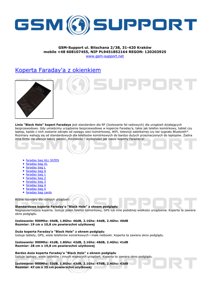 GSM-Support ul. Bitschana 2/38, 31-420 Kraków mobile +48 608107455, NIP PL9451852164 REGON: 120203925 www.gsm-support.net Koperta Faraday'a z okienkiem Linia "Black Hole" kopert Faradaya jest standardem dla RF (Izolowanie fal radiowych) dla urządzeń działających bezprzewodowo. Gdy umieścimy urządzenie bezprzewodowe w kopercie Faraday'a, takie jak telefon komórkowy, tablet czy laptop, każde z nich zostanie odcięte od zasięgu sieci komórkowej, WiFi, telewizji satelitarnej czy też sygnału Bluetooth*. Rozmiary wahają się od standardowych dla telefonów komórkowych do bardzo dużych przeznaczonych do laptopów. Żadna inna firma nie oferuje takiej jakości, możliwości i wydajności jak nasze koperty Faraday'a! faraday faraday faraday faraday faraday faraday faraday faraday faraday faraday bag bag bag bag bag bag bag bag bag bag ALL SIZES XL L S 1 2 3 4 5 cards Różne rozmiary dla różnych urządzeń: Standardowa koperta Faraday'a "Black Hole" z oknem podglądu Najpopularniejsza koperta. Izoluje jeden telefon komórkowy, GPS lub inne podobnej wielkości urządzenia. Koperta ta zawiera okno podglądu. Izolowanie: 900Mhz: 44dB, 1.8Ghz: 46dB, 2.1Ghz: 44dB, 2.4Ghz: 40dB Rozmiar: 19 cm x 10,8 cm powierzchni użytkowej Duża koperta Faraday'a "Black Hole" z oknem podglądu Izoluje tablety, GPS, wiele telefonów komórkowych i małe netbooki. Koperta ta zawiera okno podglądu. Izolowanie: 900Mhz: 41dB, 1.8Ghz: 42dB, 2.1Ghz: 48dB, 2.4Ghz: 41dB Rozmiar: 28 cm x 19,8 cm powierzchni użytkowej Bardzo duża koperta Faraday'a "Black Hole" z oknem podglądu Izoluje laptopy, wiele tabletów i innych większych urządzeń. Koperta ta zawiera okno podglądu. Izolowanie: 900Mhz: 53dB, 1.8Ghz: 43dB, 2.1Ghz: 47dB, 2.4Ghz: 43dB Rozmiar: 47 cm x 35 cm powierzchni użytkowej *Warunkiem pożądanego efektu jest, aby koperta była zawinięta tak, aby okienko nie znajdowało się na wierzchu. Zestaw zawiera: 1 koperta Faraday'a 10 sztuk kart dowodowych ©2012 www.gsm-support.net Opis ten nie stanowi oferty w rozumieniu Kodeksu Cywilnego. GSM-Support zastrzega sobie prawo do możliwych błędów w opisie produktu. Prosimy o weryfikację z Państwa strony, a w razie wątpliwości o kontakt. GSM-Support ul. Bitschana 2/38 31-420 Kraków POLSKA tel. 608107455 e-mail: [email protected] Powered by TCPDF (www.tcpdf.org)