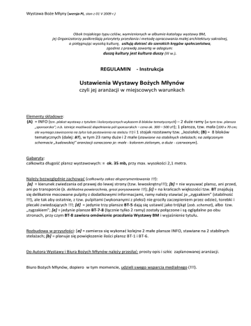 Wystawa Boże Młyny (wersja PL, stan z 01 V 2009 r.) Obok trojakiego typu celów, wymienionych w albumie-katalogu wystawy BM, jej Organizatorzy podkreślają priorytety przesłania i metodę opracowania małej architektury sakralnej, a pielęgnując wysoką kulturę, usiłują dotrzeć do szerokich kręgów społeczeństwa, zgodnie z prawdą zawartą w adagium: duszą kultury jest kultura duszy (III w.). REGULAMIN - Instrukcja Ustawienia Wystawy Bożych Młynów czyli jej aranżacji w miejscowych warunkach Elementy składowe: (A) = INFO (tzn. plakat wystawy z tytułem i kolorystycznych wykazem 8 bloków tematycznych) – 2 duże ramy (w tym tzw. plansza „sponsorska”; n.b. istnieje możliwość dopełniania pól sponsorskich – cena ok. 300 – 500 zł!); 1 plansza, tzw. mała (100 x 70 cm; ale wymaga zawieszenia na żyłce lub postawienia na stelażu !!!) i 1 stojak rozstawny tzw. „koziołek; (B) = 8 bloków tematycznych (dalej: BT), w tym 23 ramy duże i 2 małe (stawiane na stabilnych stelażach; na załączonym schemacie „kudowskiej” aranżacji oznaczono je: małe - kolorem zielonym, a duże - czerwonym). Gabaryty: całkowita długość plansz wystawowych: = ok. 35 mb, przy max. wysokości 2,1 metra. Należy bezwzględnie zachować (całkowity zakaz eksperymentowania !!!): [a] = kierunek zwiedzania od prawej do lewej strony (tzw. lewoskrętny!!!); [b] = nie wysuwać plansz, ani przed, ani po transporcie (b. delikatna powierzchnia, grozi porysowanie !!!); [c] = na krańcach większości tzw. BT znajdują się delikatnie mocowane pulpity z dodatkowymi informacjami, ramy należy stawiać je „zygzakiem” (stabilność !!!), ale tak aby ostatnie, z tzw. pulpitami (wykonanymi z pleksi) nie groziły zaczepieniem przez odzież, torebki i plecaki zwiedzających !!!; [d] = jedynie trzy plansze BT-5 dają się ustawić jako trójkąt (zob. schemat), albo tzw. „zygzakiem”; [e] = jedynie plansze BT-7-8 (łącznie tylko 2 ramy) zostały połączone i są oglądalne po obu stronach, przy czym BT-8 zawiera omówienie przesłania Wystawy BM i wyjaśnienie tytułu. Rozbudowa w przyszłości: [a] = zamierza się wykonać kolejne 2 małe plansze INFO, stawiane na 2 stabilnych stelażach; [b] = planuje się powiększenie ilości plansz BT-1 i BT-6. Do Autora Wystawy i Biura Bożych Młynów należy przesłać: prosty opis i szkic zaplanowanej aranżacji. Biuro Bożych Młynów, dopiero w tym momencie, udzieli swego wsparcia medialnego (!!!).