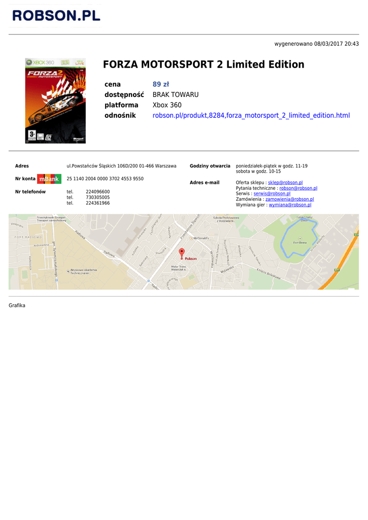 wygenerowano 08/03/2017 20:43 FORZA MOTORSPORT 2 Limited Edition cena 89 zł dostępność BRAK TOWARU platforma Xbox 360 odnośnik robson.pl/produkt,8284,forza_motorsport_2_limited_edition.html Adres ul.Powstańców Śląskich 106D/200 01-466 Warszawa Nr konta 25 1140 2004 0000 3702 4553 9550 Nr telefonów tel. 224096600 tel. 730305005 tel. 224361966 Grafika Godziny otwarcia poniedziałek-piątek w godz. 11-19 sobota w godz. 10-15 Adres e-mail Oferta sklepu : [email protected] Pytania techniczne : [email protected] Serwis : [email protected] Zamówienia : [email protected] Wymiana gier : [email protected]