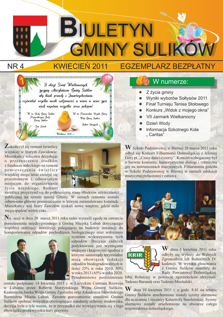BIULETYN NR 4 KWIECIEŃ 2011 EGZEMPLARZ BEZPŁATNY W numerze: Z życia gminy Wyniki wyborów Sołtysów 2011 Finał Turnieju Tenisa Stołowego Konkurs „Widok z mojego okna” VII Jarmark Wielkanocny Dzień Wody Informacja Szkolnego Koła „ Caritas” Zakończył się remont świetlicy wiejskiej w Starym Zawidowie. Mieszkańcy sołectwa decydując o przeznaczeniu środków z funduszu sołeckiego na remont pomieszczenia świetlicy wiejskiej mogą teraz cieszyć się przestronnym i odnowionym miejscem do organizowania życia wiejskiego. Remont świetlicy przyczynił się do podniesienia stanu obiektów użyteczności publicznej na terenie naszej Gminy. W ramach remontu zostało odnowione główne pomieszczenie w którym zainstalowano kominek. Mieszkańcy wsi Stary Zawidów zyskali nowe wnętrze, gdzie miło mogą spędzać wolny czas. W Szkole Podstawowej w Biernej 28 marca 2011 roku odbył się Koncert Filharmonii Dolnośląskiej z Jeleniej Góry pt. „Czasy dam i rycerzy”. Koncert wzbogacony był o barwne kostiumy, humorystyczne dialogi i rytmiczną grę na instrumentach muzycznych. Filharmonia gościła w Szkole Podstawowej w Biernej w ramach edukacji muzycznej połączonej z zabawą. Na sesji w dniu 28 marca 2011 roku radni wyrazili zgodę na zawarcie porozumienia międzygminnego z Gminą Miejską Lubań dotyczącego wspólnej realizacji inwestycji polegającej na budowie instalacji do kompostowania odpadów pochodzenia biologicznego oraz wdrożeniu systemu wykorzystania tych odpadów. Decyzja radnych podyktowana jest wymogami unijnymi i krajowymi zgodnie z którymi samorządy terytorialne mają obowiązek redukcji odpadów biodegradowalnych w ilości 25% w roku 2010, 50% w roku 2013 i 65% w roku 2020. Przedmiotowe porozumienie zostało podpisane 14 kwietnia 2011 r. w Łużyckim Centrum Rozwoju w Lubaniu przez Roberta Starzyńskiego Wójta Gminy Sulików, Kazimierza Janika Wójta Gminy Zgorzelec oraz Arkadiusza Słowińskiego Burmistrza Miasta Lubań. Zawarte porozumienie umożliwi Gminie Sulików spełniać wszystkie obowiązujące standardy ochrony środowiska, decyzja była o tyle ważna, że w przypadku nie wywiązywania się z tego obowiązku grożą wysokie kary grzywny. W dniu 3 kwietnia 2011 roku odbyły się wybory do Walnych Zgromadzeń Izb Rolniczych IV kadencji. W wyniku głosowania z Gminy Sulików mandaty do Rady Powiatowej Dolnośląskiej Izby Rolniczej w powiecie zgorzeleckim otrzymali: Tadeusz Baranek oraz Tadeusz Mochalski. W dniu 10 kwietnia 2011 r. o godz. 8:41 na terenie Gminy Sulików uruchomione zostały syreny alarmowe dla uczczenia 1 rocznicy Katastrofy Smoleńskiej. Syreny alarmowe zostały uruchomione na obszarze całego województwa dolnośląskiego. WYNIKI WYBORÓW SOŁTYSÓW 2011 O d 17 marca do 8 kwietnia 2011 roku na terenie Gminy Sulików przeprowadzone zostały wybory sołtysów i rad sołeckich. Poniżej przedstawiamy końcowe wyniki. Lp. Sołectwo Skład Rady Sołeckiej Sołtys Bierna Genowefa Wilczak-Raczak 1. Helena Twardowska. 2. Jadwiga Przybylska. 3. Kazimierz Więcław. 4. Leokadia Szuchalska. 5. Maria Krawczyk. 6. Marek Młodożeniec. 2 Mała Wieś Dolna Adam Czesnakowski 1. Magdalena Rogólska. 2. Edward Kurjański. 3. Adriana Szcza- Kozubska. 4. Justyna Cepowska. 3 Mała Wieś Górna Małgorzata Pławiak 1. Paweł Fąfara. 2. Adriana Bratek-Podhalska. 4 Miedziana Tadeusz Ostapiuk 1. Bogusław Świątek. 2. Anna Jarecka. 3. Arkadiusz Szeszko. 4. Łukasz Kowcik. 5. Justyna Duda. 6. Andrzej Sudomlak. 7. Jan Białostocki. 8. Teresa Pucińska. 1 5 Mikułowa Anna Marczyk 1. Elżbieta Wąsowska-Bodo. 2. Czesław Nowak. 3. Dorota Święcicka. 4. Artur Bernacki. 6 Radzimów Dolny Andrzej Polowy 1. Aniela Renczelewska. 2. Paweł Hajkowski. 3. Sebastian Wdowikowski. 4. Zbigniew Zieliński. 7 Radzimów Górny Ewa Wrzeszcz 1. Stanisław Wisiecki. 2. Marek Mitorski. 3. Barbara Młynek. 4. Jan Mazur. 5. Jan Jaworski. 6. Józefa Micka. 8 Skrzydlice Elżbieta Wadzicka 1. Renata Pach. 2. Tadeusz Szczurek. 9 Stary Zawidów Beata Mazur 1. Paweł Mikiszewski. 2. Stanisław Mazur. 3. Maria Kulewicz. 4. Elżbieta Mielnik. 10 Studniska Dolne Franciszek Fleszar 1. Helena Oleksiewicz. 2. Maria Stępień. 3.Teresa Robaszewska. 4. Elżbieta Kolbuch. 11 Studniska Górne Marek Biliński 1. Andrzej Radecki. 2. Piotr Daszkiewicz. 3. Andrzej Tyc. 4. Joanna Kaniuk. 5. Piotr Nachotko. 6. Stanisława Książek. 12 Sulików Andrzej Kurek 1. Tadeusz Kurasiewicz. 2. Tadeusz Mochalski. 3. Danuta Bednarz. 4. Tadeusz Baranek. 13 Wilka Zdzisław Zdzitowiecki 1. Zbigniew Rasławski. 2. Józef Gracjasz. 3. Zbigniew Bałkota. 4. Andrzej Ślipko. 14 Wilka Bory Bożena Chorąży-Uczkiewicz 1. Grażyna Szpak. 2. Lech Bartnik. 15 Wrociszów Dolny Zbigniew Rostkowski 1. Damian Humeniuk. 2. Edyta Ambroży. 16 Wrociszów Górny Ewangelis Zaras 1. Justyna Sienicka. 2. Zofia Górnicka. FINAŁ WOJEWÓDZKIEGO TURNIEJU TENISA STOŁOWEGO W SULIKOWIE W niedzielę 3 kwietnia 2011 roku w Środowiskowej Hali Sportowej w Sulikowie rozegrany został Finał Wojewódzkiego Turnieju Tenisa Stołowego XII Dolnośląskich Igrzysk LZS i Mieszkańców Wsi. Podczas uroczystego otwarcia uhonorowano Srebrną Honorową Odznaką LZS Panią Urszulę Ciupak - Dyrektor Zespołu Szkoły Podstawowej i Gimnazjum w Sulikowie, za zasługi dla sportu w środowisku wiejskim. Ogółem w turnieju wzięło udział 117 zawodniczek i zawodników, 27 osób towarzyszących oraz 10 organizatorów - razem 154 uczestników. 2 BIULETYN GMINY SULIKÓW Najlepsze zawodniczki i zawodnicy otrzymali: pierwsze trójki medale, pierwsze szóstki puchary i pamiątkowe dyplomy. W sposób szczególny wyróżniono dwóch zawodników z terenu Gminy Sulików biorących udział w turnieju, którzy zostali wyróżnieni Nagrodą Wójta Gminy Sulików. Organizatorem imprezy było Dolnośląskie Zrzeszenie LZS we Wrocławiu, Powiatowe Zrzeszenie LZS w Zgorzelcu oraz Zespół Szkoły Podstawowej i Gimnazjum w Sulikowie. Finał Wojewódzkiego Turnieju T