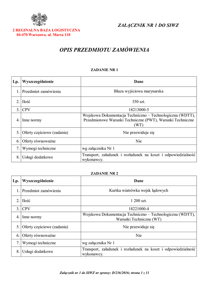 ZAŁĄCZNIK NR 1 DO SIWZ 2 REGINALNA BAZA LOGISTYCZNA 04-470 Warszawa, ul. Marsa 110 OPIS PRZEDMIOTU ZAMÓWIENIA ZADANIE NR 1 Lp. Wyszczególnienie Dane 1. Przedmiot zamówienia Bluza wyjściowa marynarska 2. Ilość 350 szt. 3. CPV 18213000-5 Wojskowa Dokumentacja Techniczno – Technologiczna (WDTT), Przedmiotowe Warunki Techniczne (PWT), Warunki Techniczne (WT) 4. Inne normy 5. Oferty częściowe (zadania) Nie przewiduje się 6. Oferty równoważne Nie 7. Wymogi techniczne wg załącznika Nr 1 Transport, załadunek i rozładunek na koszt i odpowiedzialność wykonawcy. 8. Usługi dodatkowe ZADANIE NR 2 Lp. Wyszczególnienie Dane 1. Przedmiot zamówienia Kurtka wiatrówka wojsk lądowych 2. Ilość 1 200 szt. 3. CPV 18221000-4 Wojskowa Dokumentacja Techniczno – Technologiczna (WDTT), Warunki Techniczne (WT) 4. Inne normy 5. Oferty częściowe (zadania) Nie przewiduje się 6. Oferty równoważne Nie 7. Wymogi techniczne wg załącznika Nr 1 Transport, załadunek i rozładunek na koszt i odpowiedzialność wykonawcy. 8. Usługi dodatkowe Załącznik nr 1 do SIWZ nr sprawy: D/216/2016; strona 1 z 11 ZADANIE NR 3 Lp. Wyszczególnienie Dane 1. Przedmiot zamówienia Kurtka wyjściowa sił powietrznych i marynarki wojennej 2. Ilość 900 szt. 3. CPV 18221000-4 Wojskowa Dokumentacja Techniczno – Technologiczna (WDTT), Warunki Techniczne (WT) 4. Inne normy 5. Oferty częściowe (zadania) Nie przewiduje się 6. Oferty równoważne Nie 7. Wymogi techniczne wg załącznika Nr 1 Transport, załadunek i rozładunek na koszt i odpowiedzialność wykonawcy. 8. Usługi dodatkowe ZADANIE NR 4 Lp. Wyszczególnienie Dane 1. Przedmiot zamówienia Kurtka wyjściowa wojsk lądowych 2. Ilość 3 650 szt. 3. CPV 18221000-4 Wojskowa Dokumentacja Techniczno – Technologiczna (WDTT), Warunki Techniczne (WT) 4. Inne normy 5. Oferty częściowe (zadania) Nie przewiduje się 6. Oferty równoważne Nie 7. Wymogi techniczne wg załącznika Nr 1 Transport, załadunek i rozładunek na koszt i odpowiedzialność wykonawcy. 8. Usługi dodatkowe Załącznik nr 1 do SIWZ nr sprawy: D/216/2016; strona 2 z 11 ZADANIE NR 5 Lp. Wyszczególnienie Dane 1. Przedmiot zamówienia Mundur galowy marynarki wojennej 2. Ilość 171 kpl. 3. CPV 35811300-5 Wojskowa Dokumentacja Techniczno – Technologiczna (WDTT), Warunki Techniczne (WT) 4. Inne normy 5. Oferty częściowe (zadania) Nie przewiduje się 6. Oferty równoważne Nie 7. Wymogi techniczne wg załącznika Nr 1 Transport, załadunek i rozładunek na koszt i odpowiedzialność wykonawcy. 8. Usługi dodatkowe ZADANIE NR 6 Lp. Wyszczególnienie Dane 1. Przedmiot zamówienia Mundur galowy sił powietrznych 2. Ilość 402 kpl. 3. CPV 35811300-5 Wojskowa Dokumentacja Techniczno – Technologiczna (WDTT), Warunki Techniczne (WT) 4. Inne normy 5. Oferty częściowe (zadania) Nie przewiduje się 6. Oferty równoważne Nie 7. Wymogi techniczne wg załącznika Nr 1 Transport, załadunek i rozładunek na koszt i odpowiedzialność wykonawcy. 8. Usługi dodatkowe ZADANIE NR 7 Lp. Wyszczególnienie Dane 1. Przedmiot zamówienia Mundur galowy wojsk lądowych Zamówienie gwarantowane – 1 957 kpl.. Zamówienie opcjonalne – 543 kpl. Razem – 2 500 kpl.. 35811300-5 Wojskowa Dokumentacja Techniczno – Technologiczna (WDTT). Warunki Techniczne (WT) 2. Ilość 3. CPV 4. Inne normy 5. Oferty częściowe (zadania) Nie przewiduje się Załącznik nr 1 do SIWZ nr sprawy: D/216/2016; strona 3 z 11 6. Oferty równoważne Nie 7. Wymogi techniczne wg załącznika Nr 1 Transport, załadunek i rozładunek na koszt i odpowiedzialność wykonawcy. 8. Usługi dodatkowe ZADANIE NR 8 Lp. Wyszczególnienie Dane 1. Przedmiot zamówienia Mundur wyjściowy letni marynarki wojennej 2. Ilość 100 kpl. 3. CPV 35811300-5 Wojskowa Dokumentacja Techniczno – Technologiczna (WDTT). Warunki Techniczne (WT), Przedmiotowe Warunki Techniczne (PWT). 4. Inne normy 5. Oferty częściowe (zadania) Nie przewiduje się 6. Oferty równoważne Nie 7. Wymogi techniczne wg załącznika Nr 1 Transport, załadunek i rozładunek na koszt i odpowiedzialność wykonawcy. 8. Usługi dodatkowe ZADANIE NR 9 Lp. Wyszczególnienie Dane 1. Przedmiot zamówienia Mundur wyjściowy letni wojsk lądowych 2. Ilość 400 kpl. 3. CPV 35811300-5 Wojskowa Dokumentacja Techniczno – Technologiczna (WDTT). Warunki Techniczne (WT), Przedmiotowe Warunki Techniczne (PWT). 4. Inne normy 5. Oferty częściowe (zadania) Nie przewiduje się 6. Oferty równoważne Nie 7. Wymogi techniczne wg załącznika Nr 1 Transport, załadunek i rozładunek na koszt i odpowiedzialność wykonawcy. 8. Usługi dodatkowe Załącznik nr 1 do SIWZ nr sprawy: D/216/2016; strona 4 z 11 ZADANIE NR 10 Lp. Wyszczególnienie Dane 1. Przedmiot zamówienia Mundur wyjściowy marynarki wojennej 2. Ilość 100 kpl. 3. CPV 35811300-5 Wojskowa Dokumentacja Techniczno – Technologiczna (WDTT). Warunki Techniczne (WT), Przedmiotowe Warunki Techniczne (PWT). 4. Inne normy 5. Oferty częściowe (zadania) Nie przewiduje się 6. Oferty równoważne Nie 7. Wymogi techniczne wg załącznika Nr 1 Transport, załadunek i rozładunek na koszt i odpowiedzialność wykonawcy. 8. Usługi dodatkowe ZADANIE NR 11 Lp. Wyszczególnienie Dane 1. Przedmiot zamówienia Mundur wyjściowy sił powietrznych 2. Ilość 150 kpl. 3. CPV 35811300-5 Wojskowa Dokumentacja Techniczno – Technologiczna (WDTT). Warunki Techniczne (WT), Przedmiotowe Warunki Techniczne (PWT). 4. Inne normy 5. Oferty częściowe (zadania) Nie przewiduje się 6. Oferty równoważne Nie 7. Wymogi techniczne wg załącznika Nr 1 Transport, załadunek i rozładunek na koszt i odpowiedzialność wykonawcy. 8. Usługi dodatkowe Załącznik nr 1 do SIWZ nr sprawy: D/216/2016; strona 5 z 11 ZADANIE NR 12 Lp. Wyszczególnienie Dane 1. Przedmiot zamówienia Mundur wyjściowy wojsk lądowych 2. Ilość 400 kpl. 3. CPV 35811300-5 Wojskowa Dokumentacja Techniczno – Technologiczna (WDTT). Warunki Techniczne (WT), Przedmiotowe Warunki Techniczne (PW