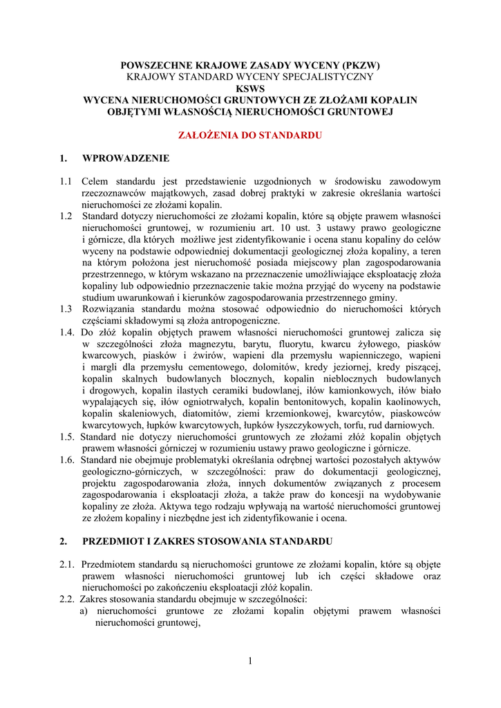 POWSZECHNE KRAJOWE ZASADY WYCENY (PKZW) KRAJOWY STANDARD WYCENY SPECJALISTYCZNY KSWS WYCENA NIERUCHOMOŚCI GRUNTOWYCH ZE ZŁOŻAMI KOPALIN OBJĘTYMI WŁASNOŚCIĄ NIERUCHOMOŚCI GRUNTOWEJ ZAŁOŻENIA DO STANDARDU 1. WPROWADZENIE 1.1 Celem standardu jest przedstawienie uzgodnionych w środowisku zawodowym rzeczoznawców majątkowych, zasad dobrej praktyki w zakresie określania wartości nieruchomości ze złożami kopalin. 1.2 Standard dotyczy nieruchomości ze złożami kopalin, które są objęte prawem własności nieruchomości gruntowej, w rozumieniu art. 10 ust. 3 ustawy prawo geologiczne i górnicze, dla których możliwe jest zidentyfikowanie i ocena stanu kopaliny do celów wyceny na podstawie odpowiedniej dokumentacji geologicznej złoża kopaliny, a teren na którym położona jest nieruchomość posiada miejscowy plan zagospodarowania przestrzennego, w którym wskazano na przeznaczenie umożliwiające eksploatację złoża kopaliny lub odpowiednio przeznaczenie takie można przyjąć do wyceny na podstawie studium uwarunkowań i kierunków zagospodarowania przestrzennego gminy. 1.3 Rozwiązania standardu można stosować odpowiednio do nieruchomości których częściami składowymi są złoża antropogeniczne. 1.4. Do złóż kopalin objętych prawem własności nieruchomości gruntowej zalicza się w szczególności złoża magnezytu, barytu, fluorytu, kwarcu żyłowego, piasków kwarcowych, piasków i żwirów, wapieni dla przemysłu wapienniczego, wapieni i margli dla przemysłu cementowego, dolomitów, kredy jeziornej, kredy piszącej, kopalin skalnych budowlanych blocznych, kopalin nieblocznych budowlanych i drogowych, kopalin ilastych ceramiki budowlanej, iłów kamionkowych, iłów biało wypalających się, iłów ogniotrwałych, kopalin bentonitowych, kopalin kaolinowych, kopalin skaleniowych, diatomitów, ziemi krzemionkowej, kwarcytów, piaskowców kwarcytowych, łupków kwarcytowych, łupków łyszczykowych, torfu, rud darniowych. 1.5. Standard nie dotyczy nieruchomości gruntowych ze złożami złóż kopalin objętych prawem własności górniczej w rozumieniu ustawy prawo geologiczne i górnicze. 1.6. Standard nie obejmuje problematyki określania odrębnej wartości pozostałych aktywów geologiczno-górniczych, w szczególności: praw do dokumentacji geologicznej, projektu zagospodarowania złoża, innych dokumentów związanych z procesem zagospodarowania i eksploatacji złoża, a także praw do koncesji na wydobywanie kopaliny ze złoża. Aktywa tego rodzaju wpływają na wartość nieruchomości gruntowej ze złożem kopaliny i niezbędne jest ich zidentyfikowanie i ocena. 2. PRZEDMIOT I ZAKRES STOSOWANIA STANDARDU 2.1. Przedmiotem standardu są nieruchomości gruntowe ze złożami kopalin, które są objęte prawem własności nieruchomości gruntowej lub ich części składowe oraz nieruchomości po zakończeniu eksploatacji złóż kopalin. 2.2. Zakres stosowania standardu obejmuje w szczególności: a) nieruchomości gruntowe ze złożami kopalin objętymi prawem własności nieruchomości gruntowej, 1 b) nieruchomości gruntowe ze złożami kopalin jako przedmiot użytkowania wieczystego, c) nieruchomości gruntowe ze złożami kopalin jako przedmiot ograniczonych praw rzeczowych lub obciążonych prawami zobowiązaniowymi, d) części nieruchomości gruntowych, które są lub mogą być związane z eksploatacją złoża (działalnością górniczą), np.: obszar górniczy, teren górniczy, części nieruchomości oznaczone w ewidencji gruntów i budynków jako użytki kopalne lub inne części wyodrębniane ze względu na sposób użytkowania, e) złoża kopalin stanowiące część składową nieruchomości gruntowej. 2.3. Jeżeli z przepisów prawa, umowy z zamawiającym lub innego zamówienia wynika, że z zakresu wyceny wyłączana jest określona część składowa nieruchomości (w rozumieniu art. 48 kodeksu cywilnego), przynależność, pożytek lub grunt, to powinno to być wyraźnie zaznaczone i uzasadnione w operacie szacunkowym. 2.4. Wycena może dotyczyć także określenia wartości szkód poczynionych na nieruchomości ze złożem kopaliny lub ograniczenia jej własności w zakresie korzystania, czerpania pożytków i rozporządzania. 2.5. Określenia wartości nieruchomości ze złożem kopaliny składającej się z wyodrębnionych części o różnym zawansowaniu realizacji projektu geologiczno-górniczego oraz o wielu sposobach użytkowania, można dokonać poprzez wydzielenie funkcjonalnych części celem ich odrębnej wyceny w granicach danej nieruchomości. Nieruchomości tego rodzaju często charakteryzują się dużym zróżnicowaniem występujących na nich użytków gruntowych, obiektów budowlanych i ich funkcji oraz ich stanu technicznoużytkowego, jak również stanu zagospodarowania, w tym istnienia części nieruchomości ze złożami kopalin Podział nieruchomości na funkcjonalne części powinien uwzględniać granice geodezyjne, granice planistyczne lub granice wynikające z innych regulacji prawnych albo granice ustalone przez rzeczoznawcę majątkowego dla potrzeb wyceny. 3. OKREŚLANIE WARTOŚCI RYNKOWEJ NIERUCHOMOŚCI ZE ZŁOŻAMI KOPALIN 3.1. Uwagi wstępne 3.1.1. Wartość rynkową nieruchomości ze złożami kopalin określa się w podejściu porównawczym, dochodowym lub mieszanym. 3.1.2 Przy wyborze właściwego podejścia, metody i techniki szacowania nieruchomości ze złożami kopalin rekomenduje się uwzględnienie stanu nieruchomości odnoszonego do etapu realizacji projektu geologiczno-górniczego. Etapami realizacji projektu geologiczno-górniczego są odpowiednio stany nieruchomości: po rozpoznaniu i udokumentowaniu złoża, udostępniania złoża, eksploatacji złoża, likwidacji zakładu górniczego i rekultywacji. 3.1.3. Uregulowania niniejszego standardu nie obejmują aktywów geologiczno-górniczych powstałych na etapie poszukiwania złoża, nawet jeśli dotyczą one wycenianej nieruchomości.