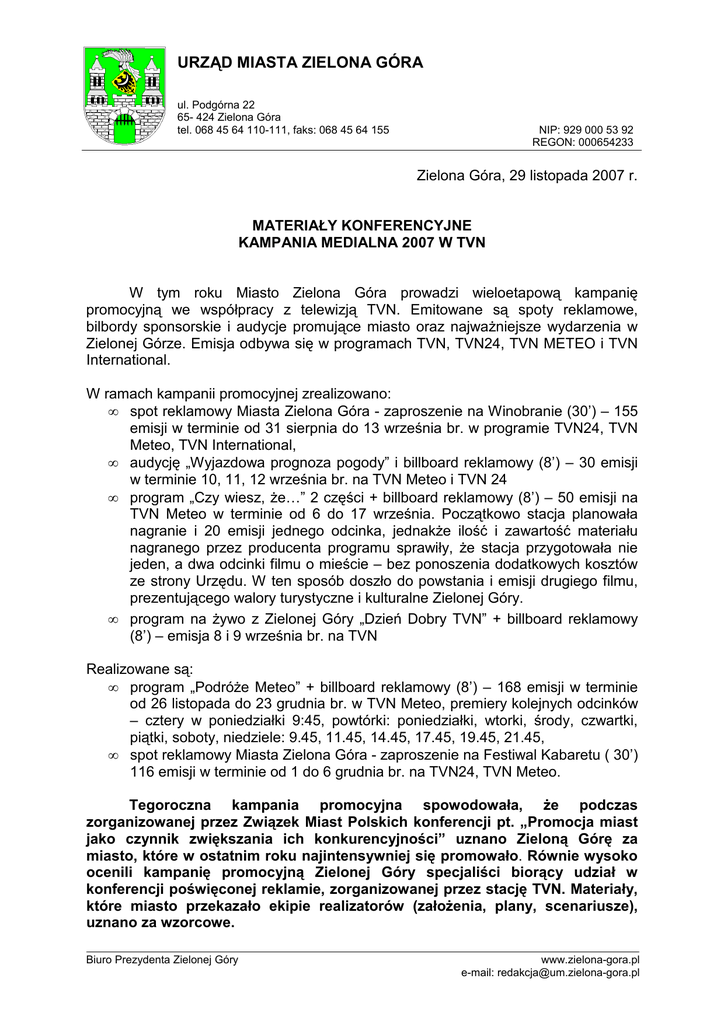 URZĄD MIASTA ZIELONA GÓRA ul. Podgórna 22 65- 424 Zielona Góra tel. 068 45 64 110-111, faks: 068 45 64 155 NIP: 929 000 53 92 REGON: 000654233 Zielona Góra, 29 listopada 2007 r. MATERIAŁY KONFERENCYJNE KAMPANIA MEDIALNA 2007 W TVN W tym roku Miasto Zielona Góra prowadzi wieloetapową kampanię promocyjną we współpracy z telewizją TVN. Emitowane są spoty reklamowe, bilbordy sponsorskie i audycje promujące miasto oraz najwaŜniejsze wydarzenia w Zielonej Górze. Emisja odbywa się w programach TVN, TVN24, TVN METEO i TVN International. W ramach kampanii promocyjnej zrealizowano: • spot reklamowy Miasta Zielona Góra - zaproszenie na Winobranie (30’) – 155 emisji w terminie od 31 sierpnia do 13 września br. w programie TVN24, TVN Meteo, TVN International, • audycję „Wyjazdowa prognoza pogody” i billboard reklamowy (8’) – 30 emisji w terminie 10, 11, 12 września br. na TVN Meteo i TVN 24 • program „Czy wiesz, Ŝe…” 2 części + billboard reklamowy (8’) – 50 emisji na TVN Meteo w terminie od 6 do 17 września. Początkowo stacja planowała nagranie i 20 emisji jednego odcinka, jednakŜe ilość i zawartość materiału nagranego przez producenta programu sprawiły, Ŝe stacja przygotowała nie jeden, a dwa odcinki filmu o mieście – bez ponoszenia dodatkowych kosztów ze strony Urzędu. W ten sposób doszło do powstania i emisji drugiego filmu, prezentującego walory turystyczne i kulturalne Zielonej Góry. • program na Ŝywo z Zielonej Góry „Dzień Dobry TVN” + billboard reklamowy (8’) – emisja 8 i 9 września br. na TVN Realizowane są: • program „PodróŜe Meteo” + billboard reklamowy (8’) – 168 emisji w terminie od 26 listopada do 23 grudnia br. w TVN Meteo, premiery kolejnych odcinków – cztery w poniedziałki 9:45, powtórki: poniedziałki, wtorki, środy, czwartki, piątki, soboty, niedziele: 9.45, 11.45, 14.45, 17.45, 19.45, 21.45, • spot reklamowy Miasta Zielona Góra - zaproszenie na Festiwal Kabaretu ( 30’) 116 emisji w terminie od 1 do 6 grudnia br. na TVN24, TVN Meteo. Tegoroczna kampania promocyjna spowodowała, Ŝe podczas zorganizowanej przez Związek Miast Polskich konferencji pt. „Promocja miast jako czynnik zwiększania ich konkurencyjności” uznano Zieloną Górę za miasto, które w ostatnim roku najintensywniej się promowało. Równie wysoko ocenili kampanię promocyjną Zielonej Góry specjaliści biorący udział w konferencji poświęconej reklamie, zorganizowanej przez stację TVN. Materiały, które miasto przekazało ekipie realizatorów (załoŜenia, plany, scenariusze), uznano za wzorcowe. Biuro Prezydenta Zielonej Góry www.zielona-gora.pl e-mail: [email protected]