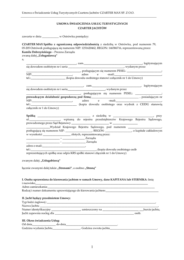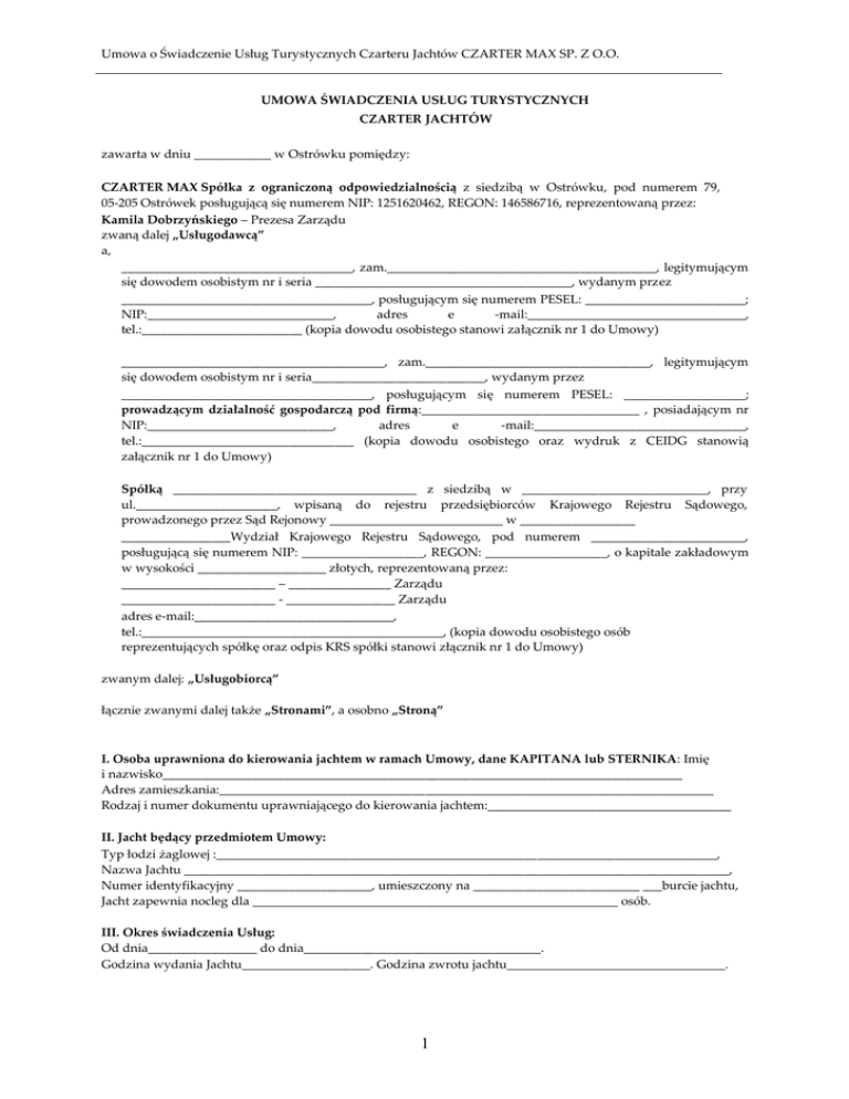 Umowa o Świadczenie Usług Turystycznych Czarteru Jachtów CZARTER MAX SP. Z O.O. UMOWA ŚWIADCZENIA USŁUG TURYSTYCZNYCH CZARTER JACHTÓW zawarta w dniu ____________ w Ostrówku pomiędzy: CZARTER MAX Spółka z ograniczoną odpowiedzialnością z siedzibą w Ostrówku, pod numerem 79, 05-205 Ostrówek posługującą się numerem NIP: 1251620462, REGON: 146586716, reprezentowaną przez: Kamila Dobrzyńskiego – Prezesa Zarządu zwaną dalej „Usługodawcą” a, ____________________________________, zam.__________________________________________, legitymującym się dowodem osobistym nr i seria ________________________________________, wydanym przez _______________________________________, posługującym się numerem PESEL: _________________________; NIP:_____________________________, adres e -mail:__________________________________, tel.:_________________________ (kopia dowodu osobistego stanowi załącznik nr 1 do Umowy) _________________________________________, zam.___________________________________, legitymującym się dowodem osobistym nr i seria___________________________, wydanym przez _______________________________________, posługującym się numerem PESEL: ___________________; prowadzącym działalność gospodarczą pod firmą:__________________________________ , posiadającym nr NIP:_____________________________, adres e -mail:_________________________________, tel.:_________________________________ (kopia dowodu osobistego oraz wydruk z CEIDG stanowią załącznik nr 1 do Umowy) Spółką ______________________________________ z siedzibą w _____________________________, przy ul.______________________, wpisaną do rejestru przedsiębiorców Krajowego Rejestru Sądowego, prowadzonego przez Sąd Rejonowy ___________________________ w __________________ _________________Wydział Krajowego Rejestru Sądowego, pod numerem ________________________, posługującą się numerem NIP: ___________________, REGON: ___________________, o kapitale zakładowym w wysokości ____________________ złotych, reprezentowaną przez: ________________________ – ________________ Zarządu ________________________ - _________________ Zarządu adres e-mail:_______________________________, tel.:_______________________________________________, (kopia dowodu osobistego osób reprezentujących spółkę oraz odpis KRS spółki stanowi złącznik nr 1 do Umowy) zwanym dalej: „Usługobiorcą” łącznie zwanymi dalej także „Stronami”, a osobno „Stroną” I. Osoba uprawniona do kierowania jachtem w ramach Umowy, dane KAPITANA lub STERNIKA: Imię i nazwisko_________________________________________________________________________________ Adres zamieszkania:_____________________________________________________________________________ Rodzaj i numer dokumentu uprawniającego do kierowania jachtem:______________________________________ II. Jacht będący przedmiotem Umowy: Typ łodzi żaglowej :______________________________________________________________________________, Nazwa Jachtu _____________________________________________________________________________________, Numer identyfikacyjny _____________________, umieszczony na __________________________ ___burcie jachtu, Jacht zapewnia nocleg dla _________________________________________________________ osób. III. Okres świadczenia Usług: Od dnia_________________ do dnia_____________________________________. Godzina wydania Jachtu____________________. Godzina zwrotu jachtu__________________________________. 1 Umowa o Świadczenie Usług Turystycznych Czarteru Jachtów CZARTER MAX SP. Z O.O. IV. Wynagrodzenie: Usługobiorca zobowiązuje się do zapłaty na rzecz Usługodawcy wynagrodzenia w łącznej kwocie _______________ zł (słownie:______________________________) (dalej jako "Wynagrodzenie"). V. Postanowienia Umowy: § 1. Na podstawie niniejszej umowy Usługodawca będzie świadczył na rzecz Usługobiorcy usługi polegające na: a) wyczarterowaniu jachtu opisanego w pkt II Umowy (dalej jako „Jacht”) w celach turystycznych w obszarze szlaków żaglowych na terenie Wielkich Jezior Mazurskich, na warunkach określonych w niniejszej Umowie oraz w Ogólnych Warunkach Umowy (dalej jako „OWU”), stanowiących załącznik nr 3 do Umowy; b) zapewnieniu opiekuna rejsu, świadczącego usługi wskazane w OWU; c) zapewnieniu pomocy technicznej na zasadach określonych w OWU; d) zapewnieniu noclegu na Jachcie; e) zapewnieniu miejsca postojowego dla Jachtu w Przystani na Ptasiej Wyspie z możliwością poboru prądu, wody, korzystania z sieci wi-fi, sanitariatów bez dodatkowych dopłat; f) udzieleniu 10 % rabatu na usługi hotelowe w Hotelu Mikołajki po okazaniu potwierdzenia rezerwacji, niniejszej Umowy lub biletu z Przystani na Ptasiej Wyspie; g) sprzątaniu Jachtu przed i po zwrocie i zwolnieniu Usługobiorcy z obowiązku zwrotu uprzątniętego Jachtu; h) świadczeniu innych usług, wymienionych w Ofercie Przystani na Ptasiej Wyspie oraz Cenniku, stanowiącym załącznik nr 4 do Umowy, za ceny w nim wskazane, w szczególności usług bagażowych, zarobienie zakupów i dostarczenie ich na Jacht, zapewnienie sternika posiadającego odpowiednie kwalifikacje i uprawnienia, tankowanie Jachtu w okresie obowiązywania Umowy, wypożyczenie kompletu pościeli i ręczników, sprzątanie wnętrza Jachtu w okresie obowiązywania Umowy, uzupełnienie chemii na Jachcie. § 2. Usługi, o których mowa w § 1 świadczone będą w okresie wskazanym w pkt. III Umowy (Okres Świadczenia Usług). Wydanie i zwrot Jachtu nastąpi w Przystani na Ptasiej Wyspie. O ile w pkt. III Umowy nie postanowiono inaczej, Wydanie Jachtu każdorazowo odbywał się będzie od godz. 15:00 w pierwszym dniu Okresu Świadczenia Usług, zaś jego zwrot do godz. 10:00 w ostatnim dniu Okresu Świadczenia Usług. § 3. 1. Z tytułu świadczenia usług, o których mowa w pkt V § 1 Umowy, Usługobiorca zobowiązuje się do zapłaty na rzecz Usługodawcy Wynagrodzenia, płatnego wed