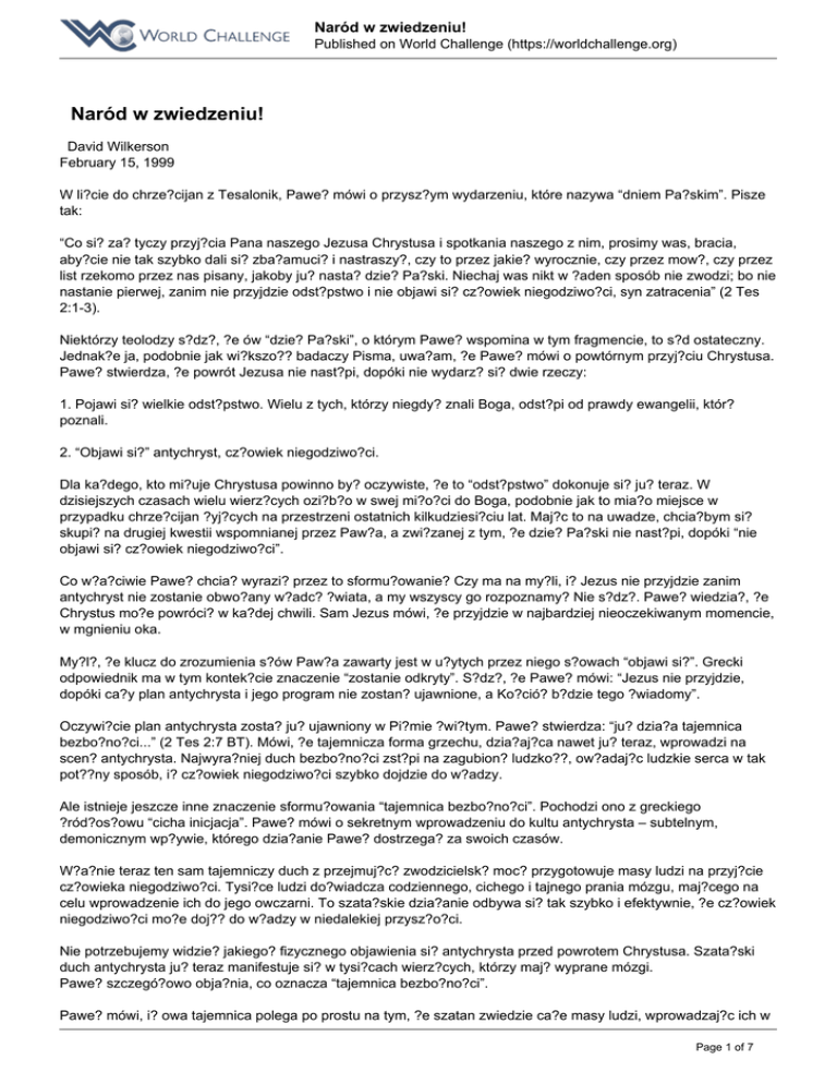 Naród w zwiedzeniu! Published on World Challenge (https://worldchallenge.org) Naród w zwiedzeniu! David Wilkerson February 15, 1999 W li?cie do chrze?cijan z Tesalonik, Pawe? mówi o przysz?ym wydarzeniu, które nazywa “dniem Pa?skim”. Pisze tak: “Co si? za? tyczy przyj?cia Pana naszego Jezusa Chrystusa i spotkania naszego z nim, prosimy was, bracia, aby?cie nie tak szybko dali si? zba?amuci? i nastraszy?, czy to przez jakie? wyrocznie, czy przez mow?, czy przez list rzekomo przez nas pisany, jakoby ju? nasta? dzie? Pa?ski. Niechaj was nikt w ?aden sposób nie zwodzi; bo nie nastanie pierwej, zanim nie przyjdzie odst?pstwo i nie objawi si? cz?owiek niegodziwo?ci, syn zatracenia” (2 Tes 2:1-3). Niektórzy teolodzy s?dz?, ?e ów “dzie? Pa?ski”, o którym Pawe? wspomina w tym fragmencie, to s?d ostateczny. Jednak?e ja, podobnie jak wi?kszo?? badaczy Pisma, uwa?am, ?e Pawe? mówi o powtórnym przyj?ciu Chrystusa. Pawe? stwierdza, ?e powrót Jezusa nie nast?pi, dopóki nie wydarz? si? dwie rzeczy: 1. Pojawi si? wielkie odst?pstwo. Wielu z tych, którzy niegdy? znali Boga, odst?pi od prawdy ewangelii, któr? poznali. 2. “Objawi si?” antychryst, cz?owiek niegodziwo?ci. Dla ka?dego, kto mi?uje Chrystusa powinno by? oczywiste, ?e to “odst?pstwo” dokonuje si? ju? teraz. W dzisiejszych czasach wielu wierz?cych ozi?b?o w swej mi?o?ci do Boga, podobnie jak to mia?o miejsce w przypadku chrze?cijan ?yj?cych na przestrzeni ostatnich kilkudziesi?ciu lat. Maj?c to na uwadze, chcia?bym si? skupi? na drugiej kwestii wspomnianej przez Paw?a, a zwi?zanej z tym, ?e dzie? Pa?ski nie nast?pi, dopóki “nie objawi si? cz?owiek niegodziwo?ci”. Co w?a?ciwie Pawe? chcia? wyrazi? przez to sformu?owanie? Czy ma na my?li, i? Jezus nie przyjdzie zanim antychryst nie zostanie obwo?any w?adc? ?wiata, a my wszyscy go rozpoznamy? Nie s?dz?. Pawe? wiedzia?, ?e Chrystus mo?e powróci? w ka?dej chwili. Sam Jezus mówi, ?e przyjdzie w najbardziej nieoczekiwanym momencie, w mgnieniu oka. My?l?, ?e klucz do zrozumienia s?ów Paw?a zawarty jest w u?ytych przez niego s?owach “objawi si?”. Grecki odpowiednik ma w tym kontek?cie znaczenie “zostanie odkryty”. S?dz?, ?e Pawe? mówi: “Jezus nie przyjdzie, dopóki ca?y plan antychrysta i jego program nie zostan? ujawnione, a Ko?ció? b?dzie tego ?wiadomy”. Oczywi?cie plan antychrysta zosta? ju? ujawniony w Pi?mie ?wi?tym. Pawe? stwierdza: “ju? dzia?a tajemnica bezbo?no?ci...” (2 Tes 2:7 BT). Mówi, ?e tajemnicza forma grzechu, dzia?aj?ca nawet ju? teraz, wprowadzi na scen? antychrysta. Najwyra?niej duch bezbo?no?ci zst?pi na zagubion? ludzko??, ow?adaj?c ludzkie serca w tak pot??ny sposób, i? cz?owiek niegodziwo?ci szybko dojdzie do w?adzy. Ale istnieje jeszcze inne znaczenie sformu?owania “tajemnica bezbo?no?ci”. Pochodzi ono z greckiego ?ród?os?owu “cicha inicjacja”. Pawe? mówi o sekretnym wprowadzeniu do kultu antychrysta – subtelnym, demonicznym wp?ywie, którego dzia?anie Pawe? dostrzega? za swoich czasów. W?a?nie teraz ten sam tajemniczy duch z przejmuj?c? zwodzicielsk? moc? przygotowuje masy ludzi na przyj?cie cz?owieka niegodziwo?ci. Tysi?ce ludzi do?wiadcza codziennego, cichego i tajnego prania mózgu, maj?cego na celu wprowadzenie ich do jego owczarni. To szata?skie dzia?anie odbywa si? tak szybko i efektywnie, ?e cz?owiek niegodziwo?ci mo?e doj?? do w?adzy w niedalekiej przysz?o?ci. Nie potrzebujemy widzie? jakiego? fizycznego objawienia si? antychrysta przed powrotem Chrystusa. Szata?ski duch antychrysta ju? teraz manifestuje si? w tysi?cach wierz?cych, którzy maj? wyprane mózgi. Pawe? szczegó?owo obja?nia, co oznacza “tajemnica bezbo?no?ci”. Pawe? mówi, i? owa tajemnica polega po prostu na tym, ?e szatan zwiedzie ca?e masy ludzi, wprowadzaj?c ich w Page 1 of 7 Naród w zwiedzeniu! Published on World Challenge (https://worldchallenge.org) otch?a? bezprawia! U?yte przez Paw?a greckie s?owo, przet?umaczone w tym fragmencie jako “bezbo?no??”, oznacza dos?ownie “bezprawie”. Tak wi?c tajemnica ta ?ci?le zwi?zana jest z bezprawiem – oznacza to, ?e t?umy b?d? post?powa? nie respektuj?c prawa ani ?adnych ogranicze?. Jednak?e to bezprawie nie jest tylko buntem przeciwko w?adzy sprawowanej przez cz?owieka. Tu nie chodzi o bunt przeciwko w?adzy cywilnej, dokonywanie rabunków, gwa?ty czy morderstwa. Te rzeczy wzbudzaj? Bo?y gniew, ale tajemnica bezprawia si?ga daleko g??biej. Bezprawie jest jawnym odrzuceniem prawdy, która jest w Chrystusie – porzuceniem ?wi?tego S?owa Bo?ego i przykaza?. To jest bunt przeciwko ograniczeniom wynikaj?cym z Biblii! Duch bezprawia panoszy si? dzisiaj w naszym narodzie. To w?a?nie ta si?a stoi za ustawodawstwem, które zmierza do usuni?cia Boga z naszego spo?ecze?stwa. Jest to ten sam duch, którego szatan u?y?, by zwie?? Ew?. Powiedzia? jej dos?ownie tak: “Bóg jest pob?a?liwy – na pewno nie ukarze ci? za niepos?usze?stwo. Mo?esz zje?? owoc i pofolgowa? sobie w swej po??dliwo?ci. Nie b?dziesz musia?a za to zap?aci?!”. To by?o ?miertelne k?amstwo prosto z piek?a. Szatan u?ywa dzi? tego samego k?amstwa wobec chrze?cijan, aby umocni? sw? tajemnic? bezprawia. Dzie? za dniem przekonuje masy wierz?cych, ?e mog? folgowa? sobie w swych grzechach i nie ponosi? za nie jakichkolwiek konsekwencji. To jest demoniczny plan przekr?cania ewangelii ?aski i obracania jej w rozpustne przes?anie! Co tragiczne, wielu letnich chrze?cijan stale ulega temu duchowi bezprawia. Niektórzy ju? zostali wprowadzeni w kult antychrysta. S? ju? przygotowani do zaakceptowania cz?owieka niegodziwo?ci, kiedy ten pojawi si? na scenie, czyni?c cuda i rozwi?zuj?c problemy. Mo?e my?lisz: “Nigdy nie da?bym si? tak og?upi?, by pój?? za antychrystem”. Ale Pawe? mówi, ?e antychryst dojdzie do w?adzy, poniewa? ludzie b?d? za?lepieni i zwiedzeni przez w?asne grzechy: “...za spraw? szatana z wszelk? moc?, w?ród znaków i rzekomych cudów, i w?ród wszelkich podst?pnych oszustw wobec tych, którzy maj? zgin??, pon