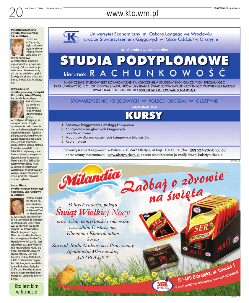 20 GAZETA OLSZTYŃSKA Małgorzata Rudziewicz dyrektor Oddziału Pekao S.A. w Olsztynie Urodzona w Olsztynie, wykształcenie wyższe ekonomiczne. Pracowała jako dyrektor handlowy w olsztyńskim oddziale ogólnopolskiej grupy medialnej. Od siedmiu lat jest związana z bankowością, od ponad dwóch lat pełni funkcję dyrektora oddziału banku Pekao S.A. w Olsztynie. Helena Rusiecka dyrektor generalny, założyciel Olsztyńskiej Szkoły Wyższej im. Józefa Rusieckiego Jest absolwentką Wydziału Pedagogicznego Wyższej Szkoły Pedagogicznej w Olsztynie. W ciągu jej kadencji uczelnia zdobyła uprawnienia do kształcenia na studiach magisterskich na trzech wydziałach: fizjoterapii, pedagogicznym i wychowania fizycznego. Od 2000 roku, czyli od momentu, kiedy uczelnią kieruje Helena Rusiecka, powstała m.in. biblioteka z czytelnią, dwie hale sportowe, sale gimnastyczne, korty do squasha i tenisa, stadion lekkoatletyczny wyposażony m.in. w boisko ze sztuczną nawierzchnią i 25-metrowa pływalnia. Zainteresowania: rodzina, podróże, praca na działce, czytanie. Janusz Sikora dyrektor Centrum Korporacyjnego Banku City Handlowy w Olsztynie 52 lata, magister, studia na kierunku handel zagraniczny w Szkole Głównej Handlowej w Warszawie oraz we Francji na Universite de Sciences Techniques de Lille. Pracował w Michelin SA, Metalexport SA, Polskiej Izbie Handlu Zagranicznego. Obecnie dyrektor Centrum Korporacyjnego Banku City Handlowy w Olsztynie. Jest członkiem zarządu Warmińsko-Mazurskiego Klubu Biznesu, prezesem Stowarzyszenia Mazury Golf and Country Club w Naterkach, a także przewodniczącym Komisji Programowo-Statutowej Polskiego Związku Golfa oraz koordynatorem regionalnym Fundacji Bankowej im. Leopolda Kronenberga. Kto jest kim w biznesie DZIENNIK ELBLĄSKI PONIEDZIAŁEK 29.03.2010 www.kto.wm.pl Uniwersytet Ekonomiczny im. Oskara Langego we Wrocławiu wraz ze Stowarzyszeniem Księgowych w Polsce Oddział w Olsztynie uruchamia dwusemestralne STUDIA PODYPLOMOWE kierunek: R A C H U N K O W O Ś Ć UKOŃCZENIE STUDIÓW JEST RÓWNOWAŻNE Z UKOŃCZENIEM STUDIÓW EKONOMICZNYCH SPECJALNOŚĆ RACHUNKOWOŚĆ, CO JEST JEDNYM Z WARUNKÓW UZYSKANIA ŚWIADECTWA KWALIFIKACYJNEGO POTWIERDZAJĄCEGO KWALIFIKACJE NIEZBĘDNE DO USŁUGOWEGO PROWADZENIA KSIĄG. STOWARZYSZENIE KSIĘGOWYCH W POLSCE ODDZIAŁ W OLSZTYNIE zaprasza na: KURSY 1. 2. 3. 4. 5. Podstawy księgowości z obsługą komputera Kandydatów na głównych księgowych Podatki w firmie Modułowy dla samodzielnych księgowych bilansistów Kadry i płace Stowarzyszenie Księgowych w Polsce - 10-547 Olsztyn, ul.Kajki 10/12, tel./fax: (89) 527-90-50 lub 60 adres strony internetowej: www.olsztyn.skwp.pl poczta elektroniczna (e-mail): [email protected] 123710otbr-a -C Pełnych radości, pokoju e i w o r d z o j a b Zad święta na Świąt Wielkiej Nocy oraz wiele pomyślności i sukcesów wszystkim Dostawcom, Klientom i Kontrahentom życzą Zarząd, Rada Nadzorcza i Pracownicy Spółdzielni Mleczarskiej „OSTROŁĘKA” ka 1 s w ul. Ła roleka.pl , a k ę st stroł ml-o O 07-400 -ostroleka.pl ml sml@s e-mail: s www. 46910otba-b-M