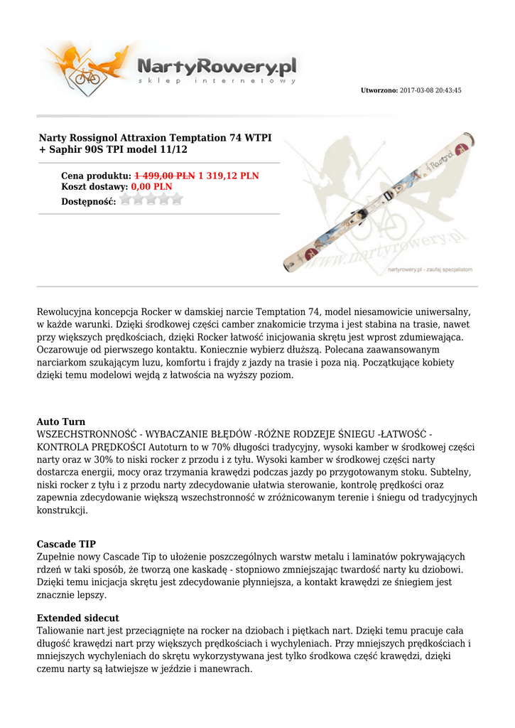 Utworzono: 2017-03-08 20:43:45 Narty Rossignol Attraxion Temptation 74 WTPI + Saphir 90S TPI model 11/12 Cena produktu: 1 499,00 PLN 1 319,12 PLN Koszt dostawy: 0,00 PLN Dostępność: Rewolucyjna koncepcja Rocker w damskiej narcie Temptation 74, model niesamowicie uniwersalny, w każde warunki. Dzięki środkowej części camber znakomicie trzyma i jest stabina na trasie, nawet przy większych prędkościach, dzięki Rocker łatwość inicjowania skrętu jest wprost zdumiewająca. Oczarowuje od pierwszego kontaktu. Koniecznie wybierz dłuższą. Polecana zaawansowanym narciarkom szukającym luzu, komfortu i frajdy z jazdy na trasie i poza nią. Początkujące kobiety dzięki temu modelowi wejdą z łatwościa na wyższy poziom. Auto Turn WSZECHSTRONNOŚĆ - WYBACZANIE BŁĘDÓW -RÓŻNE RODZEJE ŚNIEGU -ŁATWOŚĆ KONTROLA PRĘDKOŚCI Autoturn to w 70% długości tradycyjny, wysoki kamber w środkowej części narty oraz w 30% to niski rocker z przodu i z tyłu. Wysoki kamber w środkowej części narty dostarcza energii, mocy oraz trzymania krawędzi podczas jazdy po przygotowanym stoku. Subtelny, niski rocker z tyłu i z przodu narty zdecydowanie ułatwia sterowanie, kontrolę prędkości oraz zapewnia zdecydowanie większą wszechstronność w zróżnicowanym terenie i śniegu od tradycyjnych konstrukcji. Cascade TIP Zupełnie nowy Cascade Tip to ułożenie poszczególnych warstw metalu i laminatów pokrywających rdzeń w taki sposób, że tworzą one kaskadę - stopniowo zmniejszając twardość narty ku dziobowi. Dzięki temu inicjacja skrętu jest zdecydowanie płynniejsza, a kontakt krawędzi ze śniegiem jest znacznie lepszy. Extended sidecut Taliowanie nart jest przeciągnięte na rocker na dziobach i piętkach nart. Dzięki temu pracuje cała długość krawędzi nart przy większych prędkościach i wychyleniach. Przy mniejszych prędkościach i mniejszych wychyleniach do skrętu wykorzystywana jest tylko środkowa część krawędzi, dzięki czemu narty są łatwiejsze w jeździe i manewrach. Power RAMP Power ramp została specjalnie opracowana, aby w pełni dostoswać nartę do potrzeb kobiety. Jest to specjalna powierzchnia podnosząca pięty. Służy do przystosowania narty do obniżonego środka ciężkości kobiecego ciała. Women TPI2 Wszystkie systemy używane w nartach dla kobiet są specjalnie zaprojektowane, aby ułatwić jazdę płci pięknej. Wiązanie Saphir jest najlżejszym wiązaniem na rynku. Women Twin Pulsion Integral (WTPi2): System pozwalający na założenie i ustawienie wiązań bez użycia narzędzi. Paleta połączona z Twin VAS (tłumik drgań z materiału wiskoelastycznego) tłumi drgania i rozkłada nacisk na całą nartę tak, aby jazda była płynniejsza. W sezonie 2011/2012 firma Rossignol podzieliła swoje narty na cztery grupy ze względu na występowanie tzw. Rockera, te grupy to: - Power Turn Camber - Rocker nie występuje, - Auto Turn Rocker - 30 % udział Rockera tzw. Low Rocker - Powder Turn Rocker - 50 % udział Rockera tzw. High Rocker - Spin Turn Rocker - 100 % udział Rockera tzw. Full Rocker Czym jest technologia Rocker? Jest to konstrukcja, która została zapoczątkowana w surfingu, a następnie została wykorzystana w snowboardzie. Technologia Rocker polega na wygięciu narty w górę na dłuższym odcinku niż czuby w klasycznych nartach. Dzięki temu następuje znaczne skrócenie aktywnej krawędzico ułatwia inicjację skrętui powoduje, że zmiana krawędzi jest szybsza i bardziej płynna. Narty tego typu znacznie lepiej zachowują się na głębokim, sypkim i miękkim śniegu przy czym zachowują stabilność i precyzję linii w jeździe typowo carvingowej. W porównaniu z tradycyjnymi carvingami, narty o profilu Rocker są bardziej przyjazne oraz wybaczają więcej błędów. Jest to sprzęt idealny dla początkujących i średnio zaawansowanych narciarzy. Niestety na sprzęcie o profilu Rocker nie można uprawiać konkurencji alpejskich, funcarvingu czy racecarvingu. Na utwardzonych stokach narty Rocker nie nadają się do sportowej jazdy. Płeć Zaawansowanie Damskie Amatorskie, Średniozaawansowane Rdzeń FIBERGLASS WOOD Kształt b.d. Kolekcja Producent Taliowanie (mm) Długości zima 2011/12 Rossignol 120-74-110 136 cm, 146 cm, 156 cm, 166 cm Promień skrętu (m) b.d. Struktura b.d. Wiązanie SAPHIR 90S TPI² Adres: http://nartyrowery.pl/ Telefon: 34 365 66 09 Email: [email protected] Gadu-Gadu: Skype: