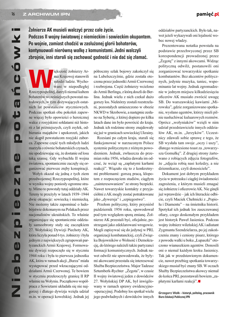 z archiwum IPN Niebezpieczne potańcówki 16 Żołnierze AK musieli walczyć przez całe życie. Podczas II wojny światowej z niemieckim i sowieckim okupantem. Po wojnie, zamiast chodzić w zasłużonej glorii bohaterów, kontynuowali nierówną walkę z komunistami. Jedni walczyli zbrojnie, inni starali się zachować godność i nie dać się złamać. W W iększość żołnierzy Armii Krajowej stanowili młodzi ludzie. Wychowani w niepodległej Rzeczypospolitej, darzyli niemal kultem bohaterów wcześniejszych powstań narodowych, w tym dożywających ostatnich lat powstańców styczniowych. Podczas spotkań obu pokoleń zapewne więcej było opowieści o heroicznej walce z rosyjskimi sołdatami niż historii z lat późniejszych, czyli zsyłek, odbierania majątków i upokorzeń, jakich nie skąpił powstańcom rosyjski zaborca. Zapewne część tych młodych ludzi marzyła o równie bohaterskich czynach, nie spodziewając się, że dostanie od losu taką szansę. Gdy wybuchła II wojna światowa, spontanicznie zaczęły się organizować pierwsze zręby konspiracji. Wołyń okazał się jedną z tych ziem przedwojennej Rzeczypospolitej, które w wyniku wojny poniosły ogromne straty. Mimo to powstały tutaj oddziały AK. Tereny te przeżyły w latach 1939–1944 dwie okupacje: sowiecką i niemiecką. Nie możemy także zapominać o ludobójstwie dokonanym na Polakach przez nacjonalistów ukraińskich. To właśnie organizujące się spontanicznie oddziały samoobrony stały się zaczątkiem 27. Wołyńskiej Dywizji Piechoty AK, która liczyła ponad 6 tys. żołnierzy i była jednym z największych zgrupowań partyzanckich Armii Krajowej. Formowanie dywizji rozpoczęło się w styczniu 1944 roku i była to pierwsza jednostka AK, która w ramach akcji „Burza” miała występować przed wkraczającymi oddziałami Armii Czerwonej. Te bowiem w styczniu przekroczyły granicę II RP właśnie na Wołyniu. Początkowo współpraca z Sowietami układała się nie najgorzej i dlatego dywizja wzięła udział m.in. w operacji kowelskiej. Jednak jej półroczny szlak bojowy zakończył się na Lubelszczyźnie, gdzie została otoczona przez jednostki Armii Czerwonej i rozbrojona. Część żołnierzy wcielono do Armii Berlinga, z którą doszli do Berlina. Jednak wielu z nich czekał dużo gorszy los. Niektórzy zostali rozstrzelani, pozostałych umieszczono w obozie NKWD w Skrobowie, a następnie zesłano na Syberię, z której dopiero po kilku latach dane im było powrócić do kraju. Jednak ich rodzinne strony znajdowały się już w granicach sowieckiej Ukrainy. Rozsiani po całym kraju, starali się funkcjonować w narzuconym Polsce systemie politycznym z różnym powodzeniem. Jednak, zwłaszcza do przemian roku 1956, władza dawała im odczuć, że wciąż są „zaplutymi karłami reakcji”. Wiązało się to z konkretnymi problemami: gorszą pracą, kłopotem z rozpoczęciem studiów, ciągłym „zainteresowaniem” ze strony bezpieki. Nawet towarzyskie kontakty z przyjaciółmi z AK mogły zostać potraktowane jako „dywersja” i „szpiegostwo”. Przełom polityczny, który przyniósł październik 1956 roku, spowodował pod tym względem sporą zmianę. Żołnierze AK przestali być, oficjalnie, postrzegani jako zdeklarowani wrogowie. Mogli zapisywać się do jedynej w PRL organizacji kombatanckiej, czyli Związku Bojowników o Wolność i Demokrację, do którego należeli także partyzanci formacji komunistycznych. Jednak nawet odwilż nie spowodowała, że byłymi akowcami przestała się interesować Służba Bezpieczeństwa. Major Tadeusz Sztumberk-Rychter „Żegota”, w czasie II wojny światowej jeden z dowódców 27. Wołyńskiej DP AK, był inwigilowany w ramach sprawy ewidencyjno-operacyjnej. Podobny los spotkał wielu jego podwładnych i dowódców innych oddziałów partyzanckich. Było tak, nawet jeżeli wykazywali oni lojalność wobec nowej władzy. Prezentowana notatka powstała na podstawie przechwyconej przez SB korespondencji prowadzonej przez „Żegotę” z innymi akowcami. Widząc polityczną odwilż, postanowili oni zorganizować towarzyskie spotkanie kombatantów. Bez akcentów politycznych, jedynie muzyka, taniec, wspominanie lat wojny. Jednak zgromadzenie w jednym miejscu kilkudziesięciu oficerów AK musiało zwrócić uwagę SB. Do warszawskiej kawiarni „Mirowska”, gdzie zorganizowano spotkanie, wysłano agentów, którzy mieli pilnie nasłuchiwać kuluarowych rozmów. Oprócz „wołyniaków” wzięli w nim udział przedstawiciele innych oddziałów AK, m.in. „Jerzyków”. Uczestnicy zdawali sobie sprawę z tego, że SB wysłała tam swoje „oczy i uszy”, dlatego wzniesiono toast za „towarzysza Gomułkę”. Z drugiej strony żartowano z robiących zdjęcia fotografów, że „zdjęcia robią nasi koledzy, a nie dziennikarze, czyli donosiciele”. Dokument jest dobrym przykładem życia w potrzasku i ciągłej świadomości zagrożenia, z którym musieli zmagać się żołnierze i oficerowie AK. Nie ginęli już wprawdzie – jak ich literackie odbicie, czyli Maciek Chełmicki z „Popiołu i Diamentu” – na śmietniku historii. Spotykał ich jednak los zaszczuwanej ofiary, czego doskonałym przykładem jest historyk Paweł Jasienica. Podczas wojny żołnierz wileńskiej AK i adiutant Zygmunta Szendzielarza, po jej zakończeniu znany i ceniony pisarz, którego z powodu walki u boku „Łupaszki” otoczono wianuszkiem agentów. Donosili oni o niemal każdym kroku Jasienicy. Tak jak w przedstawionym dokumencie, nawet przebieg spotkania towarzyskiego musiał być znany SB. W oczach Służby Bezpieczeństwa akowcy niemal do końca PRL pozostawali bowiem „zaplutymi karłami reakcji”. Grzegorz Wołk – historyk, politolog, pracownik Biura Edukacji Publicznej IPN z archiwum IPN 17 Biuro „W” MSW – jednostka SB zajmująca się tajną kontrolą korespondencji (perlustracją) Odręczny dopisek z poleceniem: „porozumieć się