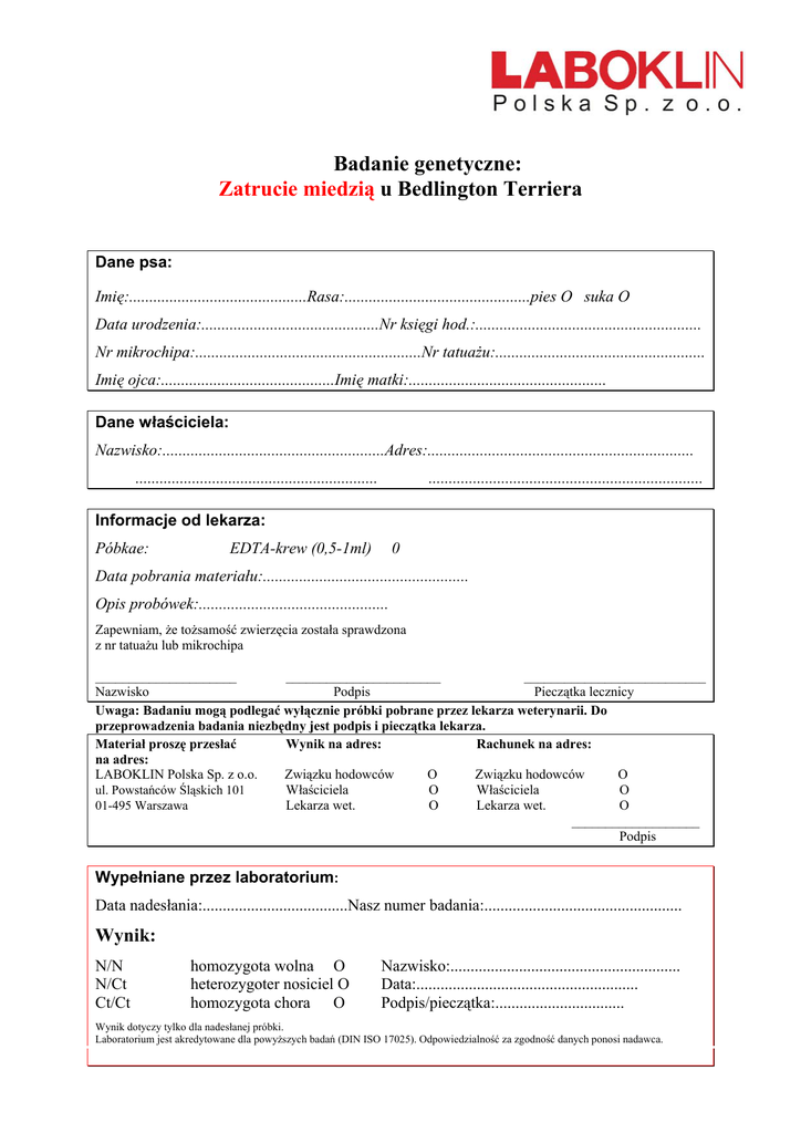 Badanie genetyczne: Zatrucie miedzią u Bedlington Terriera Dane psa: Imię:............................................Rasa:..............................................pies O suka O Data urodzenia:............................................Nr księgi hod.:........................................................ Nr mikrochipa:........................................................Nr tatuażu:.................................................... Imię ojca:...........................................Imię matki:................................................. Dane właściciela: Nazwisko:.......................................................Adres:.................................................................. ............................................................ .................................................................... Informacje od lekarza: Póbkae: EDTA-krew (0,5-1ml) 0 Data pobrania materiału:................................................... Opis probówek:............................................... Zapewniam, że tożsamość zwierzęcia została sprawdzona z nr tatuażu lub mikrochipa _____________________ _______________________ ___________________________ Nazwisko Podpis Pieczątka lecznicy Uwaga: Badaniu mogą podlegać wyłącznie próbki pobrane przez lekarza weterynarii. Do przeprowadzenia badania niezbędny jest podpis i pieczątka lekarza. Materiał proszę przesłać Wynik na adres: Rachunek na adres: na adres: LABOKLIN Polska Sp. z o.o. Związku hodowców O Związku hodowców O ul. Powstańców Śląskich 101 Właściciela O Właściciela O 01-495 Warszawa Lekarza wet. O Lekarza wet. O ___________________ Podpis Wypełniane przez laboratorium: Data nadesłania:....................................Nasz numer badania:................................................. Wynik: N/N N/Ct Ct/Ct homozygota wolna O heterozygoter nosiciel O homozygota chora O Nazwisko:......................................................... Data:....................................................... Podpis/pieczątka:................................ Wynik dotyczy tylko dla nadesłanej próbki. Laboratorium jest akredytowane dla powyższych badań (DIN ISO 17025). Odpowiedzialność za zgodność danych ponosi nadawca.