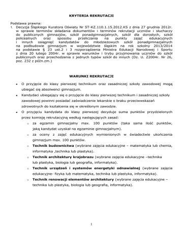 KRYTERIA REKRUTACJI Podstawa prawna: 1. Decyzja Śląskiego Kuratora Oświaty Nr ST-KZ.110.1.15.2012.KS z dnia 27 grudnia 2012r. w sprawie terminów składania dokumentów i terminów rekrutacji uczniów i słuchaczy do publicznych gimnazjów, szkół ponadgimnazjalnych, szkół dla dorosłych, szkół policealnych oraz sposobu przeliczania na punkty zajęć edukacyjnych i innych osiągnięć kandydatów do młodzieżowych szkół ponadgimnazjalnych na podbudowie gimnazjum w województwie śląskim na rok szkolny 2013/2014 na podstawie § 23 ust.2 i 3 rozporządzenia Ministra Edukacji Narodowej i Sportu z dnia 20 lutego 2004r. w sprawie warunków i trybu przyjmowania uczniów do szkół publicznych oraz przechodzenia z jednych typów szkół do innych (Dz. U. Z2004r. Nr 26, poz. 232 z późn.zm.) WARUNKI REKRUTACJI O przyjęcie do klasy pierwszej technikum oraz zasadniczej szkoły zawodowej mogą ubiegać się absolwenci gimnazjum. Kandydaci ubiegający się o przyjęcie do klasy pierwszej technikum i zasadniczej szkoły zawodowej powinni posiadać zaświadczenie lekarskie o braku przeciwwskazań zdrowotnych do kształcenia się w określonym zawodzie. O przyjęciu kandydata do klasy pierwszej decyduje suma punktów przydzielonych przez komisję rekrutacyjną według następujących zasad: o za egzamin gimnazjalny max. 100 punktów (taka sama ilość punktów, jaką kandydat uzyskał na egzaminie gimnazjalnym). o za oceny z zajęć edukacyjnych wymienionych w świadectwie ukończenia gimnazjum max. 100 punktów. o Technik budownictwa (wybrane zajęcia edukacyjne – matematyka lub chemia, informatyka ,technika lub plastyka). o Technik architektury krajobrazu (wybrane zajęcia edukacyjne –technika lub plastyka, biologia lub geografia, informatyka). o Technik urządzeń i systemów energetyki odnawialnej (wybrane zajęcia edukacyjne- fizyka lub matematyka, technika lub plastyka, informatyka). o Technik renowacji elementów architektury (wybrane zajęcia edukacyjne – technika lub plastyka, biologia lub geografia, informatyka). 1 o wg następującego klucza: Zagadnienie Język polski Punktacja szczegółowa dopuszczający – 0 punkty dostateczny – 9 punktów dobry – 13 punktów bardzo dobry – 16 punktów celujący – 19 punktów dopuszczający – 0 punkty Punktacja maksymalna 19 punktów Informatyka dostateczny – 9 punktów ( technik budownictwa) dobry – 13 punktów (technik architekt.krajobrazu) 19 punktów (technik urządzeń i systemów bardzo dobry – 16 punktów energetyki odnawialnej) celujący – 19 punktów (technik renowacji elementów architektury) Matematyka lub Chemia dopuszczający – 0 punkty ( technik budownictwa) (technik renowacji elementów dostateczny – 9 punktów architektury) 19 punktów dobry – 13 punktów Biologia lub Geografia (technik architekt. krajobrazu) bardzo dobry – 16 punktów (technik urządzeń i systemów celujący – 19 punktów energetyki odnawialnej) Technika lub Plastyka dopuszczający – 0 punkty ( technik budownictwa) dostateczny – 9 punktów (technik architekt. krajobrazu) (technik urządzeń i systemów dobry – 13 punktów 19 punktów energetyki odnawialnej) bardzo dobry – 16 punktów (technik renowacji elementów celujący – 19 punktów architektury) Świadectwo ukończenia 5 punktów gimnazjum z wyróżnieniem Uzyskanie tyt. finalisty w ( można brać pod uwagę 12 punktów wojewódzkim konkursów udział w dwóch konkursach) (za jeden tyt.- 10 punktów przedmiotowym organizowanym za dwa i więcej tyt.- dodatkowo przez Kuratora Oświaty 2 punktów) Szczególne osiągnięcia w zawodach wiedzy 5 punktów artystycznych i sportowych I miejsce lub tytuł laureata – 5 pkt (indywidualne lub zespołowe) II miejsce lub tytuł finalisty – 4 pkt lub konkursy inne, co III miejsce lub wyróżnienie - 3 pkt najmniej na szczeblu powiatowym wymienione na świadectwie ukończenia gimnazjum. Stałe zaangażowanie w pracę społeczną w charakterze 2 punkty wolontariusza Kandydat uzyskuje dodatkowo liczbę punktów za oceny z języka polskiego i Absolwenci zwolnieni z egzaminu gimnazjalnego przez trzech wybranych obowiązkowych Dyrektora Okręgowej Komisji Egzaminacyjnej zajęć edukacyjnych otrzymanych na świadectwie ukończenia gimnazjum. Egzamin gimnazjalny 100 punktów Maksymalna ilość punktów uzyskanych w wyniku rekrutacji 200 punktów 2 Laureaci konkursów przedmiotowych organizowanych przez Śląskiego Kuratora Oświaty. Wymienionych w ust.9, laureaci konkursów przedmiotowych organizowanych przez kuratorów Oświaty w innych województwach wymienianych w zasadach rekrutacji poszczególnych kuratoriów oświaty, których program obejmuje w całości lub poszerza treści podstawy programowej co najmniej jednego przedmiotu, laureaci i finaliści olimpiad przedmiotowych ogłaszanych przez Ministerstwo Edukacji Narodowej , przyjmowani są do wybranej szkoły ponadgimnazjalnej niezależnie od kryteriów podanych w poprzednich punktach. MINIMALNA ILOŚĆ PUNKTÓW DLA KANDYDATÓW Technikum nr 2 - 60 pkt. Zasadnicza Szkoła Zawodowa nr 3 – bez limitu pkt. W przypadku wolnych miejsc o przyjęciu kandydata, który nie posiada wymaganej liczby punktów, decyduje dyrektor szkoły. LIMITY MIEJSC DLA POSZCZEGÓLNYCH TYPÓW SZKÓŁ WYNOSZĄ Technikum nr 2 - 70 miejsc Zasadnicza Szkoła Zawodowa nr 3 – 64 miejsc KRYTERIA PIERWSZEŃSTWA Wykorzystywane do rozróżnienia i uszeregowania kandydatów w sytuacji, gdy dwóch lub więcej z nich uzyskuje tę samą liczbę punktów: 1) kandydat jest sierotą lub przebywa w placówce opiekuńczo – wychowawczej oraz osoby umieszczone w rodzinach zastępczych, 2) kandydat o ukierunkowanych i udokumentowanych zdolnościach, miał ustalony indywidualny program lub tok nauki , 3) kandydat ma udokumentowane problemy zdrowotne, 4) kandydat jest zameldowany na terenie miasta Sosnowca, Kandydaci do szkoły ponadgimnazjalnej, którzy ukończyli szkołę za granicą, równorzędną polskiemu publi