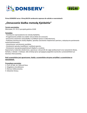 Firma DONSERV wraz z firmą BUCHI serdecznie zaprasza do udziału w warsztatach: „Oznaczanie białka metodą Kjeldahla” Termin warsztatów: Warszawa, 22.-23.11 początek godzina 10:00 Tematyka: - Teoretyczne wprowadzenie do metody Kjeldahla; - Przygotowanie próbek oraz dobór odczynników do oznaczeń; - Oznaczenia zawartości azotu/białka w próbkach (praca w laboratorium); - Podstawy teoretyczne analizy błędów, sposoby szacowania niepewności pomiaru, statystyczne porównanie metod pomiarowych; - Interpretacja i porównanie wyników; - Omówienie sposobu kwalifikacji i walidacji aparatu; - Omówienie najczęściej popełnianych błędach w analizie; Zapewniamy materiały szkoleniowe, aparaturę i odczynniki do zajęć praktycznych oraz wyżywienie (kawa, herbata, 2 obiady i 1 kolacja). Jako atrakcja (przy sprzyjającej pogodzie) wycieczka z przewodnikiem po Starówce Warszawskiej. Ilość uczestników jest ograniczona. Każdy z uczestników otrzyma certyfikat z uczestnictwa w warsztatach. Prowadzący warsztaty: 1. Prof. dr hab. inż. Edmund Kaca 2. Magdalena Zarodkiewicz 3. Mariusz Kolbuszewska; 4. Sebastian Gnacy;