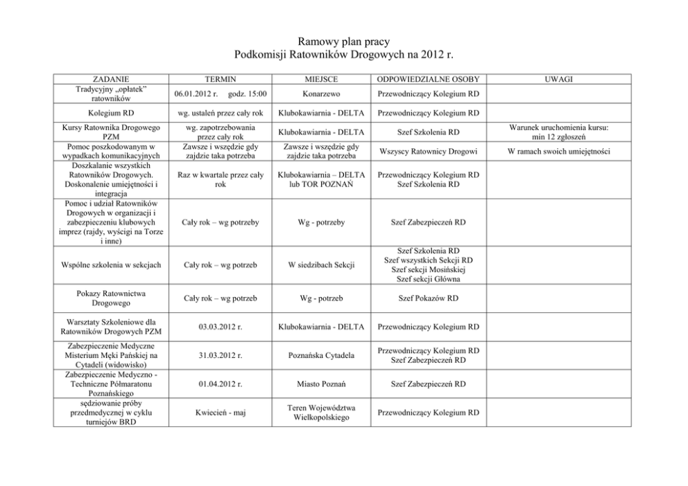 Ramowy plan pracy Podkomisji Ratowników Drogowych na 2012 r. ZADANIE Tradycyjny „opłatek” ratowników TERMIN MIEJSCE ODPOWIEDZIALNE OSOBY Konarzewo Przewodniczący Kolegium RD Klubokawiarnia - DELTA Przewodniczący Kolegium RD Klubokawiarnia - DELTA Szef Szkolenia RD Warunek uruchomienia kursu: min 12 zgłoszeń Zawsze i wszędzie gdy zajdzie taka potrzeba Wszyscy Ratownicy Drogowi W ramach swoich umiejętności Raz w kwartale przez cały rok Klubokawiarnia – DELTA lub TOR POZNAŃ Przewodniczący Kolegium RD Szef Szkolenia RD Cały rok – wg potrzeby Wg - potrzeby Szef Zabezpieczeń RD 06.01.2012 r. godz. 15:00 Kolegium RD wg. ustaleń przez cały rok Kursy Ratownika Drogowego PZM Pomoc poszkodowanym w wypadkach komunikacyjnych Doszkalanie wszystkich Ratowników Drogowych. Doskonalenie umiejętności i integracja Pomoc i udział Ratowników Drogowych w organizacji i zabezpieczeniu klubowych imprez (rajdy, wyścigi na Torze i inne) wg. zapotrzebowania przez cały rok Zawsze i wszędzie gdy zajdzie taka potrzeba Wspólne szkolenia w sekcjach Cały rok – wg potrzeb W siedzibach Sekcji Szef Szkolenia RD Szef wszystkich Sekcji RD Szef sekcji Mosińskiej Szef sekcji Główna Pokazy Ratownictwa Drogowego Cały rok – wg potrzeb Wg - potrzeb Szef Pokazów RD Warsztaty Szkoleniowe dla Ratowników Drogowych PZM 03.03.2012 r. Klubokawiarnia - DELTA Przewodniczący Kolegium RD 31.03.2012 r. Poznańska Cytadela Przewodniczący Kolegium RD Szef Zabezpieczeń RD 01.04.2012 r. Miasto Poznań Szef Zabezpieczeń RD Kwiecień - maj Teren Województwa Wielkopolskiego Przewodniczący Kolegium RD Zabezpieczenie Medyczne Misterium Męki Pańskiej na Cytadeli (widowisko) Zabezpieczenie Medyczno Techniczne Półmaratonu Poznańskiego sędziowanie próby przedmedycznej w cyklu turniejów BRD UWAGI Zabezpieczenie medyczne i sędziowanie próby przedmedycznej na rajdzie rowerowym 16.05.2012 r. Miasto Poznań Szef Zabezpieczeń RD Zabezpieczenie Medyczne Dni Mosiny 24-27.05.2012 r. Mosina Szef Sekcji Mosińskiej 24.05.2012 r. Miasto Poznań Przewodniczący Kolegium RD 25.05.2012 r. Teren Zakładu Poprawczego Szef Zabezpieczeń RD 02.06.2012 r. Lednica Wice Szef Zabezpieczeń RD Patrole medyczne EURO 2012 czerwiec Miasto Poznań Szef Zabezpieczeń RD Zabezpieczenie Medyczne Dni Obornik Zabezpieczenie Medyczne Rajdu MTB Zabezpieczenie Medyczno Techniczne Poznańskiej Pieszej Pielgrzymki na Jasną Górę Pokazy i szkolenia z zakresu Pierwszej Pomocy w ramach Europejskiego Dnia Bezpieczeństwa Ruchu Drogowego Eliminacje Okręgowe do Ogólnopolskich Mistrzostw Ratowników Drogowych PZM Udział w Ogólnopolskich Mistrzostw Ratowników Drogowych PZM Zabezpieczenie Medyczno Techniczne Maratonu Poznańskiego 25.06 – 01.07.2012 r Oborniki Wlkp. Szef Zabezpieczeń RD 01.07.2012 r. Mosina Szef Sekcji Mosińskiej 06-15.07.2012 r. Poznań - Częstochowa Przewodniczący Kolegium RD 25.07.2012 r. Poznań Pl. Mickiewicza Przewodniczący Kolegium RD wrzesień Tor Poznań Szef Szkolenia RD październik Kaszuby Przewodniczący Kolegium RD 14.10.2012 r. Poznań Szef Zabezpieczeń RD Kurs na Instruktora RD Ostatni kwartał Tor Poznań Szef Szkolenia RD Kampania społeczna "Zatrzymaj się i żyj" organizacja pozoracji wypadku kolejowego Festyn "Dom dla przyjaciela" pokaz ratownictwa Zabezpieczenie Medyczno Techniczne Spotkania Młodzieży LEDNICA 2012 Jeśli będzie odpowiednia ilość kandydatów
