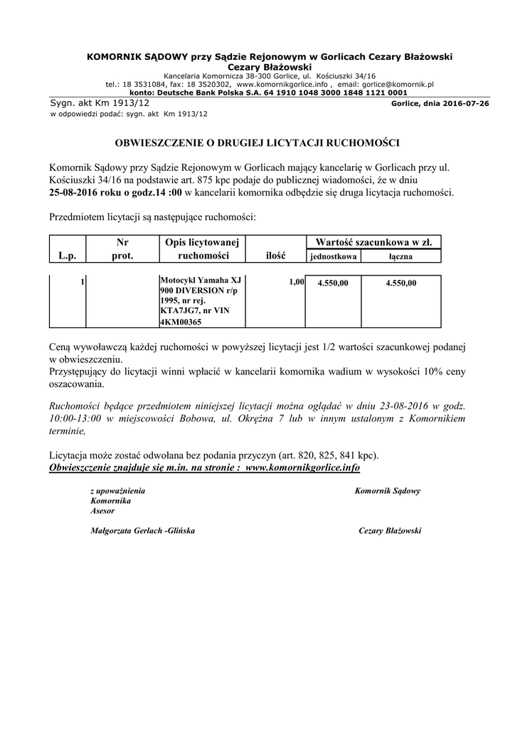 KOMORNIK SĄDOWY przy Sądzie Rejonowym w Gorlicach Cezary Błażowski Cezary Błażowski Kancelaria Komornicza 38-300 Gorlice, ul. Kościuszki 34/16 tel.: 18 3531084, fax: 18 3520302, www.komornikgorlice.info , email: [email protected] konto: Deutsche Bank Polska S.A. 64 1910 1048 3000 1848 1121 0001 Sygn. akt Km 1913/12 Gorlice, dnia 2016-07-26 w odpowiedzi podać: sygn. akt Km 1913/12 OBWIESZCZENIE O DRUGIEJ LICYTACJI RUCHOMOŚCI Komornik Sądowy przy Sądzie Rejonowym w Gorlicach mający kancelarię w Gorlicach przy ul. Kościuszki 34/16 na podstawie art. 875 kpc podaje do publicznej wiadomości, że w dniu 25-08-2016 roku o godz.14 :00 w kancelarii komornika odbędzie się druga licytacja ruchomości. Przedmiotem licytacji są następujące ruchomości: Nr prot. L.p. Opis licytowanej ruchomości Motocykl Yamaha XJ 900 DIVERSION r/p 1995, nr rej. KTA7JG7, nr VIN 4KM00365 1 Wartość szacunkowa w zł. ilość 1,00 jednostkowa łączna 4.550,00 4.550,00 Ceną wywoławczą każdej ruchomości w powyższej licytacji jest 1/2 wartości szacunkowej podanej w obwieszczeniu. Przystępujący do licytacji winni wpłacić w kancelarii komornika wadium w wysokości 10% ceny oszacowania. Ruchomości będące przedmiotem niniejszej licytacji można oglądać w dniu 23-08-2016 w godz. 10:00-13:00 w miejscowości Bobowa, ul. Okrężna 7 lub w innym ustalonym z Komornikiem terminie, Licytacja może zostać odwołana bez podania przyczyn (art. 820, 825, 841 kpc). Obwieszczenie znajduje się m.in. na stronie : www.komornikgorlice.info z upoważnienia Komornika Asesor Małgorzata Gerlach -Glińska Komornik Sądowy Cezary Błażowski