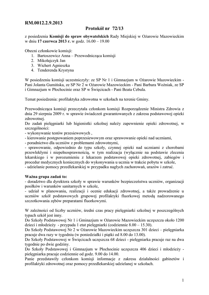 RM.0012.2.9.2013 Protokół nr 72/13 z posiedzenia Komisji do spraw obywatelskich Rady Miejskiej w Ożarowie Mazowieckim w dniu 17 czerwca 2013 r. w godz. 16.00 – 19.00 Obecni członkowie komisji: 1. Bartoszewicz Anna – Przewodnicząca komisji 2. Mikołajczyk Jan 3. Wichert Agnieszka 4. Tenderenda Krystyna W posiedzeniu komisji uczestniczyły: ze SP Nr 1 i Gimnazjum w Ożarowie Mazowieckim Pani Jolanta Gumińska, ze SP Nr 2 w Ożarowie Mazowieckim - Pani Barbara Woźniak, ze SP i Gimnazjum w Płochocinie oraz SP w Święcicach - Pani Beata Cebula. Temat posiedzenia: profilaktyka zdrowotna w szkołach na terenie Gminy. Przewodnicząca komisji przeczytała członkom komisji Rozporządzenie Ministra Zdrowia z dnia 29 sierpnia 2009 r. w sprawie świadczeń gwarantowanych z zakresu podstawowej opieki zdrowotnej. Do zadań pielęgniarki lub higienistki szkolnej należy zapewnienie opieki zdrowotnej, w szczególności: - wykonywanie testów przesiewowych , - kierowanie postępowaniem poprzesiewowym oraz sprawowanie opieki nad uczniami, - poradnictwo dla uczniów z problemami zdrowotnymi, - sprawowanie, odpowiednio do typu szkoły, czynnej opieki nad uczniami z chorobami przewlekłymi i niepełnosprawnością, w tym realizacja (wyłącznie na podstawie zlecenia lekarskiego i w porozumieniu z lekarzem podstawowej opieki zdrowotnej, zabiegów i procedur medycznych koniecznych do wykonywania u ucznia w trakcie pobytu w szkole, - udzielanie pomocy przedlekarskiej w przypadku nagłych zachorowań, urazów i zatruć. Ważna grupa zadań to: - doradztwo dla dyrektora szkoły w sprawie warunków bezpieczeństwa uczniów, organizacji posiłków i warunków sanitarnych w szkole, - udział w planowaniu, realizacji i ocenie edukacji zdrowotnej, a także prowadzenie u uczniów szkół podstawowych grupowej profilaktyki fluorkowej metodą nadzorowanego szczotkowania zębów preparatami fluorkowymi. W zależności od liczby uczniów, średni czas pracy pielęgniarki szkolnej w poszczególnych typach szkół jest inny. Do Szkoły Podstawowej Nr 1 i Gminazjum w Ożarowie Mazowieckim uczęszcza około 1200 dzieci i młodzieży - przypada 1 etat pielęgniarki (codziennie 8.00 – 15.30). Do Szkoły Podstawowej Nr 2 w Ożarowie Mazowieckim uczęszcza 301 dzieci – pielęgniarka pracuje dwa razy w tygodniu (w poniedziałki i piątki od 8.00 do 13.00). Do Szkoły Podstawowej w Święcicach uczęszcza 68 dzieci - pielęgniarka pracuje raz na dwa tygodnie po dwie godziny. Do Szkoły Podstawowej i Gimnazjum w Płochocinie uczęszcza 406 dzieci i młodzieży pielęgniarka pracuje codziennie od godz. 9.00 do 14.00. Panie przedstawiły członkom komisji informacje z zakresu działalności gabinetów i profilaktyki zdrowotnej oraz pomocy przedlekarskiej udzielanej w szkołach. 1 Testy przesiewowe i bilanse u dzieci wykonuje się w wieku 6-7 lat, 10 lat, 13-14 lat, 16 lat. Test do wykrywania zaburzeń: 1) rozwoju fizycznego (pomiary: wysokości i masy ciała); 2) układu ruchu, w tym bocznego skrzywienia kręgosłupa, zniekształceń statycznych kończyn dolnych; 3) w kierunku zeza; 4) ostrości wzroku; 5) słuchu (badanie orientacyjne szeptem); 6) ciśnienia tętniczego krwi; 7) orientacyjne wykrywanie zaburzeń statyki ciała; 8) wykrywanie wad wymowy. U dzieci w wieku 10 lat, 13-14 lat i 16 lat dodatkowo wykonuje się: 1) widzenie barw; 2) układ ruchu, w tym boczne skrzywienia kręgosłupa i nadmiernej kifozy piersiowej. Pielęgniarki w środowisku nauczania i wychowania realizują zadania z zakresu edukacji i promocji zdrowia. Główną formą realizacji w tym obszarze są przeprowadzane rozmowy indywidualne z uczniami oraz rozpowszechnianie broszur i ulotek na temat zdrowego trybu życia. Na terenie szkół przeprowadzane są systematycznie pogadanki i akcje profilaktyczne, takie jak: „Czyste powietrze” – klasy 0; „Nie pal przy mnie” – klasy III; „Zdrowe serce – zdrowy duch” – klasy III, IV; „Znajdź właściwe rozwiązanie” – klasy V; „Radosny Uśmiech, radosna przyszłość” – fluoryzacja – od klasy I do VI; „Ratujemy i uczymy ratować” – nauka na fantomach – klasy V, VI i gimnazjum; „Od samobadania do mammografii” – na fantomie do badania piersi - klasy VI i gimnazjum; „Trzymaj formę – zdrowe odżywianie” – klasy V, VI i gimnazjum; „Zachowaj trzeźwy umysł” – klasy IV-VI i gimnazjum. W związku z coraz mniejszą wyszczepialnością dzieci i młodzieży w szkołach, członkowie komisji wnioskują, aby do szkół ponownie wrócili lekarze pediatrzy, wówczas sczepienia będą odbywały się w szkołach. Z opinii pielęgniarek pracujących w szkołach, wynika, że z roku na rok zwiększa się ilość dzieci z próchnicą zębów. Komisja wnosi o przywrócenie gabinetów stomatologicznych do szkół lub rozwiązanie tego problemu z istniejącymi już na terenie Gminy gabinetami stomatologicznymi. Komisja wnosi aby ograniczyć w sklepikach szkolnych sprzedaż artykułów spożywczych takich jak: chipsy, napoje gazowane wysokosłodzone, cukierki, lizaki i gumy farbujące jamę ustną. Jest to ważny problem, ponieważ wśród dzieci i młodzieży pojawia się coraz więcej cukrzycy insulinozależnej i otyłości. Komisja zapoznała się z pismami, które wpłynęły do Rady Miejskiej. Kolejne posiedzenie komisji zostało zaplanowane na dzień 24.06.2013 r. na godz. 16.00 Tematem posiedzenia będzie opiniowanie projektów uchwał na XXXVIII sesję RM zaplanowaną na 27.06.2013 r. 2 Na tym protokół zakończono i po odczytaniu podpisano. Członkowie komisji do spraw obywatelskich: 1. Bartoszewicz Anna……………………………………………….. 2. Cichal Andrzej…………………………………………………….. 3. Mikołajczyk Jan…………………………………………………… 4. Wichert Agnieszka………………………………………………… 5. Tenderenda Krystyna……………………………………
