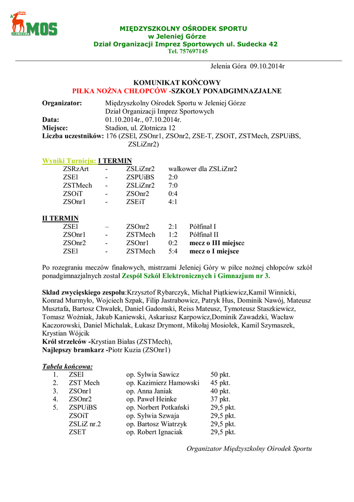 Jelenia Góra 09.10.2014r KOMUNIKAT KOŃCOWY PIŁKA NOŻNA
