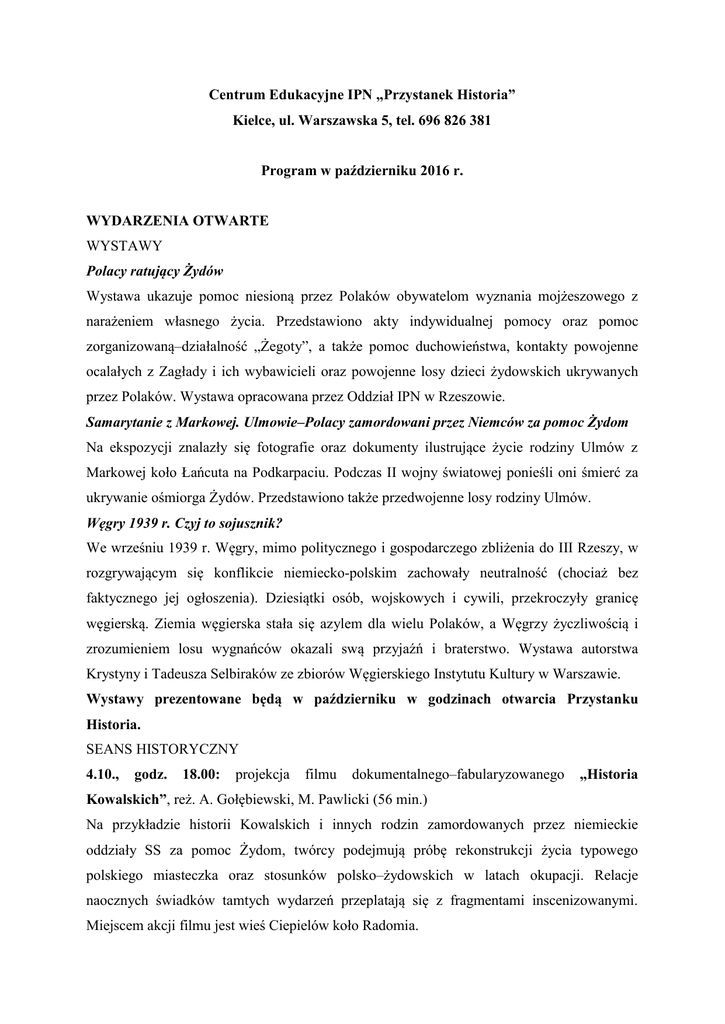 Centrum Edukacyjne IPN „Przystanek Historia” Kielce, ul. Warszawska 5, tel. 696 826 381 Program w październiku 2016 r. WYDARZENIA OTWARTE WYSTAWY Polacy ratujący Żydów Wystawa ukazuje pomoc niesioną przez Polaków obywatelom wyznania mojżeszowego z narażeniem własnego życia. Przedstawiono akty indywidualnej pomocy oraz pomoc zorganizowaną–działalność „Żegoty”, a także pomoc duchowieństwa, kontakty powojenne ocalałych z Zagłady i ich wybawicieli oraz powojenne losy dzieci żydowskich ukrywanych przez Polaków. Wystawa opracowana przez Oddział IPN w Rzeszowie. Samarytanie z Markowej. Ulmowie–Polacy zamordowani przez Niemców za pomoc Żydom Na ekspozycji znalazły się fotografie oraz dokumenty ilustrujące życie rodziny Ulmów z Markowej koło Łańcuta na Podkarpaciu. Podczas II wojny światowej ponieśli oni śmierć za ukrywanie ośmiorga Żydów. Przedstawiono także przedwojenne losy rodziny Ulmów. Węgry 1939 r. Czyj to sojusznik? We wrześniu 1939 r. Węgry, mimo politycznego i gospodarczego zbliżenia do III Rzeszy, w rozgrywającym się konflikcie niemiecko-polskim zachowały neutralność (chociaż bez faktycznego jej ogłoszenia). Dziesiątki osób, wojskowych i cywili, przekroczyły granicę węgierską. Ziemia węgierska stała się azylem dla wielu Polaków, a Węgrzy życzliwością i zrozumieniem losu wygnańców okazali swą przyjaźń i braterstwo. Wystawa autorstwa Krystyny i Tadeusza Selbiraków ze zbiorów Węgierskiego Instytutu Kultury w Warszawie. Wystawy prezentowane będą w październiku w godzinach otwarcia Przystanku Historia. SEANS HISTORYCZNY 4.10., godz. 18.00: projekcja filmu dokumentalnego–fabularyzowanego „Historia Kowalskich”, reż. A. Gołębiewski, M. Pawlicki (56 min.) Na przykładzie historii Kowalskich i innych rodzin zamordowanych przez niemieckie oddziały SS za pomoc Żydom, twórcy podejmują próbę rekonstrukcji życia typowego polskiego miasteczka oraz stosunków polsko–żydowskich w latach okupacji. Relacje naocznych świadków tamtych wydarzeń przeplatają się z fragmentami inscenizowanymi. Miejscem akcji filmu jest wieś Ciepielów koło Radomia. KONFERENCJE 12.10., godz. 9.00: „Żydzi i wojsko polskie w XIX i XX wieku” konferencja naukowa zorganizowana przez Delegaturę Instytutu Pamięci Narodowej w Kielcach oraz Uniwersytet Jana Kochanowskiego w Kielcach. Obrady pierwszego dnia konferencji (11.10.) odbędą się w Instytucie Historii UJK. HISTORIA DLA KAŻDEGO 19.10., godz. 17.00: wykład Edyty Krężołek „Rok 1956: od nadziei Polaków do tragedii Węgrów” przybliży przebieg burzliwych wydarzeń w roku, który w państwach obozu komunistycznego wyznacza kres stalinizmu. KŁOPOTY Z HISTORIĄ 25.10., godz. 17.00: spotkanie z dr. Tomaszem Łabuszewskim „Czarna legenda majora Łupaszki?” podczas którego zmierzymy się z żywymi w dalszym ciągu w świadomości społecznej mitami odnośnie Żołnierzy Wyklętych. OFERTA DLA SZKÓŁ WARSZTATY 6.10., godz. 12.00: warsztaty dla uczniów szkół ponadgimnazjalnych oraz ich nauczycieli mające na celu przygotowanie do ogólnopolskiego konkursu „Olimpiada Solidarności. Dwie dekady historii”. KONFERENCJE 18.10., godz. 13.00: konferencja popularnonaukowa „Śladami pamięci” oraz ogłoszenie konkursu na szkolne projekty edukacyjne mające na celu poszukiwanie informacji na temat Polaków ratujących Żydów podczas II wojny światowej. LUDZIE (W) HISTORII 27.10., godz. 12.00: spotkanie „Antoni Heda–Szary” z okazji setnej rocznicy urodzin bohatera, z udziałem Teresy Hedy–Snopkiewicz. WYDARZENIA TOWARZYSZĄCE 18. 10., godz. 10–17: I Ogólnopolski Festiwal Piosenki Niezłomnej (etap I, eliminacje wojewódzkie), Kieleckie Centrum Kultury, pl. Moniuszki 2B.