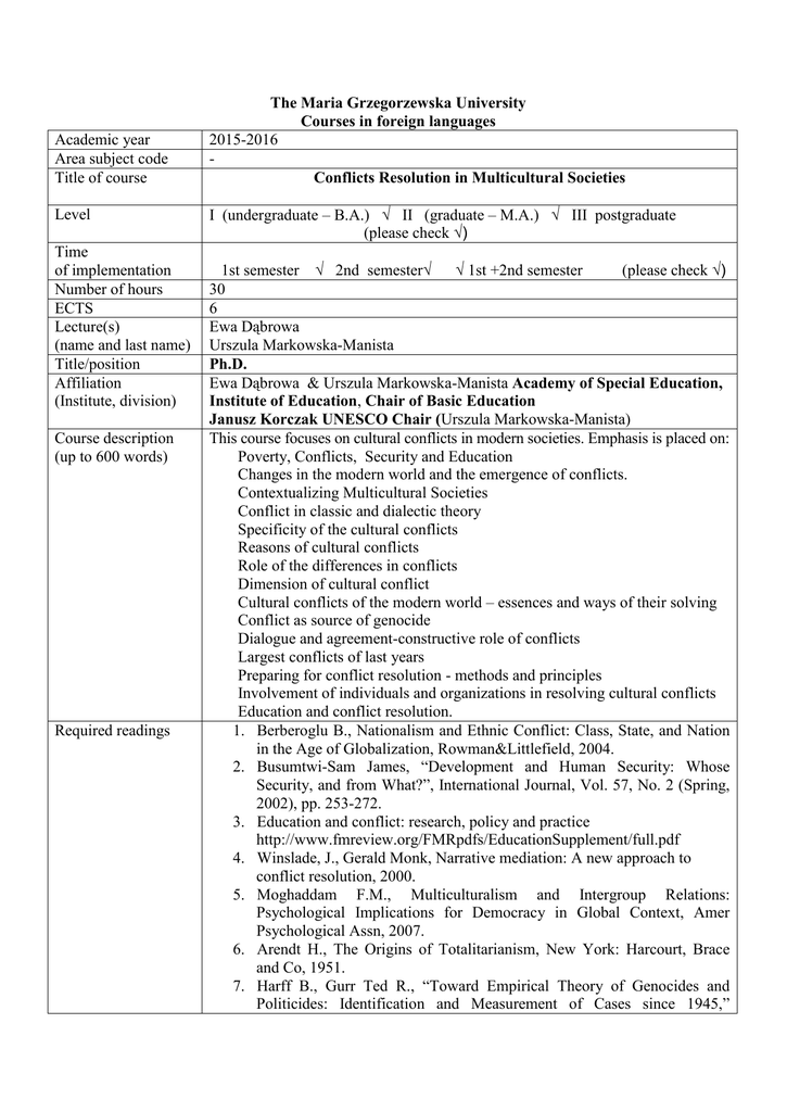 Academic year Area subject code Title of course Level Time of implementation Number of hours ECTS Lecture(s) (name and last name) Title/position Affiliation (Institute, division) Course description (up to 600 words) Required readings The Maria Grzegorzewska University Courses in foreign languages 2015-2016 Conflicts Resolution in Multicultural Societies I (undergraduate – B.A.) √ II (graduate – M.A.) √ III postgraduate (please check √) 1st semester √ 2nd semester√ √ 1st +2nd semester (please check √) 30 6 Ewa Dąbrowa Urszula Markowska-Manista Ph.D. Ewa Dąbrowa & Urszula Markowska-Manista Academy of Special Education, Institute of Education, Chair of Basic Education Janusz Korczak UNESCO Chair (Urszula Markowska-Manista) This course focuses on cultural conflicts in modern societies. Emphasis is placed on: Poverty, Conflicts, Security and Education Changes in the modern world and the emergence of conflicts. Contextualizing Multicultural Societies Conflict in classic and dialectic theory Specificity of the cultural conflicts Reasons of cultural conflicts Role of the differences in conflicts Dimension of cultural conflict Cultural conflicts of the modern world – essences and ways of their solving Conflict as source of genocide Dialogue and agreement-constructive role of conflicts Largest conflicts of last years Preparing for conflict resolution - methods and principles Involvement of individuals and organizations in resolving cultural conflicts Education and conflict resolution. 1. Berberoglu B., Nationalism and Ethnic Conflict: Class, State, and Nation in the Age of Globalization, Rowman&Littlefield, 2004. 2. Busumtwi-Sam James, “Development and Human Security: Whose Security, and from What?”, International Journal, Vol. 57, No. 2 (Spring, 2002), pp. 253-272. 3. Education and conflict: research, policy and practice http://www.fmreview.org/FMRpdfs/EducationSupplement/full.pdf 4. Winslade, J., Gerald Monk, Narrative mediation: A new approach to conflict resolution, 2000. 5. Moghaddam F.M., Multiculturalism and Intergroup Relations: Psychological Implications for Democracy in Global Context, Amer Psychological Assn, 2007. 6. Arendt H., The Origins of Totalitarianism, New York: Harcourt, Brace and Co, 1951. 7. Harff B., Gurr Ted R., “Toward Empirical Theory of Genocides and Politicides: Identification and Measurement of Cases since 1945,” International Studies Quarterly 32, 1988, pp. 359–71; 1996 “Victims of the State: Genocides, Politicides and Group Repression from 1945 to 1995,” in: Jongman A.J. (ed.) Contemporary Genocides: Causes, Cases, Consequences, Leiden: PIOOM/University of Leiden: pp. 33–58. 8. Kiernan B., Blood and Soil. A World History of Genocide and extermination from Sparta to Darfur, Yale: Yale University Press 2007. 9. Ross M.H., Cultural Contestation in Ethnic Conflict, Cambridge University, 2007. 10. Sengstock M.C., Voices of Diversity, Clinical Sociology Research And Practice, 2009. 11. Wagschal U., Schwank N., Trinn Ch., Croissant A., Culture and Conflict in Global Perspective, Bertelsmann Stiftung 2010. 12. Other publications will be proposed during the seminar Teaching methods Prerequisites Assessment Teaching language Contact person for further information (name, e-mail, phone) Lectures & labs - simulated experiences, video and slide demonstrations, discussions Basic knowledge of problems in the global world Preparation of works English Urszula Markowska-Manista: [email protected] Ewa Dąbrowa: [email protected]