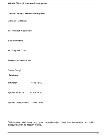 Oddział Chirurgii Urazowo-Ortopedycznej Oddział Chirurgii Urazowo-Ortopedycznej Ordynator Oddziału: lek. Wojciech Kleczewski Z-ca ordynatora lek. Zbigniew Czaja Pielęgniarka oddziałowa Dorota Sordyl Telefony : ordynator 77 408 78 60 dyżurka lekarska 77 408 78 61 dyżurka pielęgniarska 77 408 78 62 Oddział pełni całodobowy ostry dyżur, zabezpieczając opiekę dla mieszkańców i wszystkich przebywających na naszym terenie. 1/5 Oddział Chirurgii Urazowo-Ortopedycznej Dysponuje 40 łóżkami w salach 2 i 4 osobowych z samodzielnym węzłem sanitarnym i TV. Doświadczona i wyspecjalizowana kadra o wysokich kwalifikacjach umożliwia wykonywanie szerokiego wachlarza zabiegów z zakresu chirurgii układu kostno – mięśniowego. Oddział świadczy usługi w zakresie ortopedii i traumatologii, m.in. - Leczenie operacyjne i zachowawcze urazów narządu ruchu Leczenie powikłań pourazowych narządu ruchu Leczenie choroby zwyrodnieniowej stawu biodrowego i kolanowego Leczenie korekcyjne nabytych zniekształceń kończyn Leczenie usprawniające w okresie pooperacyjnym W Oddziale wykonuje się pełen zakres operacji z zakresu traumatologii przy użyciu nowoczesnych metod zespoleń/ stabilizacja gwoździami ryglowanymi, DSB, DSK ,płytkami blokowanymi i AO/, wykonujemy endoprotezoplastyki stawów biodrowych i kolanowych, wykonujemy artroskopię diagnostyczną stawu kolanowego i rekonstrukcję więzadła krzyżowego przedniego, wykonujemy zabiegi korekcyjne w nabytych zniekształceniach kończyn. 2/5 Oddział Chirurgii Urazowo-Ortopedycznej Oddział posiada akredytację Ministerstwa Zdrowia do prowadzenia specjalizacji w zakresie ortopedii i traumatologii oraz prowadzenia staży kierunkowych w zakresie ortopedii i traumatologii. ZADANIA ODDZIAŁU CHIRURGII URAZOWO-ORTOPEDYCZNEJ Do zadań Oddziału w szczególności należy: 1. Leczenie zachowawcze i operacyjne chorych z urazowym uszkodzeniem narządu ru chu, w tym: - leczenie złamań kości długich kończyn górnych i dolnych, miednicy; - leczenie złamań kręgosłupa we wszystkich jego odcinkach u chorych z jednoczes nym uszkodzeniem rdzenia kręgowego i bez jego uszkodzenia; - leczenie uszkodzeń stawów – zachowawcze i operacyjne; - leczenie uszkodzeń mięśni, ścięgien, wiązadeł i nerwów; 2. Kompleksowe leczenie obrażeń wielonarządowych i wielomiejscowych narządu ruchu – we współpracy z anestezjologami, chirurgami i 3/5 Oddział Chirurgii Urazowo-Ortopedycznej lekarzami innych specjalności. 3. Leczenia powikłań zrostu kostnego. 4. Leczenie pourazowych i krwiopochodnych zapaleń kości. 5. Leczenie chorych z zakresu reumoortopedii – synovectomie, tenosynovectomie, zabie gi korekcyjne rąk i stóp, artroplastyki. 6. Leczenie chorych z pierwotnymi i przerzutowymi nowotworami kości. 7. Endoprotezoplastyki pierwotne i rewizyjne stawów biodrowych bezcementowe, wcementowywane, poresekcyjne. 8. Endoprotezoplastyki stawów kolanowych. 9. Leczenie rekonstrukcyjne mięśni, wiązadeł, ścięgien i nerwów wraz z zespołami uciskowymi – neuropatiami. 10. Leczenie z zakresu chirurgii plastycznej – rekonstrukcje, przeszczepy skóry. 11. Wykonywanie zabiegów artroskopowych. 4/5 Oddział Chirurgii Urazowo-Ortopedycznej 12. Edukacja pacjentów. 13. Szkolenie personelu medycznego. 14. Prowadzenie obowiązującej dokumentacji. 5/5