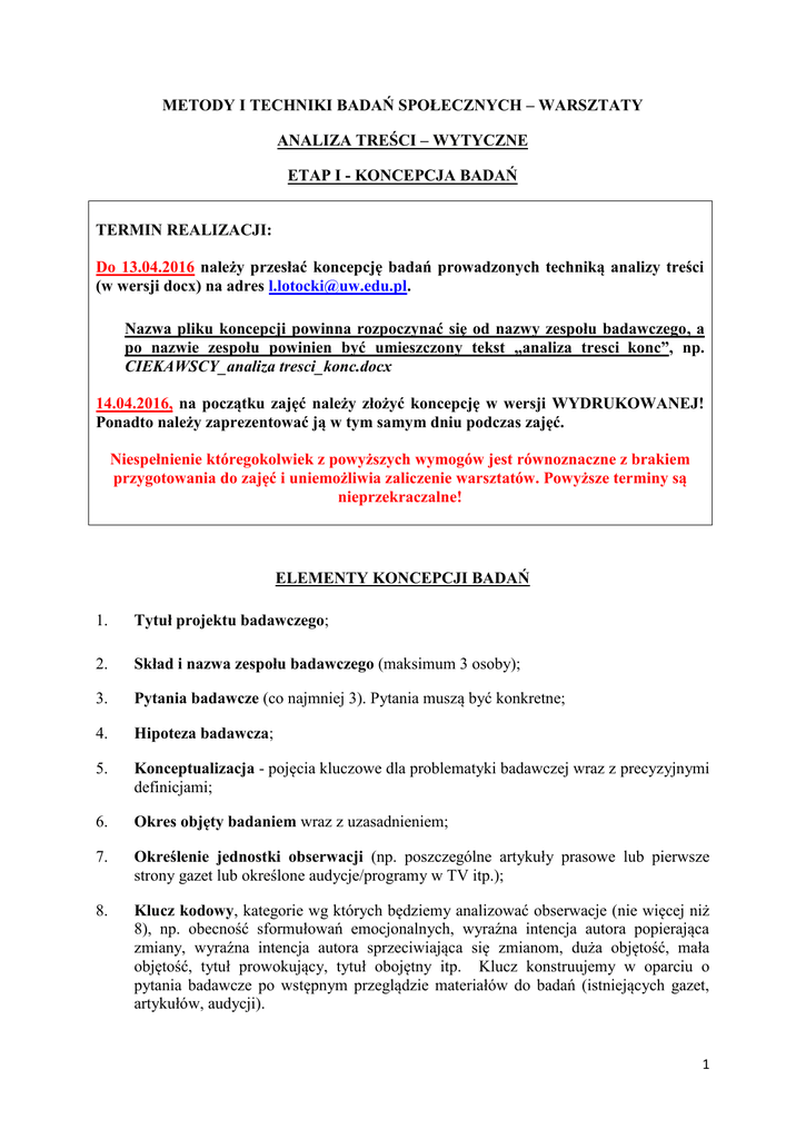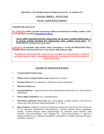 METODY I TECHNIKI BADAŃ SPOŁECZNYCH – WARSZTATY ANALIZA TREŚCI – WYTYCZNE ETAP I - KONCEPCJA BADAŃ TERMIN REALIZACJI: Do 13.04.2016 należy przesłać koncepcję badań prowadzonych techniką analizy treści (w wersji docx) na adres [email protected]. Nazwa pliku koncepcji powinna rozpoczynać się od nazwy zespołu badawczego, a po nazwie zespołu powinien być umieszczony tekst „analiza tresci_konc”, np. CIEKAWSCY_analiza tresci_konc.docx 14.04.2016, na początku zajęć należy złożyć koncepcję w wersji WYDRUKOWANEJ! Ponadto należy zaprezentować ją w tym samym dniu podczas zajęć. Niespełnienie któregokolwiek z powyższych wymogów jest równoznaczne z brakiem przygotowania do zajęć i uniemożliwia zaliczenie warsztatów. Powyższe terminy są nieprzekraczalne! ELEMENTY KONCEPCJI BADAŃ 1. Tytuł projektu badawczego; 2. Skład i nazwa zespołu badawczego (maksimum 3 osoby); 3. Pytania badawcze (co najmniej 3). Pytania muszą być konkretne; 4. Hipoteza badawcza; 5. Konceptualizacja - pojęcia kluczowe dla problematyki badawczej wraz z precyzyjnymi definicjami; 6. Okres objęty badaniem wraz z uzasadnieniem; 7. Określenie jednostki obserwacji (np. poszczególne artykuły prasowe lub pierwsze strony gazet lub określone audycje/programy w TV itp.); 8. Klucz kodowy, kategorie wg których będziemy analizować obserwacje (nie więcej niż 8), np. obecność sformułowań emocjonalnych, wyraźna intencja autora popierająca zmiany, wyraźna intencja autora sprzeciwiająca się zmianom, duża objętość, mała objętość, tytuł prowokujący, tytuł obojętny itp. Klucz konstruujemy w oparciu o pytania badawcze po wstępnym przeglądzie materiałów do badań (istniejących gazet, artykułów, audycji). 1 Klucz kodowy Zmienna Np. ton artykułu Zakres zmienności Np. 1. Przychylny, 2. Przeciwny, 3. Neutralny Instrukcja 1 zaznaczamy, jeżeli autor w sposób bezpośredni bądź pośredni (np. poprzez pozytywne określenia, korzystne fotografie itp.) sympatyzuje z określonym stanowiskiem, 2 zaznaczamy, jeżeli...., 3 - jeżeli ... itd. 9. Główne założenia analizy jakościowej (w punktach), np. 1. W analizie jakościowej zidentyfikowane zostaną główne schematy argumentacji, które zostaną zilustrowane cytatami z artykułów, 2. ..., 3... itp. ETAP II - REALIZACJA BADANIA I PRZYGOTOWANIE RAPORTU TERMIN REALIZACJI: Do 27.04.2016 r. należy przesłać na adres [email protected]: 1. Zbiór zakodowanych obserwacji w formacie sav lub xls; 2. Raport z badania w formacie docx; 3. Prezentację PowerPoint (patrz poniżej). Nazwa pliku zbioru powinna rozpoczynać się od nazwy zespołu badawczego, a po nazwie zespołu powinien być umieszczony tekst „analiza treści_rap”, np. CIEKAWSCY_analiza treści_rap.sav (CIEKAWSCY_analiza treści_rap.xls) Nazwa pliku raportu powinna rozpoczynać się od nazwy zespołu badawczego, a po nazwie zespołu powinien być umieszczony tekst „analiza treści_rap”, np. CIEKAWSCY_analiza treści_rap.docx. Nazwa pliku prezentacji powinna rozpoczynać się od nazwy zespołu badawczego, a po nazwie zespołu powinien być umieszczony tekst „analiza treści_rap”, np. CIEKAWSCY_analiza treści_rap_pptx. 28.04.2016 należy dostarczyć na zajęcia: 1. WYDRUKOWANĄ wersję raportu w formacie doc/docx; 2. Prezentację PowerPoint (w wersji elektronicznej), którą przedstawiamy na zajęciach (niezależnie od przesłania jej prowadzącemu dzień wcześniej); 2 3. Zbiór zakodowanych obserwacji w formacie sav lub xls (może być wersja elektroniczna; niezależnie od przesłania jej prowadzącemu dzień wcześniej); Niespełnienie któregokolwiek z powyższych wymogów jest równoznaczne z brakiem przygotowania do zajęć i uniemożliwia zaliczenie warsztatów. Powyższe terminy są nieprzekraczalne! ZADANIA 1. Tworzymy zbiór 30 zakodowanych obserwacji (w programie SPSS, PSPP lub Excel) – możemy wysyłając SMS wykupić dostęp do bazy artykułów prasowych konkretnego tytułu z ostatnich kilkunastu lat (większość tytułów ma taką opcję) i szybko przejrzeć bazę wyszukując artykuły, możemy udać się do biblioteki. Możemy skorzystać z baz programów telewizyjnych VOD, Youtube itp.); 2. Prowadzimy analizę ilościową, po zakodowaniu obserwacji wg klucza kodowego, zliczamy kody, szukamy zależności itp.; 3. Prowadzimy analizę jakościową opierając się na tych samych kategoriach analizy. Zastanawiamy się „co dokładniej autor miał na myśli” i jaki skutek może powodować artykuł u czytelnika. O czym świadczą poszczególne zabiegi (np. językowe) lub co mogą powodować. Możemy odnieść wypowiedzi autora do stanu faktycznego itp. W raporcie zilustrujemy poszczególne kategorie cytatami i bardziej pogłębionymi analizami, interpretacjami; 4. Opracowujemy raport z badania w formie dokumentu tekstowego oraz prezentacji PowerPoint. ELEMENTY RAPORTU Z BADAŃ (DOCX) 1. Okładka (nagłówek, tytuł projektu badawczego, nazwa i skład zespołu badawczego, data, itp.); 2. Streszczenie raportu (1 strona) (przedmiot badań, główne wnioski); 3. Spis treści; 4. Wprowadzenie / wstęp (1 strona) (ogólnie o projekcie / co jest w raporcie); 5. Koncepcja badań (2-3 strony) – temat badań, tytuł[y] prasowe/telewizyjne, liczba obserwacji (artykułów, przekazów), zasady doboru obserwacji, pytania i hipotezy badawcze, badany okres wraz z uzasadnieniem, klucz kodowy – kategorie wg których analizowano artykuły; 3 6. Analiza treści artykułów (10-12 stron). Analizę ilościową prowadzimy wg klucza kodowego wraz z opisem, analizą i interpretacją. Dane prezentujemy również w tabelach lub na wykresach, tak aby były maksymalnie czytelne. Tabelki i wykresy podpisujemy (na górze tytuł, na dole źródło, np. Opracowanie własne). Opisujemy je także w tekście – niezależnie od tego pamiętajmy, że tabelki, wykresy itp. powinny być „samoobjaśniające się”. Analiza jakościowa obserwacji może zostać umieszczona