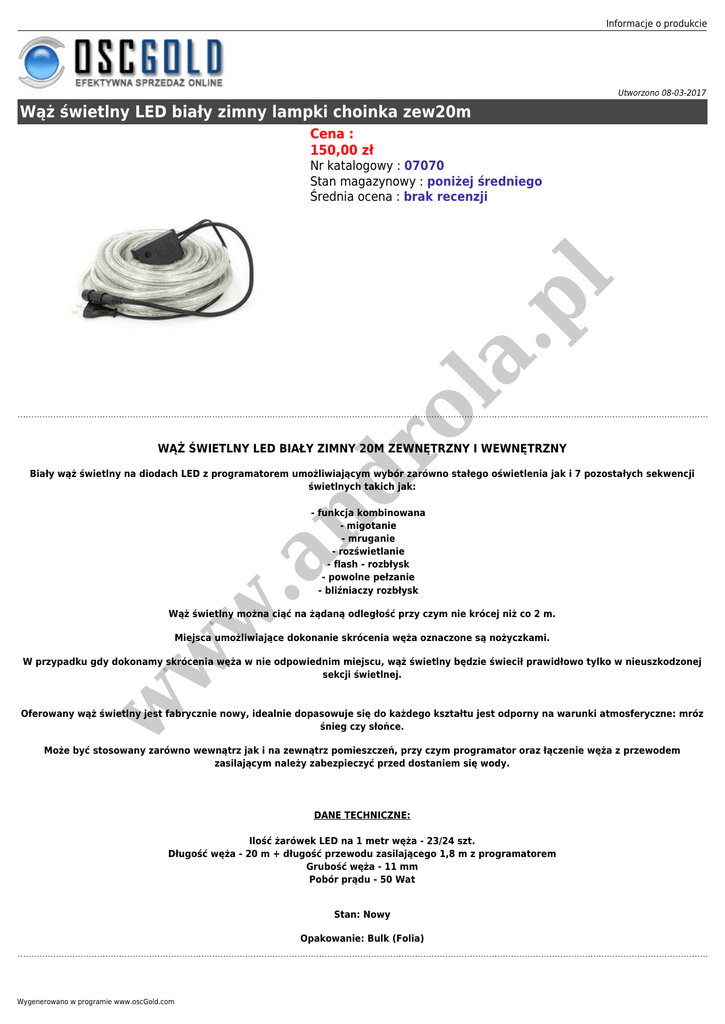 Informacje o produkcie Utworzono 08-03-2017 Wąż świetlny LED biały zimny lampki choinka zew20m Cena : 150,00 zł ro la .p l Nr katalogowy : 07070 Stan magazynowy : poniżej średniego Średnia ocena : brak recenzji WĄŻ ŚWIETLNY LED BIAŁY ZIMNY 20M ZEWNĘTRZNY I WEWNĘTRZNY nd Biały wąż świetlny na diodach LED z programatorem umożliwiającym wybór zarówno stałego oświetlenia jak i 7 pozostałych sekwencji świetlnych takich jak: w .a - funkcja kombinowana - migotanie - mruganie - rozświetlanie - flash - rozbłysk - powolne pełzanie - bliźniaczy rozbłysk Wąż świetlny można ciąć na żądaną odległość przy czym nie krócej niż co 2 m. w Miejsca umożliwiające dokonanie skrócenia węża oznaczone są nożyczkami. w W przypadku gdy dokonamy skrócenia węża w nie odpowiednim miejscu, wąż świetlny będzie świecił prawidłowo tylko w nieuszkodzonej sekcji świetlnej. Oferowany wąż świetlny jest fabrycznie nowy, idealnie dopasowuje się do każdego kształtu jest odporny na warunki atmosferyczne: mróz śnieg czy słońce. Może być stosowany zarówno wewnątrz jak i na zewnątrz pomieszczeń, przy czym programator oraz łączenie węża z przewodem zasilającym należy zabezpieczyć przed dostaniem się wody. DANE TECHNICZNE: Ilość żarówek LED na 1 metr węża - 23/24 szt. Długość węża - 20 m + długość przewodu zasilającego 1,8 m z programatorem Grubość węża - 11 mm Pobór prądu - 50 Wat Stan: Nowy Opakowanie: Bulk (Folia) Wygenerowano w programie www.oscGold.com