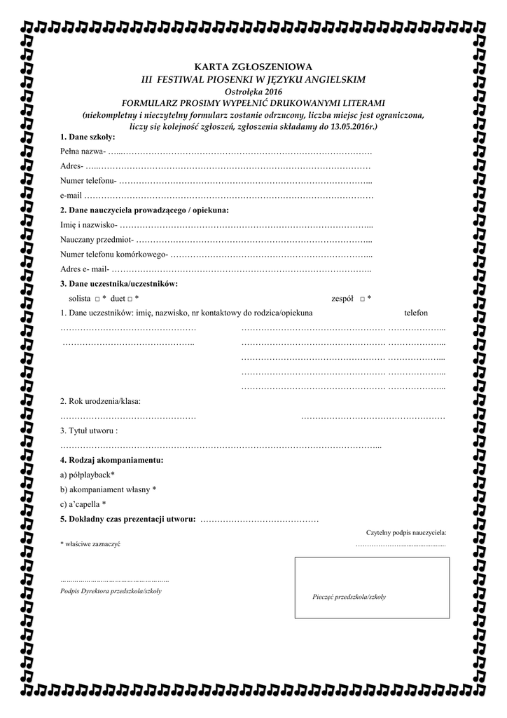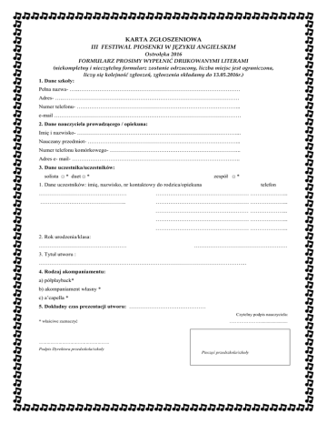 KARTA ZGŁOSZENIOWA III FESTIWAL PIOSENKI W JĘZYKU ANGIELSKIM Ostrołęka 2016 FORMULARZ PROSIMY WYPEŁNIĆ DRUKOWANYMI LITERAMI (niekompletny i nieczytelny formularz zostanie odrzucony, liczba miejsc jest ograniczona, liczy się kolejność zgłoszeń, zgłoszenia składamy do 13.05.2016r.) 1. Dane szkoły: Pełna nazwa- …...……………………………………………………………………………. Adres- …..…………………………………………………………………………………… Numer telefonu- ……………………………………………………………………………... e-mail ………………………………………………………………………………………… 2. Dane nauczyciela prowadzącego / opiekuna: Imię i nazwisko- ……………………………………………………………………………... Nauczany przedmiot- ………………………………………………………………………... Numer telefonu komórkowego- ……………………………………………………………... Adres e- mail- ……………………………………………………………………………….. 3. Dane uczestnika/uczestników: solista □ * duet □ * zespół □ * 1. Dane uczestników: imię, nazwisko, nr kontaktowy do rodzica/opiekuna telefon ………………………………………… …………………………………………… ………………... ……………………………………….. …………………………………………… ………………... …………………………………………… ………………... …………………………………………… ………………... …………………………………………… ………………... 2. Rok urodzenia/klasa: ………………………………………… …………………………………………… 3. Tytuł utworu : …………………………………………………………………………………………………... 4. Rodzaj akompaniamentu: a) półplayback* b) akompaniament własny * c) a’capella * 5. Dokładny czas prezentacji utworu: …………………………………… Czytelny podpis nauczyciela: * właściwe zaznaczyć …………………......................... ……………………………………………… Podpis Dyrektora przedszkola/szkoły Pieczęć przedszkola/szkoły Wyrażam zgodę na udział mojego dziecka w III FESTIWALU PIOSENKI W JĘZYKU ANGIELSKIM 2016 oraz na przetwarzanie danych osobowych i publikację wizerunku w materiałach dotyczących festiwalu i działalności organizatorów. Data i podpis rodzica/prawnego opiekuna oraz nr kontaktowy: ……………………………………………………………………