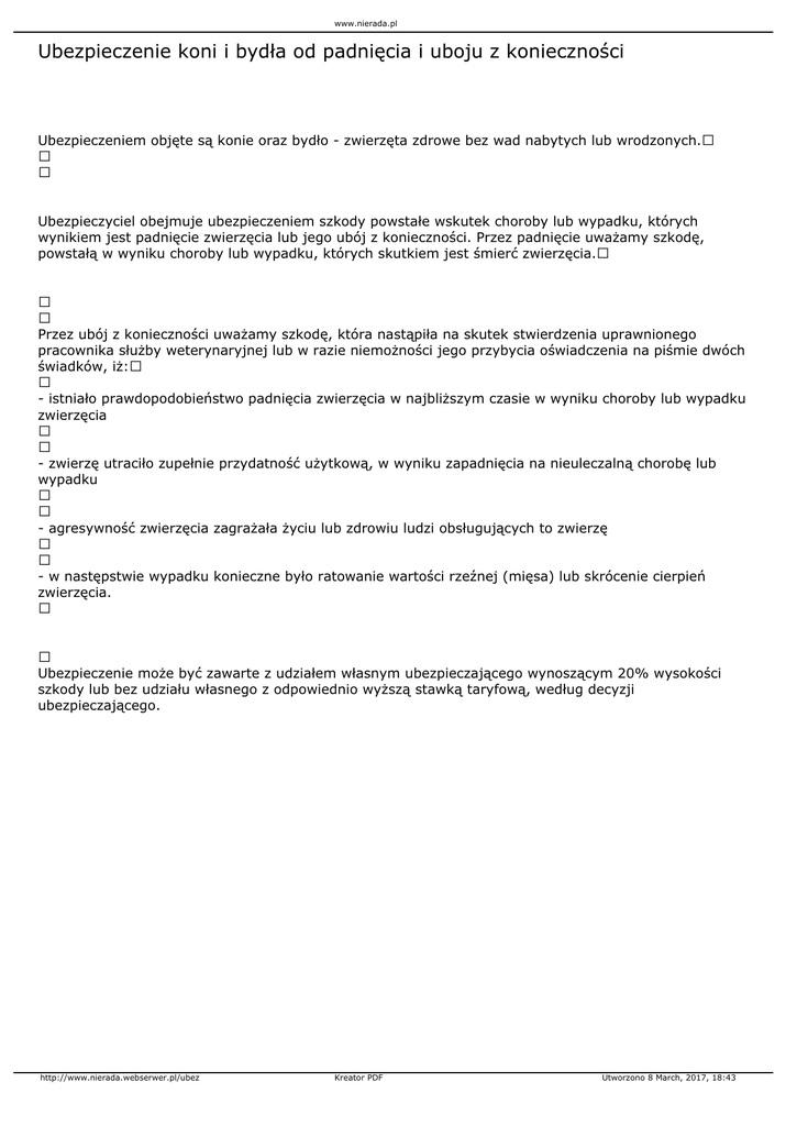 www.nierada.pl Ubezpieczenie koni i bydła od padnięcia i uboju z konieczności Ubezpieczeniem objęte są konie oraz bydło - zwierzęta zdrowe bez wad nabytych lub wrodzonych. Ubezpieczyciel obejmuje ubezpieczeniem szkody powstałe wskutek choroby lub wypadku, których wynikiem jest padnięcie zwierzęcia lub jego ubój z konieczności. Przez padnięcie uważamy szkodę, powstałą w wyniku choroby lub wypadku, których skutkiem jest śmierć zwierzęcia. Przez ubój z konieczności uważamy szkodę, która nastąpiła na skutek stwierdzenia uprawnionego pracownika służby weterynaryjnej lub w razie niemożności jego przybycia oświadczenia na piśmie dwóch świadków, iż: - istniało prawdopodobieństwo padnięcia zwierzęcia w najbliższym czasie w wyniku choroby lub wypadku zwierzęcia - zwierzę utraciło zupełnie przydatność użytkową, w wyniku zapadnięcia na nieuleczalną chorobę lub wypadku - agresywność zwierzęcia zagrażała życiu lub zdrowiu ludzi obsługujących to zwierzę - w następstwie wypadku konieczne było ratowanie wartości rzeźnej (mięsa) lub skrócenie cierpień zwierzęcia. Ubezpieczenie może być zawarte z udziałem własnym ubezpieczającego wynoszącym 20% wysokości szkody lub bez udziału własnego z odpowiednio wyższą stawką taryfową, według decyzji ubezpieczającego. http://www.nierada.webserwer.pl/ubez Kreator PDF Utworzono 8 March, 2017, 18:43