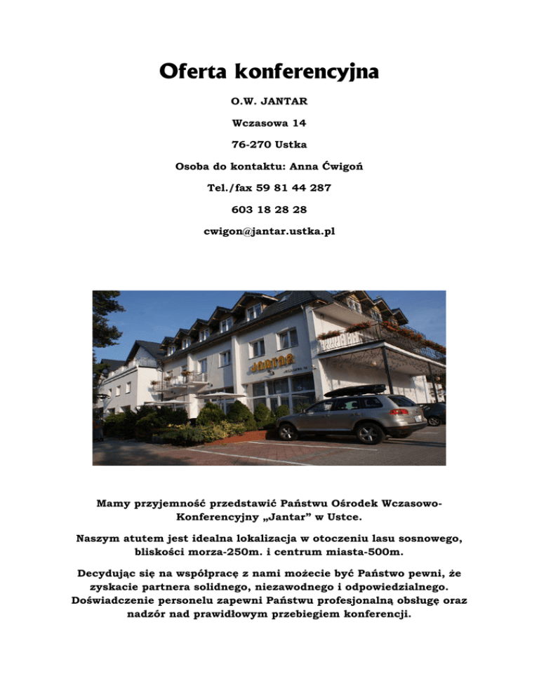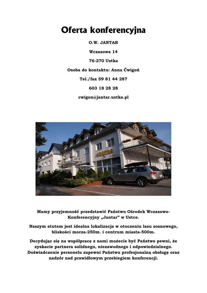 Oferta konferencyjna O.W. JANTAR Wczasowa 14 76-270 Ustka Osoba do kontaktu: Anna Ćwigoń Tel./fax 59 81 44 287 603 18 28 28 [email protected] Mamy przyjemność przedstawić Państwu Ośrodek WczasowoKonferencyjny „Jantar” w Ustce. Naszym atutem jest idealna lokalizacja w otoczeniu lasu sosnowego, bliskości morza-250m. i centrum miasta-500m. Decydując się na współpracę z nami możecie być Państwo pewni, że zyskacie partnera solidnego, niezawodnego i odpowiedzialnego. Doświadczenie personelu zapewni Państwu profesjonalną obsługę oraz nadzór nad prawidłowym przebiegiem konferencji. Pokoje hotelowe: Dysponujemy: 10 pokoi 1 osobowych 12 pokoi 2 osobowych standard 26 pokoi 2 osobowych komfort 9 pokoi 3 osobowych 2 apartamenty - 2 osobowe 2 apartamenty 3 osobowe Pokój 1 osobowy - 140zł. Pokój 2 osobowy - 190zł. Pokój 2 osobowy komfort - 220zł. Pokój 3 osobowy - 240zł. Apartament - 300zł. W cenę wliczono śniadania, podatek VAT, basen ,jacuzzi. Usługa hotelowa nie obowiązuje w lipcu oraz sierpniu. Wyżywienie: Wyżywienie: Obiad - 35zł./osoba* *Obiad jest porcjowany - składa sie z 3 dań. Kolacja - 25zł/osoba Obiadokolacja - 50zł/osoba Uroczysta kolacja - 90-150zł./osoba Grill - 50-90zł./osoba Śniadanie, kolację oraz obiadokolację serwujemy na szwedzkim stole. Przerwa kawowa standard (kawa, herbata, ciastka, ciasta, soki, woda) 15zł/osoba Serwis kawowy ciągły - 30zł/osoba Przerwa kawowa z przekąskami - (kawa, herbata, ciastka, ciasta, soki, woda, przekąski koktajlowe, owoce) - 25zł/osoba Serwis kawowy z przekąskami ciągły - 60zł/osoba Sale konferencyjne: Sala konferencyjna "A" Sala konferencyjna "B" do 30 osób - 380zł/doba do 30 osób - 380zł/doba od 30 do 60 osób -680zł./doba od 30 do 60 osób -680zł./doba od 60- 120 osób - 880zł./doba od 60- 100 osób - 880zł./doba Ustawienie sal Sala „A” 120 45 54 Sala „B” 100 40 36 Sala bankietowa 200 160 100 Wyposażenie sal: 1. 2. 3. 4. 5. 6. Projektor multimedialny Ekran Nagłośnienie sali Zaciemnienie sali Flip chart Internet bezprzewodowy