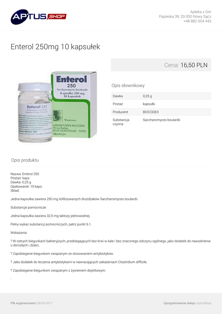 Apteka z Gór Papieska 39, 33-300 Nowy Sącz +48 882 004 443 Enterol 250mg 10 kapsułek Cena: 16,50 PLN Opis słownikowy Dawka 0,25 g Postać kapsułki Producent BIOCODEX Substancja czynna Saccharomyces boulardii Opis produktu Nazwa: Enterol 250 Postać: kaps. Dawka: 0,25 g Opakowanie: 10 kaps. Skład: Jedna kapsułka zawiera 250 mg liofilizowanych drożdżaków Saccharomyces boulardii. Substancje pomocnicze: Jedna kapsułka zawiera 32,5 mg laktozy jednowodnej. Pełny wykaz substancji pomocniczych, patrz punkt 6.1. Wskazania: ? W ostrych biegunkach bakteryjnych, przebiegających bez krwi w kale i bez znacznego odczynu ogólnego, jako dodatek do nawodnienia u dorosłych i dzieci. ? Zapobieganie biegunkom związanym ze stosowaniem antybiotyków. ? Jako dodatek do leczenia antybiotykami w nawracających zakażeniach Clostridium difficile. ? Zapobieganie biegunkom związanym z żywieniem dojelitowym. : Plik wygenerowano: 08-03-2017 Oprogramowanie sklepu: AptusShop Apteka z Gór Papieska 39, 33-300 Nowy Sącz +48 882 004 443 Nie stosować preparatu: - w przypadku nadwrażliwości na którykolwiek składnik preparatu. - u pacjentów z cewnikiem założonym do żyły centralnej. Działania niepożądane: Opisano bardzo rzadkie przypadki fungemii Saccharomyces boulardii z dodatnimi posiewami z krwi pacjenta. Przypadki te dotyczyły pacjentów hospitalizowanych, z założonym cewnikiem do żyły centralnej, pacjentów z zaburzeniami odporności i pacjentów z ciężkimi schorzeniami przewodu pokarmowego lub leczonych dużymi dawkami preparatu Enterol 250. We wszystkich przypadkach fungemia ustąpiła po zastosowaniu leczenia przeciwgrzybicznego lub po usunięciu cewnika z żyły centralnej. W czasie badań klinicznych niekiedy występowały bóle w nadbrzuszu i wzdęcia, które zwykle nie wymagały przerwania stosowania preparatu Enterol 250. Interakcje: Preparatu Enterol 250 nie należy podawać jednocześnie z lekami przeciwgrzybiczymi stosowanymi doustnie lub dożylnie, ponieważ zawarty w preparacie Enterol 250 Saccharomyces boulardii jest gatunkiem drożdżaków. Dawkowanie: Lek należy stosować doustnie. 1 do 2 kapsułek na dobę. Kapsułki należy połykać popijając wodą. Kapsułkę można otworzyć, a jej zawartość wsypać do niewielkiej ilości osłodzonego napoju, pokarmu lub dodać do butelki z pokarmem dla dziecka. W celu uzyskania najlepszego działania powinno się unikać stosowania bezpośrednio po posiłkach. Ze względu na ryzyko zadławienia u dzieci w wieku do 6 lat zaleca się otwieranie kapsułek i dodawanie ich zawartości do napoju lub pokarmu. U dzieci oraz pacjentów żywionych dojelitowo zaleca się stosowanie leku w postaci proszku do sporządzania zawiesiny doustnej. Środki ostrożności: Enterol 250 zawiera żywe komórki. Z tego powodu nie należy mieszać go ze zbyt gorącymi (o temperaturze powyżej 50ºC) lub zimnymi płynami, potrawami i z alkoholem. Leczenie preparatem Enterol 250 jest dodatkiem do niezbędnego nawodnienia pacjenta. Objętość podawanych płynów oraz droga ich podawania (doustna lub dożylna) powinna być dostosowana do nasilenia biegunki, wieku i stanu ogólnego pacjenta. Preparat Enterol 250 zawiera laktozę jednowodną, dlatego nie powinien być stosowany u pacjentów z rzadko występującą dziedziczną nietolerancją galaktozy, niedoborem laktazy (typu Lapp) lub zespołem złego wchłaniania glukozy-galaktozy. Prowadzenie pojazdów: Nie stwierdzono wpływu preparatu Enterol 250 na zdolność prowadzenia pojazdów mechanicznych, obsługiwania urządzeń mechanicznych i sprawność psychofizyczną. Przedawkowanie: Brak danych dotyczących przedawkowania preparatu Enterol 250. Ciąża: W badaniach na zwierzętach nie stwierdzono działania teratogennego. Nie ma klinicznych doniesień o wywoływaniu wad rozwojowych oraz działaniu uszkadzającym płód, jednak nie pozwala to na wykluczenie wszelkiego ryzyka. Dlatego ze względów bezpieczeństwa nie zaleca się stosowania preparatu w czasie ciąży. Plik wygenerowano: 08-03-2017 Oprogramowanie sklepu: AptusShop Apteka z Gór Papieska 39, 33-300 Nowy Sącz +48 882 004 443 Laktacja Ze względu na brak danych nie zaleca się stosowania preparatu w okresie karmienia piersią. Plik wygenerowano: 08-03-2017 Powered by TCPDF (www.tcpdf.org) Oprogramowanie sklepu: AptusShop