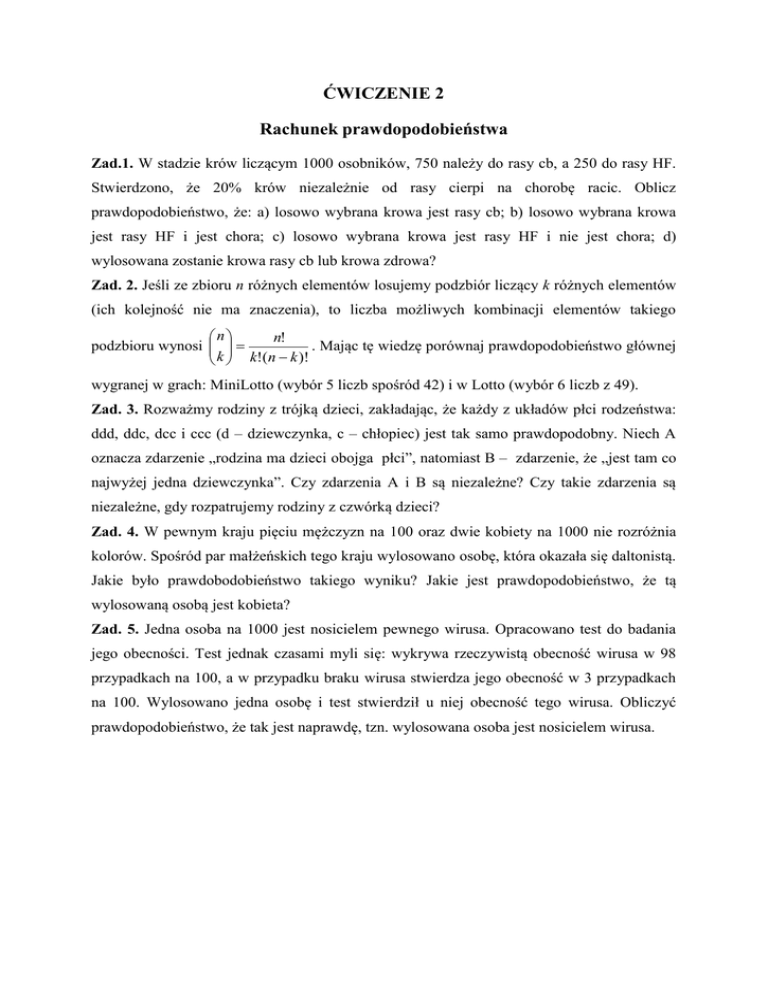 ĆWICZENIE 2 Rachunek prawdopodobieństwa Zad.1. W stadzie krów liczącym 1000 osobników, 750 należy do rasy cb, a 250 do rasy HF. Stwierdzono, że 20% krów niezależnie od rasy cierpi na chorobę racic. Oblicz prawdopodobieństwo, że: a) losowo wybrana krowa jest rasy cb; b) losowo wybrana krowa jest rasy HF i jest chora; c) losowo wybrana krowa jest rasy HF i nie jest chora; d) wylosowana zostanie krowa rasy cb lub krowa zdrowa? Zad. 2. Jeśli ze zbioru n różnych elementów losujemy podzbiór liczący k różnych elementów (ich kolejność nie ma znaczenia), to liczba możliwych kombinacji elementów takiego n n! podzbioru wynosi . Mając tę wiedzę porównaj prawdopodobieństwo głównej k k!(n k )! wygranej w grach: MiniLotto (wybór 5 liczb spośród 42) i w Lotto (wybór 6 liczb z 49). Zad. 3. Rozważmy rodziny z trójką dzieci, zakładając, że każdy z układów płci rodzeństwa: ddd, ddc, dcc i ccc (d – dziewczynka, c – chłopiec) jest tak samo prawdopodobny. Niech A oznacza zdarzenie „rodzina ma dzieci obojga płci”, natomiast B – zdarzenie, że „jest tam co najwyżej jedna dziewczynka”. Czy zdarzenia A i B są niezależne? Czy takie zdarzenia są niezależne, gdy rozpatrujemy rodziny z czwórką dzieci? Zad. 4. W pewnym kraju pięciu mężczyzn na 100 oraz dwie kobiety na 1000 nie rozróżnia kolorów. Spośród par małżeńskich tego kraju wylosowano osobę, która okazała się daltonistą. Jakie było prawdobodobieństwo takiego wyniku? Jakie jest prawdopodobieństwo, że tą wylosowaną osobą jest kobieta? Zad. 5. Jedna osoba na 1000 jest nosicielem pewnego wirusa. Opracowano test do badania jego obecności. Test jednak czasami myli się: wykrywa rzeczywistą obecność wirusa w 98 przypadkach na 100, a w przypadku braku wirusa stwierdza jego obecność w 3 przypadkach na 100. Wylosowano jedna osobę i test stwierdził u niej obecność tego wirusa. Obliczyć prawdopodobieństwo, że tak jest naprawdę, tzn. wylosowana osoba jest nosicielem wirusa.