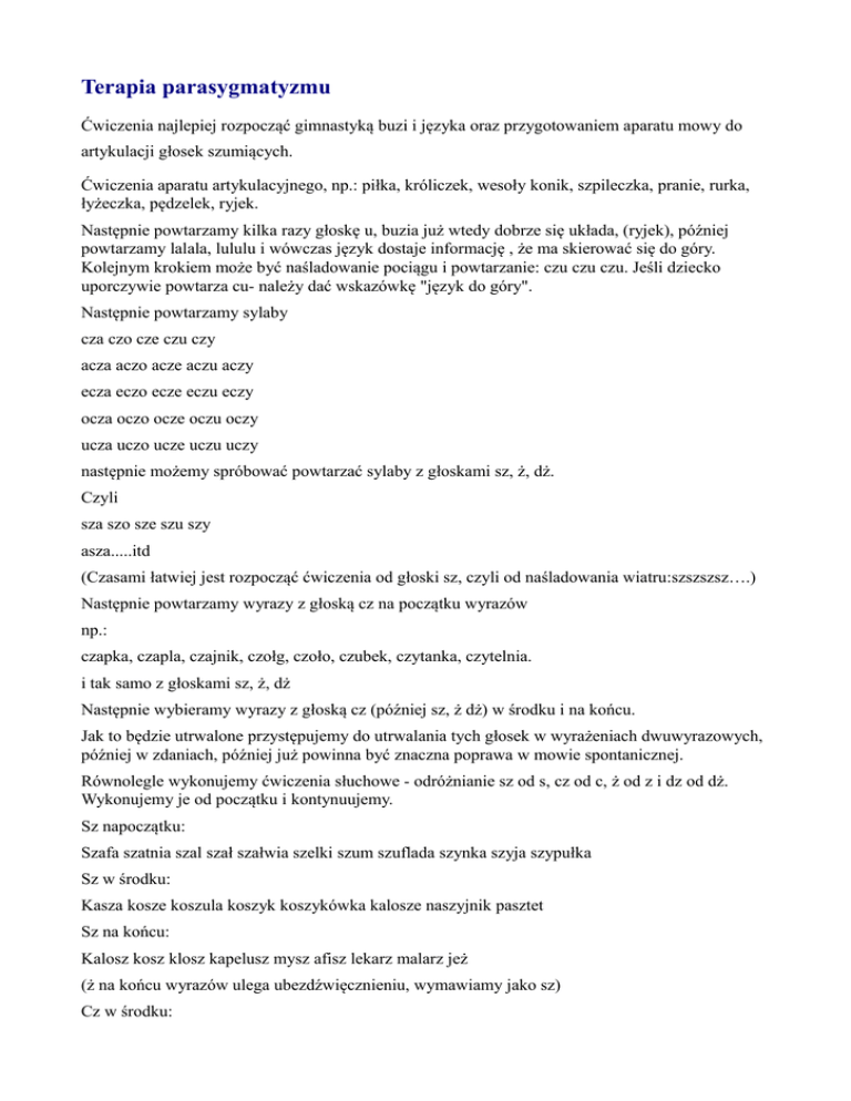 Terapia parasygmatyzmu Ćwiczenia najlepiej rozpocząć gimnastyką buzi i języka oraz przygotowaniem aparatu mowy do artykulacji głosek szumiących. Ćwiczenia aparatu artykulacyjnego, np.: piłka, króliczek, wesoły konik, szpileczka, pranie, rurka, łyżeczka, pędzelek, ryjek. Następnie powtarzamy kilka razy głoskę u, buzia już wtedy dobrze się układa, (ryjek), później powtarzamy lalala, lululu i wówczas język dostaje informację , że ma skierować się do góry. Kolejnym krokiem może być naśladowanie pociągu i powtarzanie: czu czu czu. Jeśli dziecko uporczywie powtarza cu- należy dać wskazówkę "język do góry". Następnie powtarzamy sylaby cza czo cze czu czy acza aczo acze aczu aczy ecza eczo ecze eczu eczy ocza oczo ocze oczu oczy ucza uczo ucze uczu uczy następnie możemy spróbować powtarzać sylaby z głoskami sz, ż, dż. Czyli sza szo sze szu szy asza.....itd (Czasami łatwiej jest rozpocząć ćwiczenia od głoski sz, czyli od naśladowania wiatru:szszszsz….) Następnie powtarzamy wyrazy z głoską cz na początku wyrazów np.: czapka, czapla, czajnik, czołg, czoło, czubek, czytanka, czytelnia. i tak samo z głoskami sz, ż, dż Następnie wybieramy wyrazy z głoską cz (później sz, ż dż) w środku i na końcu. Jak to będzie utrwalone przystępujemy do utrwalania tych głosek w wyrażeniach dwuwyrazowych, później w zdaniach, później już powinna być znaczna poprawa w mowie spontanicznej. Równolegle wykonujemy ćwiczenia słuchowe - odróżnianie sz od s, cz od c, ż od z i dz od dż. Wykonujemy je od początku i kontynuujemy. Sz napoczątku: Szafa szatnia szal szał szałwia szelki szum szuflada szynka szyja szypułka Sz w środku: Kasza kosze koszula koszyk koszykówka kalosze naszyjnik pasztet Sz na końcu: Kalosz kosz klosz kapelusz mysz afisz lekarz malarz jeż (ż na końcu wyrazów ulega ubezdźwięcznieniu, wymawiamy jako sz) Cz w środku: Haczyk oczy pieczątka uczeń wnuczek mleczko kaczka taczka beczka teczka pocztówka kluczyk apteczka kubeczek Cz na końcu: Biegacz bogacz badacz palacz płacz mecz mlecz klucz miecz bicz Głoska dż Dżokej dżem dżungla dżentelmen dżuma