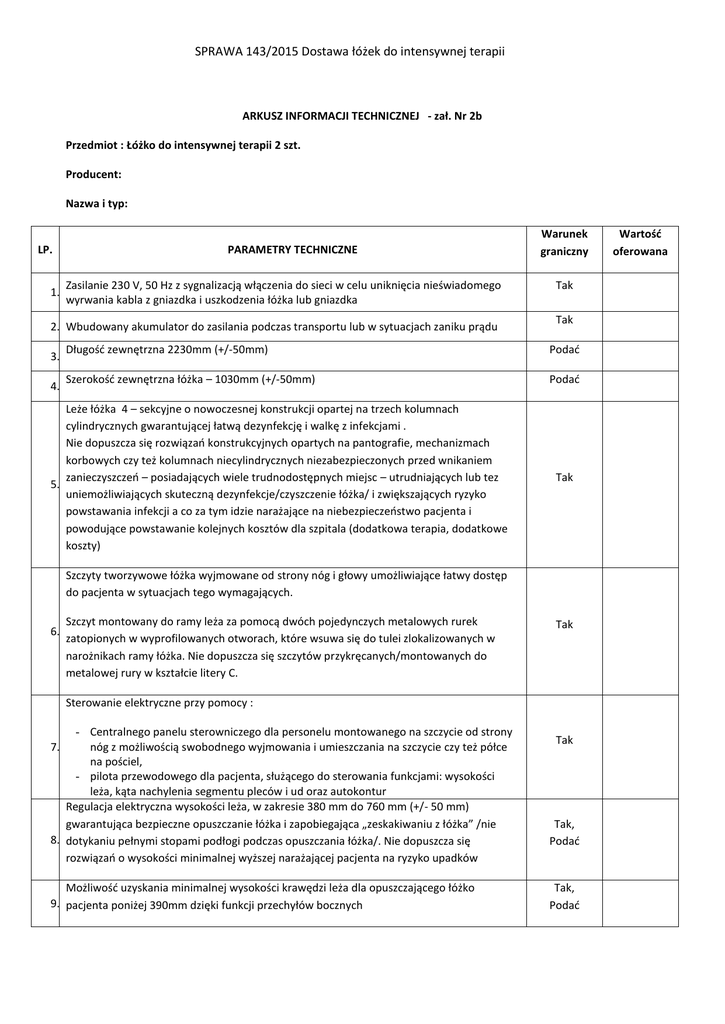SPRAWA 143/2015 Dostawa łóżek do intensywnej terapii ARKUSZ INFORMACJI TECHNICZNEJ - zał. Nr 2b Przedmiot : Łóżko do intensywnej terapii 2 szt. Producent: Nazwa i typ: LP. 1. PARAMETRY TECHNICZNE Zasilanie 230 V, 50 Hz z sygnalizacją włączenia do sieci w celu uniknięcia nieświadomego wyrwania kabla z gniazdka i uszkodzenia łóżka lub gniazdka 2. Wbudowany akumulator do zasilania podczas transportu lub w sytuacjach zaniku prądu 3. 4. Warunek graniczny Tak Tak Długość zewnętrzna 2230mm (+/-50mm) Podać Szerokość zewnętrzna łóżka – 1030mm (+/-50mm) Podać Leże łóżka 4 – sekcyjne o nowoczesnej konstrukcji opartej na trzech kolumnach cylindrycznych gwarantującej łatwą dezynfekcję i walkę z infekcjami . Nie dopuszcza się rozwiązań konstrukcyjnych opartych na pantografie, mechanizmach korbowych czy też kolumnach niecylindrycznych niezabezpieczonych przed wnikaniem zanieczyszczeń – posiadających wiele trudnodostępnych miejsc – utrudniających lub tez 5. uniemożliwiających skuteczną dezynfekcje/czyszczenie łóżka/ i zwiększających ryzyko powstawania infekcji a co za tym idzie narażające na niebezpieczeństwo pacjenta i powodujące powstawanie kolejnych kosztów dla szpitala (dodatkowa terapia, dodatkowe koszty) Tak Szczyty tworzywowe łóżka wyjmowane od strony nóg i głowy umożliwiające łatwy dostęp do pacjenta w sytuacjach tego wymagających. 6. Szczyt montowany do ramy leża za pomocą dwóch pojedynczych metalowych rurek zatopionych w wyprofilowanych otworach, które wsuwa się do tulei zlokalizowanych w narożnikach ramy łóżka. Nie dopuszcza się szczytów przykręcanych/montowanych do metalowej rury w kształcie litery C. Tak Sterowanie elektryczne przy pomocy : - Centralnego panelu sterowniczego dla personelu montowanego na szczycie od strony nóg z możliwością swobodnego wyjmowania i umieszczania na szczycie czy też półce na pościel, - pilota przewodowego dla pacjenta, służącego do sterowania funkcjami: wysokości leża, kąta nachylenia segmentu pleców i ud oraz autokontur Regulacja elektryczna wysokości leża, w zakresie 380 mm do 760 mm (+/- 50 mm) gwarantująca bezpieczne opuszczanie łóżka i zapobiegająca „zeskakiwaniu z łóżka” /nie 8. dotykaniu pełnymi stopami podłogi podczas opuszczania łóżka/. Nie dopuszcza się rozwiązań o wysokości minimalnej wyższej narażającej pacjenta na ryzyko upadków 7. Możliwość uzyskania minimalnej wysokości krawędzi leża dla opuszczającego łóżko 9. pacjenta poniżej 390mm dzięki funkcji przechyłów bocznych Tak Tak, Podać Tak, Podać Wartość oferowana SPRAWA 143/2015 Dostawa łóżek do intensywnej terapii - 10. 11. Regulacja elektryczna części - Tak, Podać Tak, Podać Regulacja elektryczna funkcji autokontur, sterowana jednym przyciskiem przy pomocy pilota dla pacjenta i centralnego panelu sterowniczego montowanego na szczycie łóżka od 12. strony nóg Tak Funkcja autoregresji segmentu pleców zmniejszająca ryzyko powstawania odleżyn. Funkcja autoregresji działająca na zasadzie odsuwania się dolnej krawędzi segmentu minimalizująca 13. nacisk w odcinku krzyżowo-lędźwiowym a tym samym pełniąca funkcję profilaktyczną przeciwko odleżynom stopnia 1-4 Tak – sterowanie z panelu 14. sterowniczego montowanego na szczycie łóżka od strony nóg Podać Regulacja elektryczna pozycji anty- ) – sterowanie z panelu 15. sterowniczego montowanego na szczycie łóżka od strony nóg. Podać 16. Regulacja elektryczna przechyłów bocznych z centralnego panelu sterowniczego Tak Tak 17. Regulacja elektryczna do pozycji krzesła kardiologicznego – sterowanie przy pomocy jednego oznaczonego odpowiednim piktogramem przycisku na panelu sterowniczym 18. montowanym na szczycie łóżka od strony nóg Tak Elektryczna funkcja CPR– sterowana przy pomocy jednego przycisku oznaczonego odpowiednim piktogramem na panelu sterowniczym montowanym na szczycie łóżka od 19. strony nóg Tak Elektryczna, natychmiastowa pozycja antyszokowa (pozycja ratująca życie)– sterowania przy pomocy jednego przycisku oznaczonego odpowiednim piktogramem na panelu 20. sterowniczym montowanym na szczycie łóżka od strony nóg Tak Elektryczna, natychmiastowa pozycja egzaminacyjna – sterowana przy pomocy przycisków nożnych i dodatkowo jednego przycisku oznaczonego odpowiednim piktogramem na 21. panelu sterowniczym montowanym na szczycie łóżka od strony nóg Tak Elektryczna funkcja mobilizacyjna, sterowana przy użyciu jednego przycisku, oznaczonego odpowiednim piktogramem na panelu sterowniczym montowanym na szczycie łóżka od 22. strony nóg, funkcja ułatwiająca opuszczanie łóżka przez pacjenta Wyłączniki/blokady funkcji elektrycznych (na panelu sterowniczym) dla poszczególnych regulacji: - regulacji wysokości 23. - regulacji części plecowej - regulacji części nożnej Tak SPRAWA 143/2015 Dostawa łóżek do intensywnej terapii - Trendelenburga i anty-Trendelenburga, - pozycji krzesła kardiologicznego, Zabezpieczenie przed nieświadomym uruchomieniem funkcji poprzez konieczność wciśnięcia przycisku uruchamiającego dostępność funkcji . Przycisk świadomego 24. uruchomienia systemu elektrycznego łóżka znajdujący się w każdym możliwym sterowaniu: panelu dla personelu oraz pilocie dla pacjenta, Tak Odłączenie wszelkich regulacji (za wyjątkiem elektrycznej funkcji CPR oraz Antyszkowej funkcje ratujące życie) z pilota , sterowań nożnych i panelu po 180 sekundach nieużywania 25. regulacji chroniącej pacjenta przed nagłymi niepożądanymi regulacjami (konieczność świadomego ponownego uruchomienia regulacji) Tak Przycisk bezpieczeństwa (oznaczony charakterystycznie: STOP lub tez o innym oznaczeniu) natychmiastowe odłączenie wszystkich funkcji elektrycznych (za wyjątkiem elektrycznej funkcji CPR oraz Antyszkowej - funkcje ratujące życie) w przypadku wystąpienia zagrożenia 26. dla pacjenta lub personelu również 