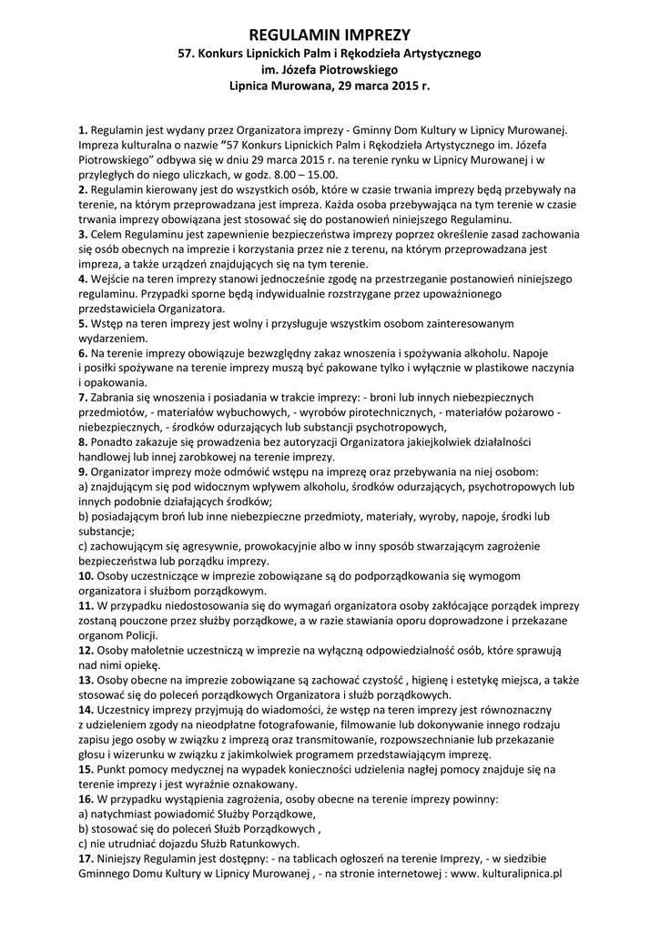 REGULAMIN IMPREZY 57. Konkurs Lipnickich Palm i Rękodzieła Artystycznego im. Józefa Piotrowskiego Lipnica Murowana, 29 marca 2015 r. 1. Regulamin jest wydany przez Organizatora imprezy - Gminny Dom Kultury w Lipnicy Murowanej. Impreza kulturalna o nazwie ”57 Konkurs Lipnickich Palm i Rękodzieła Artystycznego im. Józefa Piotrowskiego” odbywa się w dniu 29 marca 2015 r. na terenie rynku w Lipnicy Murowanej i w przyległych do niego uliczkach, w godz. 8.00 – 15.00. 2. Regulamin kierowany jest do wszystkich osób, które w czasie trwania imprezy będą przebywały na terenie, na którym przeprowadzana jest impreza. Każda osoba przebywająca na tym terenie w czasie trwania imprezy obowiązana jest stosować się do postanowień niniejszego Regulaminu. 3. Celem Regulaminu jest zapewnienie bezpieczeństwa imprezy poprzez określenie zasad zachowania się osób obecnych na imprezie i korzystania przez nie z terenu, na którym przeprowadzana jest impreza, a także urządzeń znajdujących się na tym terenie. 4. Wejście na teren imprezy stanowi jednocześnie zgodę na przestrzeganie postanowień niniejszego regulaminu. Przypadki sporne będą indywidualnie rozstrzygane przez upoważnionego przedstawiciela Organizatora. 5. Wstęp na teren imprezy jest wolny i przysługuje wszystkim osobom zainteresowanym wydarzeniem. 6. Na terenie imprezy obowiązuje bezwzględny zakaz wnoszenia i spożywania alkoholu. Napoje i posiłki spożywane na terenie imprezy muszą być pakowane tylko i wyłącznie w plastikowe naczynia i opakowania. 7. Zabrania się wnoszenia i posiadania w trakcie imprezy: - broni lub innych niebezpiecznych przedmiotów, - materiałów wybuchowych, - wyrobów pirotechnicznych, - materiałów pożarowo niebezpiecznych, - środków odurzających lub substancji psychotropowych, 8. Ponadto zakazuje się prowadzenia bez autoryzacji Organizatora jakiejkolwiek działalności handlowej lub innej zarobkowej na terenie imprezy. 9. Organizator imprezy może odmówić wstępu na imprezę oraz przebywania na niej osobom: a) znajdującym się pod widocznym wpływem alkoholu, środków odurzających, psychotropowych lub innych podobnie działających środków; b) posiadającym broń lub inne niebezpieczne przedmioty, materiały, wyroby, napoje, środki lub substancje; c) zachowującym się agresywnie, prowokacyjnie albo w inny sposób stwarzającym zagrożenie bezpieczeństwa lub porządku imprezy. 10. Osoby uczestniczące w imprezie zobowiązane są do podporządkowania się wymogom organizatora i służbom porządkowym. 11. W przypadku niedostosowania się do wymagań organizatora osoby zakłócające porządek imprezy zostaną pouczone przez służby porządkowe, a w razie stawiania oporu doprowadzone i przekazane organom Policji. 12. Osoby małoletnie uczestniczą w imprezie na wyłączną odpowiedzialność osób, które sprawują nad nimi opiekę. 13. Osoby obecne na imprezie zobowiązane są zachować czystość , higienę i estetykę miejsca, a także stosować się do poleceń porządkowych Organizatora i służb porządkowych. 14. Uczestnicy imprezy przyjmują do wiadomości, że wstęp na teren imprezy jest równoznaczny z udzieleniem zgody na nieodpłatne fotografowanie, filmowanie lub dokonywanie innego rodzaju zapisu jego osoby w związku z imprezą oraz transmitowanie, rozpowszechnianie lub przekazanie głosu i wizerunku w związku z jakimkolwiek programem przedstawiającym imprezę. 15. Punkt pomocy medycznej na wypadek konieczności udzielenia nagłej pomocy znajduje się na terenie imprezy i jest wyraźnie oznakowany. 16. W przypadku wystąpienia zagrożenia, osoby obecne na terenie imprezy powinny: a) natychmiast powiadomić Służby Porządkowe, b) stosować się do poleceń Służb Porządkowych , c) nie utrudniać dojazdu Służb Ratunkowych. 17. Niniejszy Regulamin jest dostępny: - na tablicach ogłoszeń na terenie Imprezy, - w siedzibie Gminnego Domu Kultury w Lipnicy Murowanej , - na stronie internetowej : www. kulturalipnica.pl