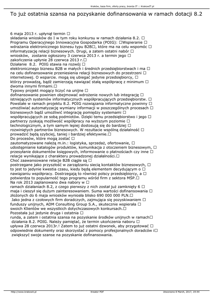 Kraków, baza firm, oferty pracy, branża IT :: KrakowIT.pl To już ostatnia szansa na pozyskanie dofinansowania w ramach dotacji 8.2 6 maja 2013 r. upłynął termin składania wniosków do I w tym roku konkursu w ramach działania 8.2. Programu Operacyjnego Innowacyjna Gospodarka (POIG): Wspieranie wdrażania elektronicznego biznesu typu B2B, które ma na celu wspomóc informatyzację relacji biznesowych. Drugi, a zatem ostatni nabór wniosków, zostanie ogłoszony 3 czerwca 2013 r. a termin jego zakończenia upłynie 28 czerwca 2013 r. Działanie 8.2. POIG stawia na rozwój elektronicznego biznesu B2B w małych i średnich przedsiębiorstwach i ma na celu dofinansowanie przeniesienia relacji biznesowych do przestrzeni internetowej. O wsparcie. mogą się ubiegać jedynie przedsiębiorcy, którzy prowadzą, bądź zamierzają nawiązać stałą współpracę z minimum dwoma innymi firmami. Typowy projekt mogący liczyć na unijne dofinansowanie powinien obejmować wdrożenie nowych lub integrację istniejących systemów informatycznych współpracujących przedsiębiorstw. Powstałe w ramach projektu 8.2. POIG rozwiązania informatyczne powinny umożliwiać automatyzację wymiany informacji w poszczególnych procesach biznesowych bądź umożliwić integrację pomiędzy systemami współpracujących ze sobą podmiotów. Dzięki temu przedsiębiorstwo i jego partnerzy zyskają możliwość współpracy na wyższym poziomie technologicznym, a tym samym lepiej dostosują się do bardziej rozwiniętych partnerów biznesowych. W rezultacie wspólną działalność prowadzić będą szybciej, taniej i bardziej efektywnie. Do procesów, które mogą zostać zautomatyzowane należą m.in.: logistyka, sprzedaż, ofertowanie, udostępnianie katalogów produktów, komunikacja z otoczeniem biznesowym, przesyłanie dokumentów księgowych, informowanie o płatnościach czy inne relacje wynikające z charakteru prowadzonej działalności. Choć zaawansowane relacje B2B ciągle są postrzegane jako przyszłość w zarządzaniu siecią kontaktów biznesowych, to jest to jedynie kwestia czasu, kiedy będą elementem decydującym o nawiązaniu współpracy. Dostrzegają to również polscy przedsiębiorcy, a potwierdza to popularność tego programu wśród firm z sektora MŚP. Na rok 2013 zaplanowano dwa nabory w ramach działaniach 8.2, z czego pierwszy z nich został już zamknięty 6 maja i cieszył się dużym zainteresowaniem. Suma wartości dofinansowania złożonych do 6 maja wniosków wyniosła blisko 690 000 000 PLN. Jako jedna z czołowych firm doradczych, zajmująca się pozyskiwaniem funduszy unijnych, ADM Consulting Group S.A., skutecznie wspierała swoich Klientów we wszystkich dotychczasowych konkursach. Pozostała już jedynie druga i ostatnia runda, a zatem i ostatnia szansa na pozyskanie środków unijnych w ramach działania 8.2. POIG. Należy pamiętać, że termin ukończenia naboru upływa 28 czerwca 2013r.! Zatem to już ostatni dzwonek, aby przygotować odpowiednie dokumenty oraz skorzystać z pomocy profesjonalnych doradców i zwiększyć swoje szanse na pozyskanie dofinansowania. http://www.krakowit.pl Kreator PDF Utworzono 8 March, 2017, 19:44