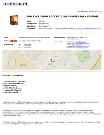 wygenerowano 08/03/2017 20:44 PRO EVOLUTION SOCCER 2016 ANNIVERSARY EDITION cena 106 zł dostępność Oczekujemy platforma PlayStation 3 odnośnik robson.pl/produkt,17056,pro_evolution_soccer_2016_anniversary_edition.html Adres ul.Powstańców Śląskich 106D/200 01-466 Warszawa Nr konta 25 1140 2004 0000 3702 4553 9550 Nr telefonów tel. 224096600 tel. 730305005 tel. 224361966 Godziny otwarcia poniedziałek-piątek w godz. 11-19 sobota w godz. 10-15 Adres e-mail Oferta sklepu : [email protected] Pytania techniczne : [email protected] Serwis : [email protected] Zamówienia : [email protected] Wymiana gier : [email protected] Anniversary Edition zawiera: ● ● ● ● ● ● ● gra Pro Evolution Soccer 2016 UEFA Team of the Year 2014 zawodnik Neymar 10,000 punktów GP 20 wspomagaczy leczenia 5 kontraktów do myClub 1000 monet myClub Pro Evolution Soccer 2016 jest kolejną odsłoną bardzo popularnej serii gier sportowych traktujących o piłce nożnej. Za produkcję odpowiada studio Konami, znane m.in. z Metal Gear Solid V: Ground Zeroes oraz Zone of the Enders HD Collection. W porównaniu do poprzednich części cyklu rozgrywka nie uległa większym zmianom, jednakże tryb Master League został przemodelowany (otrzymaliśmy m.in. nowy system transferów), a myClub umożliwiający tworzenie i zarządzanie drużyną otrzymał ulepszony system rozwoju umiejętności oraz zawodników. Warto wspomnieć, że studio zachowało wyłączne prawa do rozgrywek Ligi Mistrzów UEFA oraz uzyskało licencję na Ligę Europy i Superpuchar Europy. Pro Evolution Soccer 2016 zostało stworzone na udoskonalonym silniku Fox Engine cechującym się lepszym systemem kolizji oraz poprawioną fizyką piłki. Sama oprawa graficzna gry prezentuje się bardzo ładnie.